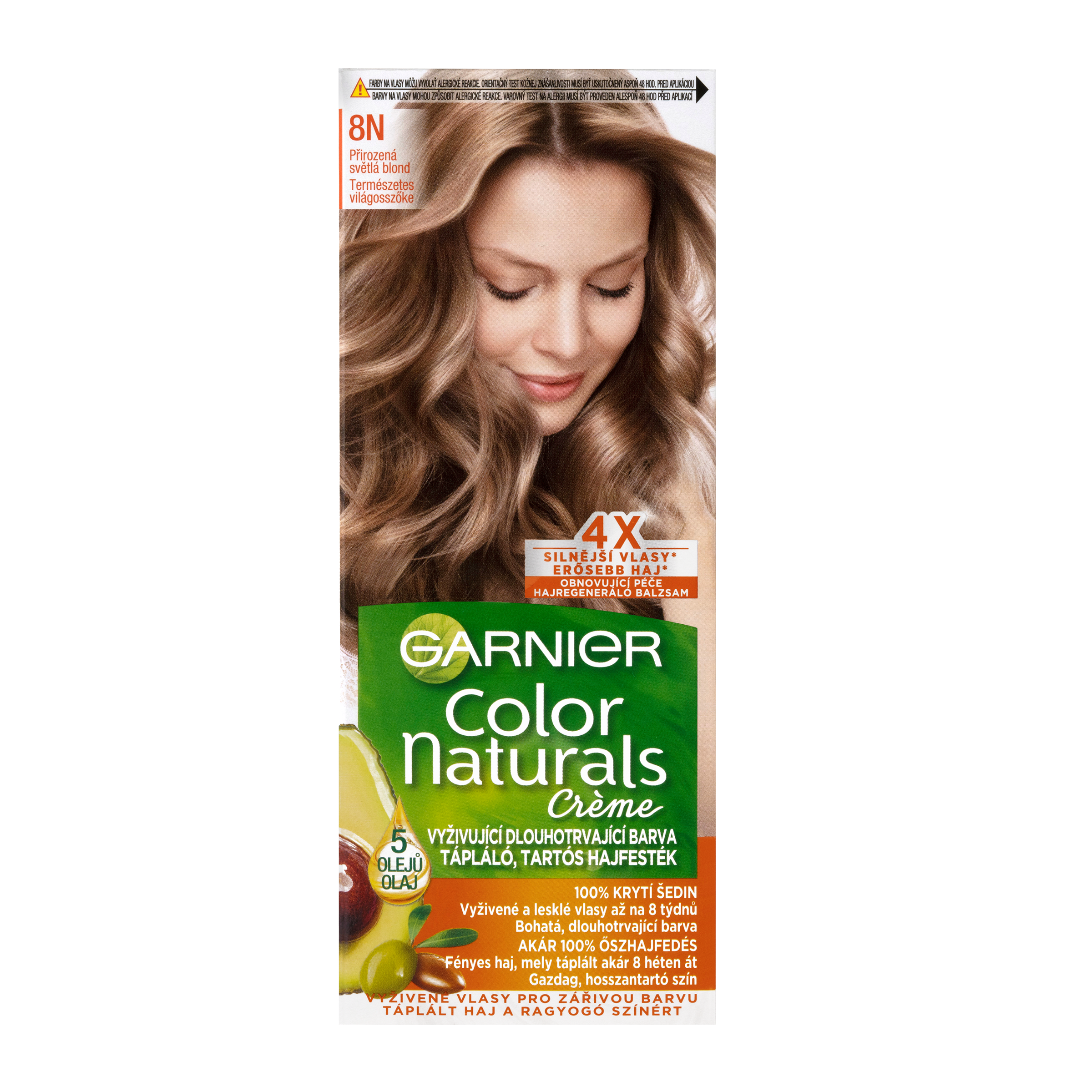 Barva na vlasy Garnier Color Naturals je vyživující permanentní barvou od Garnier. Díky složení vyživující péče obohacené o 5 olejů – olivy, avokádo, karité, kokos a argan budou vaše vlase lesklejší a hebčí. Péče intenzivně vyživuje vlasy, uhlazuje povrch vlasového vlákna a vytváří ochrannou vrstvu. Technologie „Color boost“ pro sytější a déle trvající barvu proniká do vlasových vláken a vyplňuje je sytou bohatou barvou. Díky závěrečné péči s 5 oleji je barva bohatá a dlouhotrvající. Výsledkem jsou 5x silnější vlasy, 100% krytí šedin a ochrana vlasů před vysušováním až na 8 týdnů, (*Instrumentální test). Zesvětlující barvy dokáží přirozeně odbarvit vlasy až o 4 odstíny. Studené pigmenty obsažené ve vybraných studených odstínech eliminují nežádoucí oranžové a žluté odlesky.