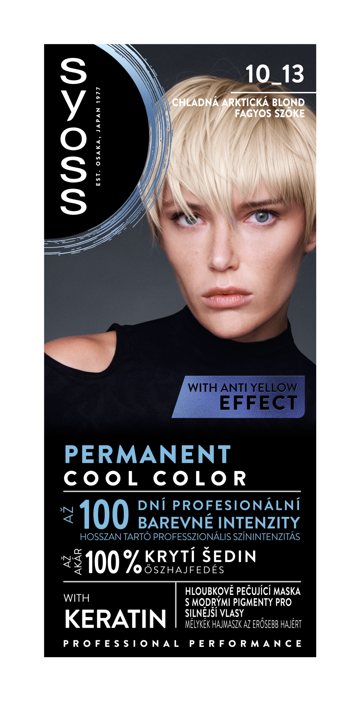 Permanentní barva na vlasy s efektem proti žlutým tónům a s až 100% krytím šedin. Permanentní barvy na vlasy Syoss, s více než 45letou historií, jsou navrženy pro profesionální výkon. Díky této chladné barvě na vlasy budou vaše vlasy dlouhodobě působit plné života díky neutralizační síle barevných pigmentů. Barvicí krém s chladnými barevnými odlesky a keratinem proniká hluboko do vlasového vlákna, neutralizuje nežádoucí žluté tóny a odhaluje chladné odstíny s až 100 dny profesionální barevné intenzity a až 100% krytím šedin. Součástí balení je také hloubkově pečující modrá maska obohacená o keratin, která hloubkově posiluje vlasy zevnitř, zatímco její modré pigmenty odstraňují teplé tóny pro ledové odlesky. Tato arktická blond barva na vlasy se doporučuje pro světle blond až středně blond vlasy.