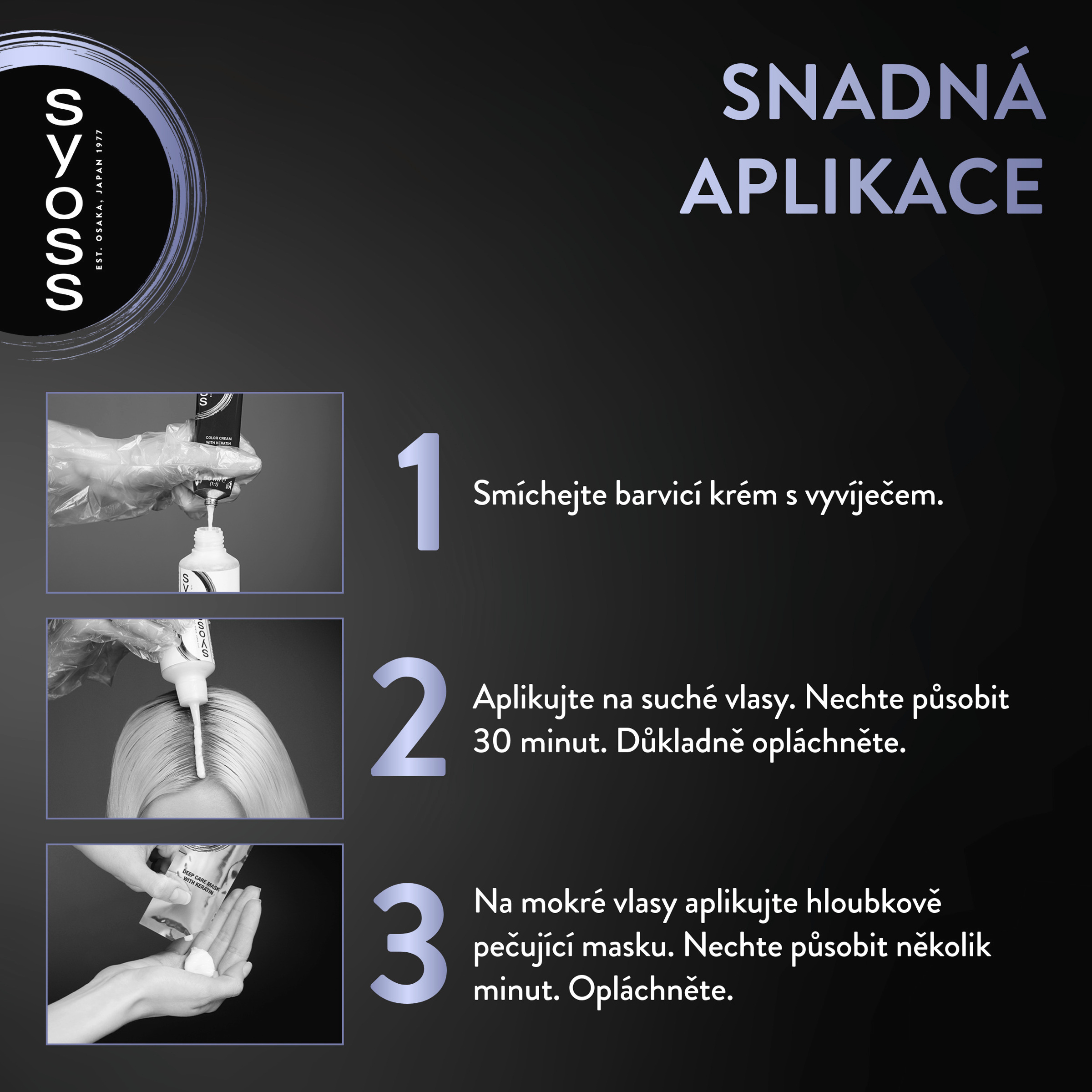 Pro krátké až středně dlouhé vlasy použijte 1 balení. Pro středně dlouhé až dlouhé vlasy použijte 2 balení. Pro optimální péči o vlasy doporučujeme Syoss Intense Color hloubkově pečující šampon a hloubkový kondicionér.