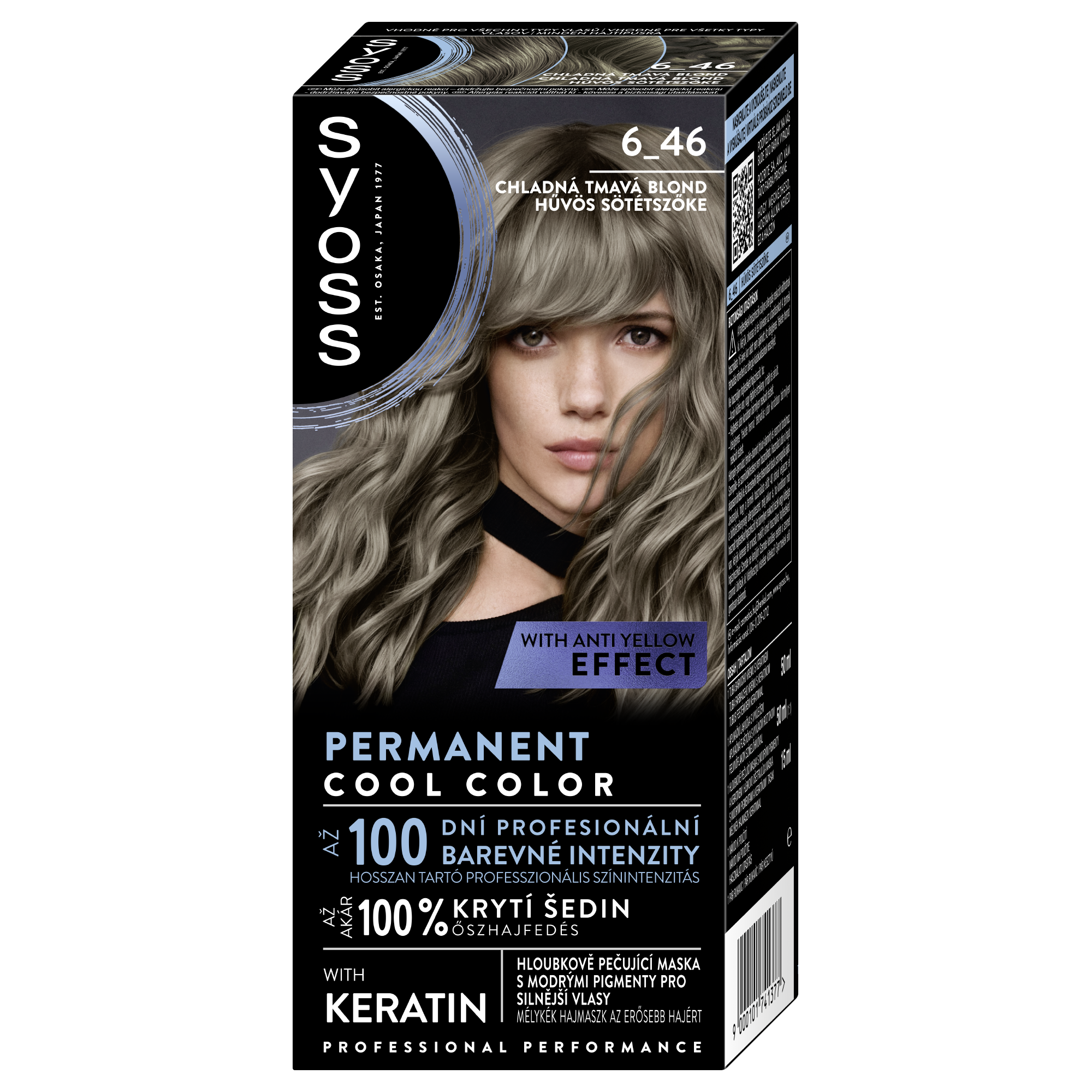 Permanentní barvy na vlasy Syoss, s více než 45letou historií jsou navrženy pro profesionální výkon. Díky této chladné barvě na vlasy budou vaše vlasy dlouhodobě působit plné života díky neutralizační síle barevných pigmentů. Barvicí krém s chladnými barevnými odlesky a keratinem proniká hluboko do vlasového vlákna, neutralizuje nežádoucí žluté tóny a odhaluje chladné odstíny s až 100 dny profesionální barevné intenzity a až 100% krytím šedin. Součástí balení je také hloubkově pečující modrá maska obohacená o keratin, která hloubkově posiluje vlasy zevnitř, zatímco její modré pigmenty odstraňují teplé tóny pro ledové odlesky. Tato chladná tmavá blond barva na vlasy se doporučuje pro středně blond až tmavě blond vlasy.