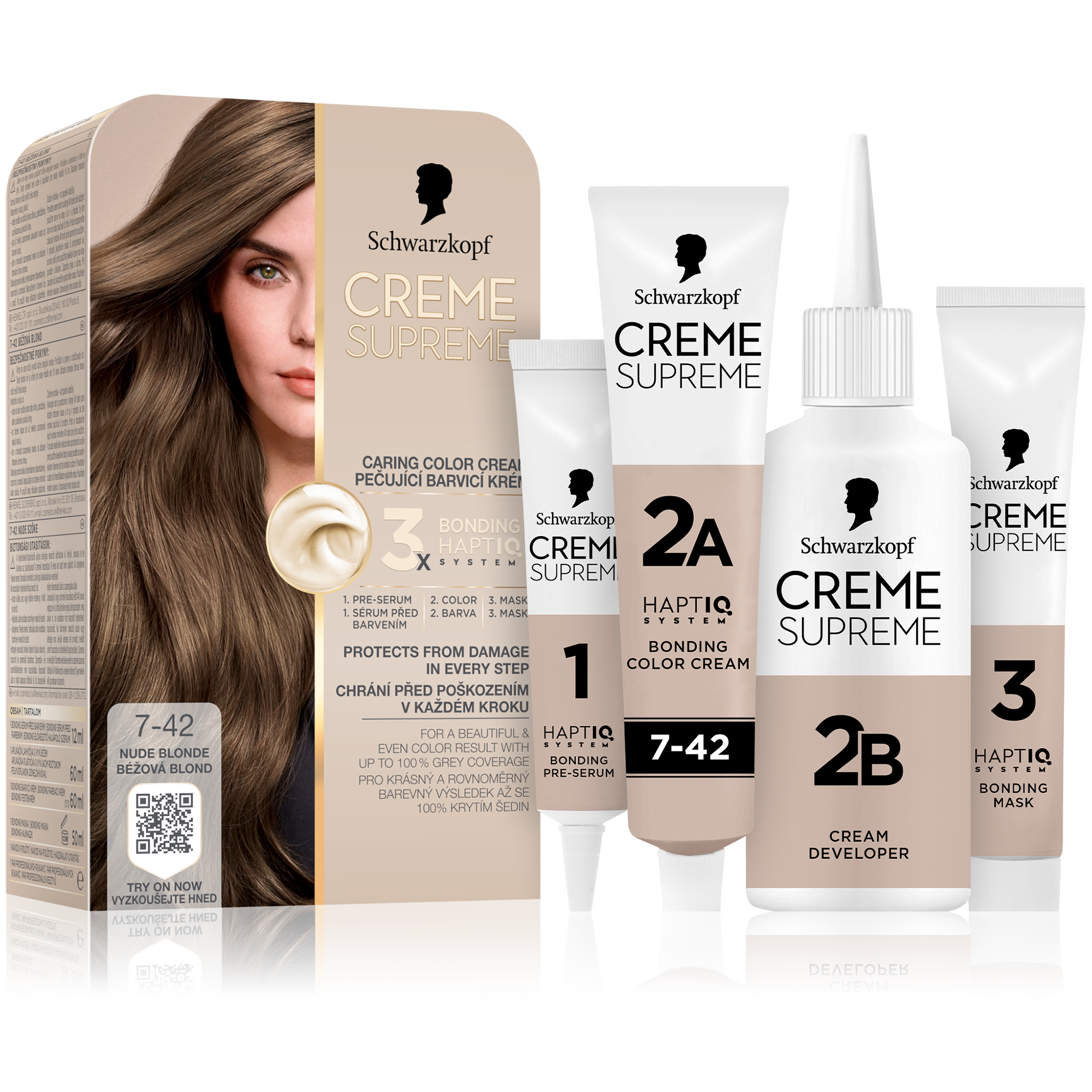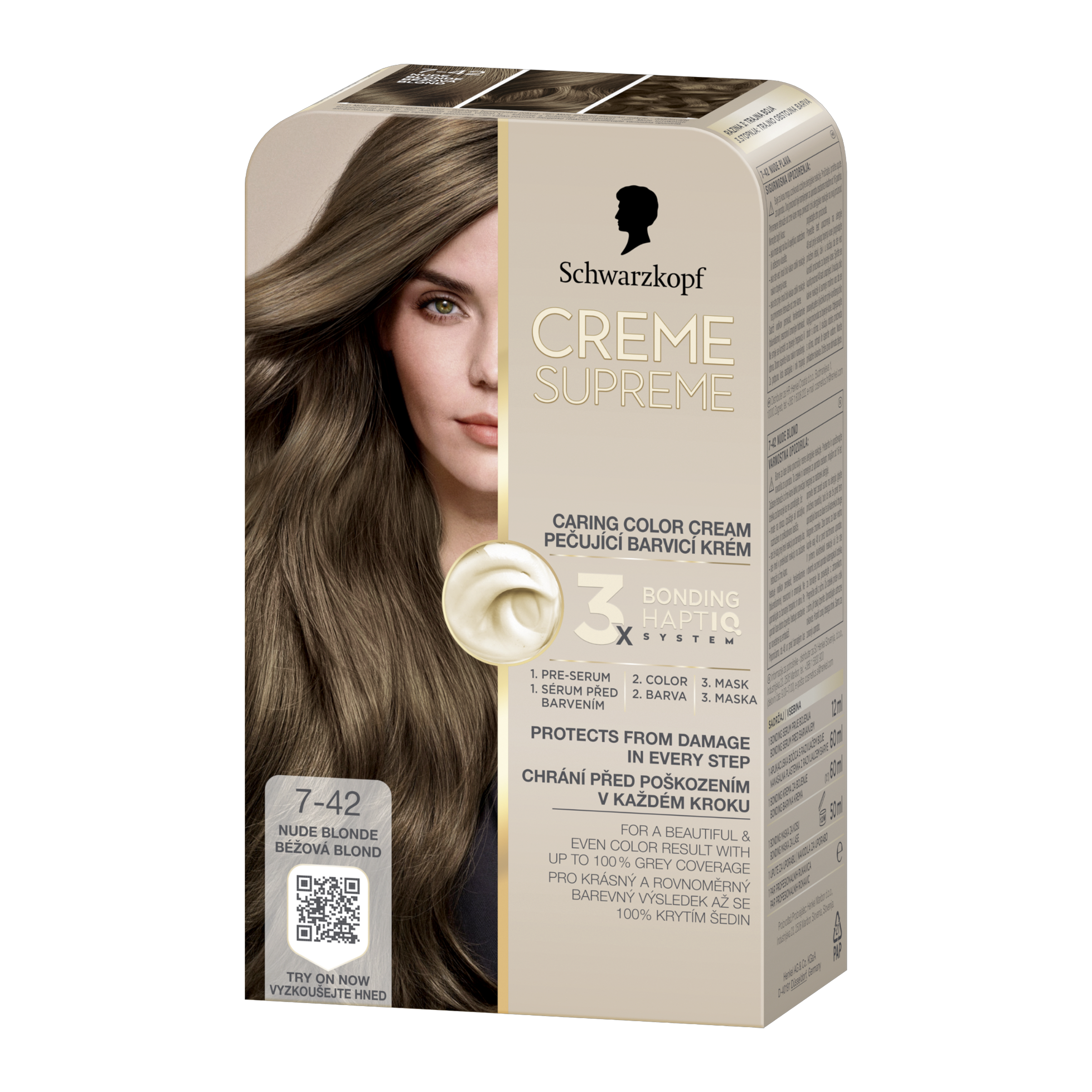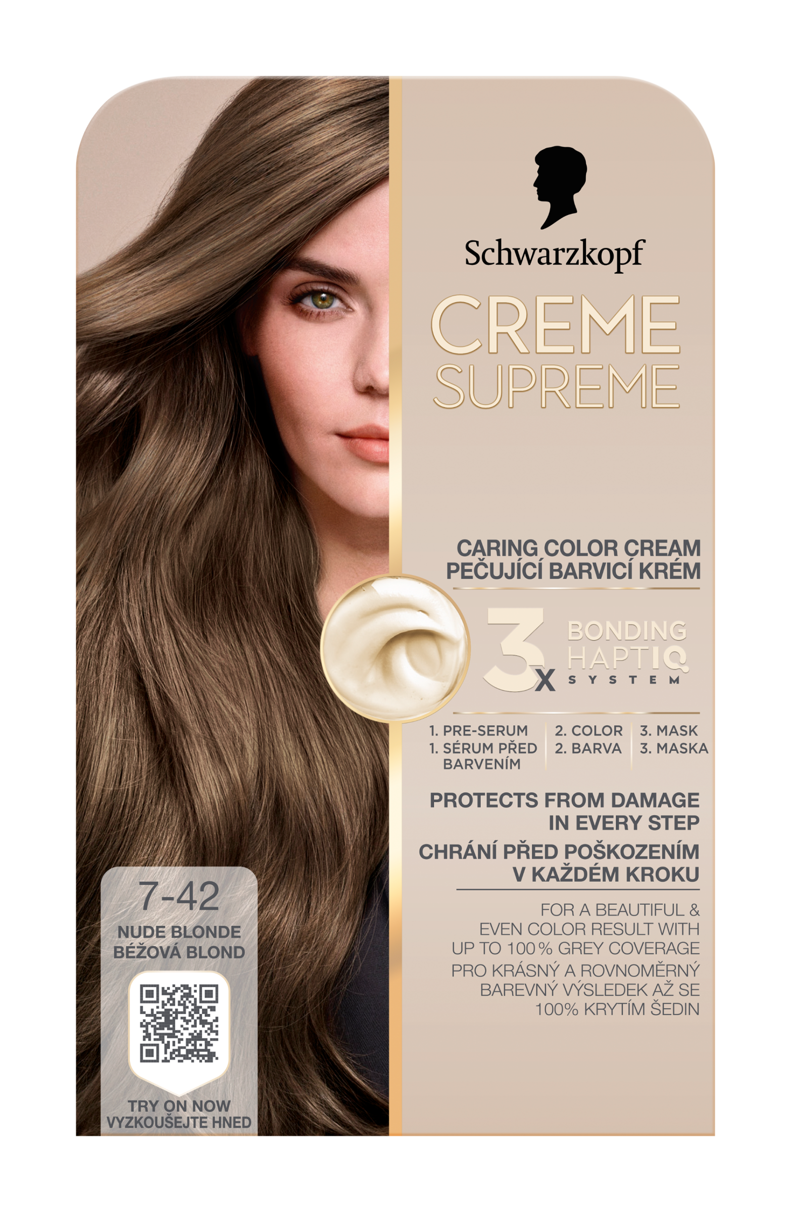 Schwarzkopf Creme Supreme 7-42 Béžová blond - Vysněná barva na vlasy s péčí, kterou si zasloužíte. Tato pečující barva na vlasy od Schwarzkopf s technologií 3x Bonding HaptIQ System poskytuje intenzivní ochranu a péči, díky čemuž zajišťuje krásný a jednotný barevný výsledek s až 100% krytím šedin. Jak to celé funguje? Bonding sérum před barvením: Toto intenzivně pečující sérum vlasy dokonale připraví na celý proces barvení. Díky inovativní technologii vytváří mikrovazby a posiluje vlasy pro jejich rovnoměrné obarvení. Bonding barvicí krém: Poskytuje vlasům ochranu, aby nedošlo k jejich poškození během barvení. Bonding maska: Obaluje vlasy ochrannou vrstvou a vytváří nové mikrovazby pro hloubkovou péči.