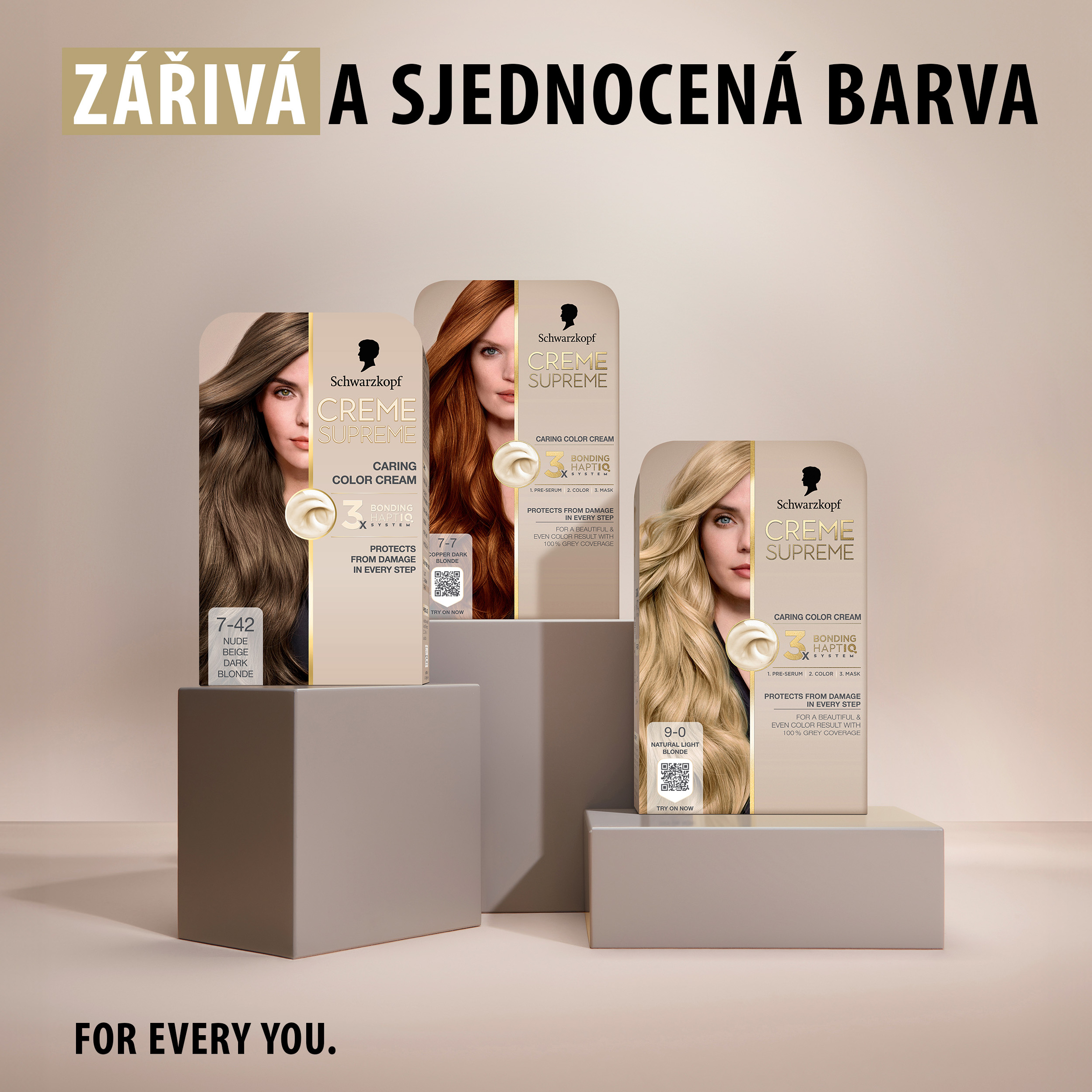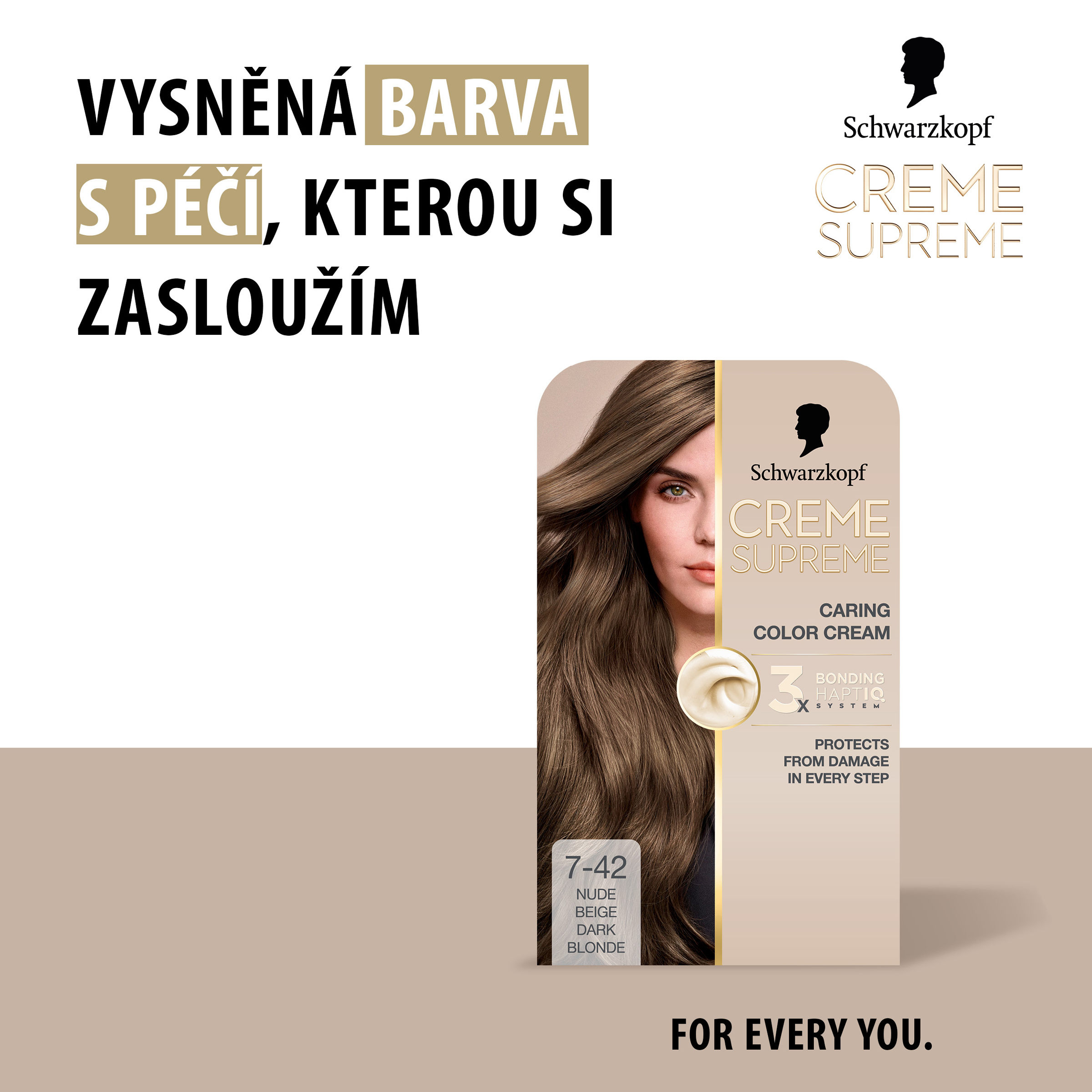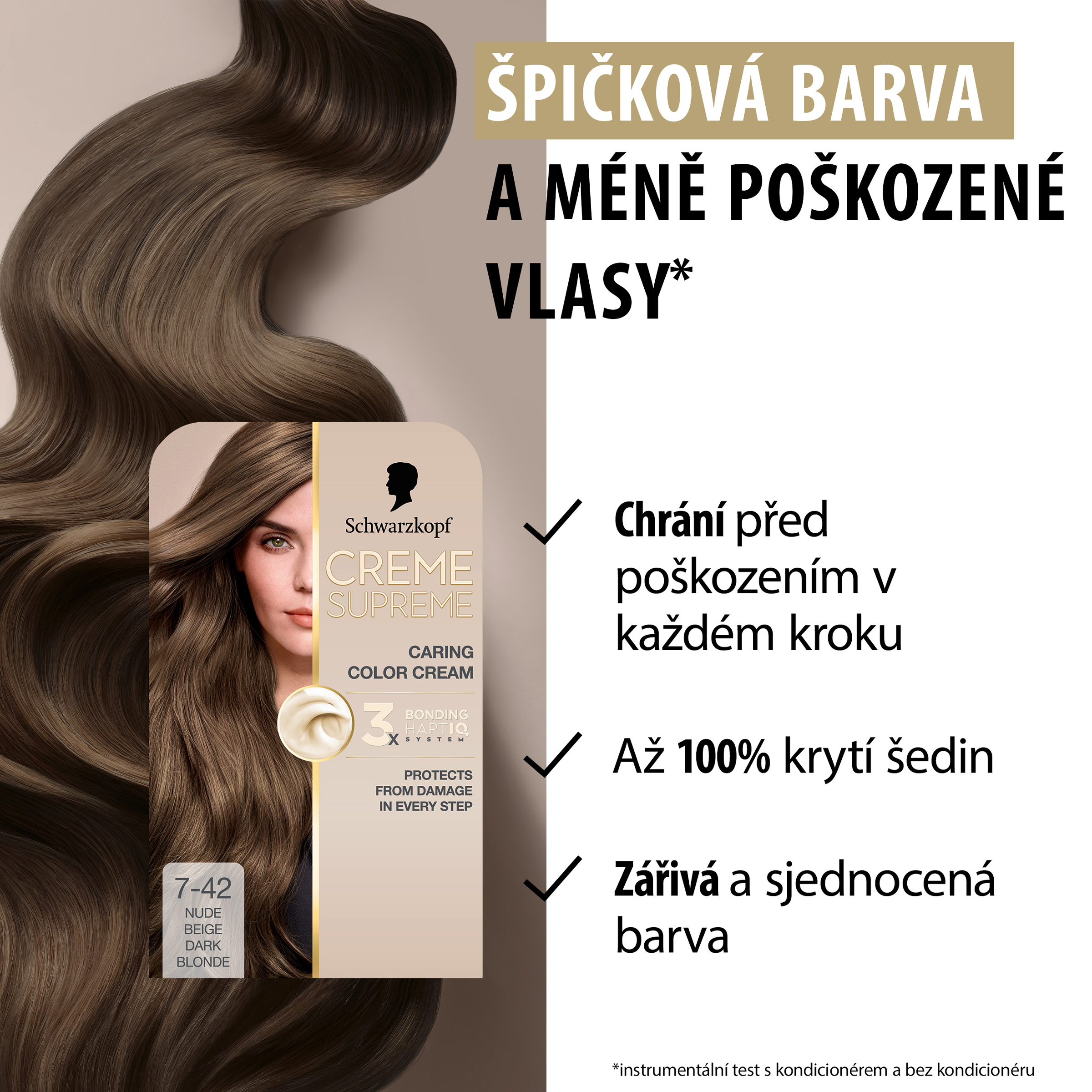 Schwarzkopf Creme Supreme 7-42 Béžová blond - Vysněná barva na vlasy s péčí, kterou si zasloužíte. Tato pečující barva na vlasy od Schwarzkopf s technologií 3x Bonding HaptIQ System poskytuje intenzivní ochranu a péči, díky čemuž zajišťuje krásný a jednotný barevný výsledek s až 100% krytím šedin. Jak to celé funguje? Bonding sérum před barvením: Toto intenzivně pečující sérum vlasy dokonale připraví na celý proces barvení. Díky inovativní technologii vytváří mikrovazby a posiluje vlasy pro jejich rovnoměrné obarvení. Bonding barvicí krém: Poskytuje vlasům ochranu, aby nedošlo k jejich poškození během barvení. Bonding maska: Obaluje vlasy ochrannou vrstvou a vytváří nové mikrovazby pro hloubkovou péči.