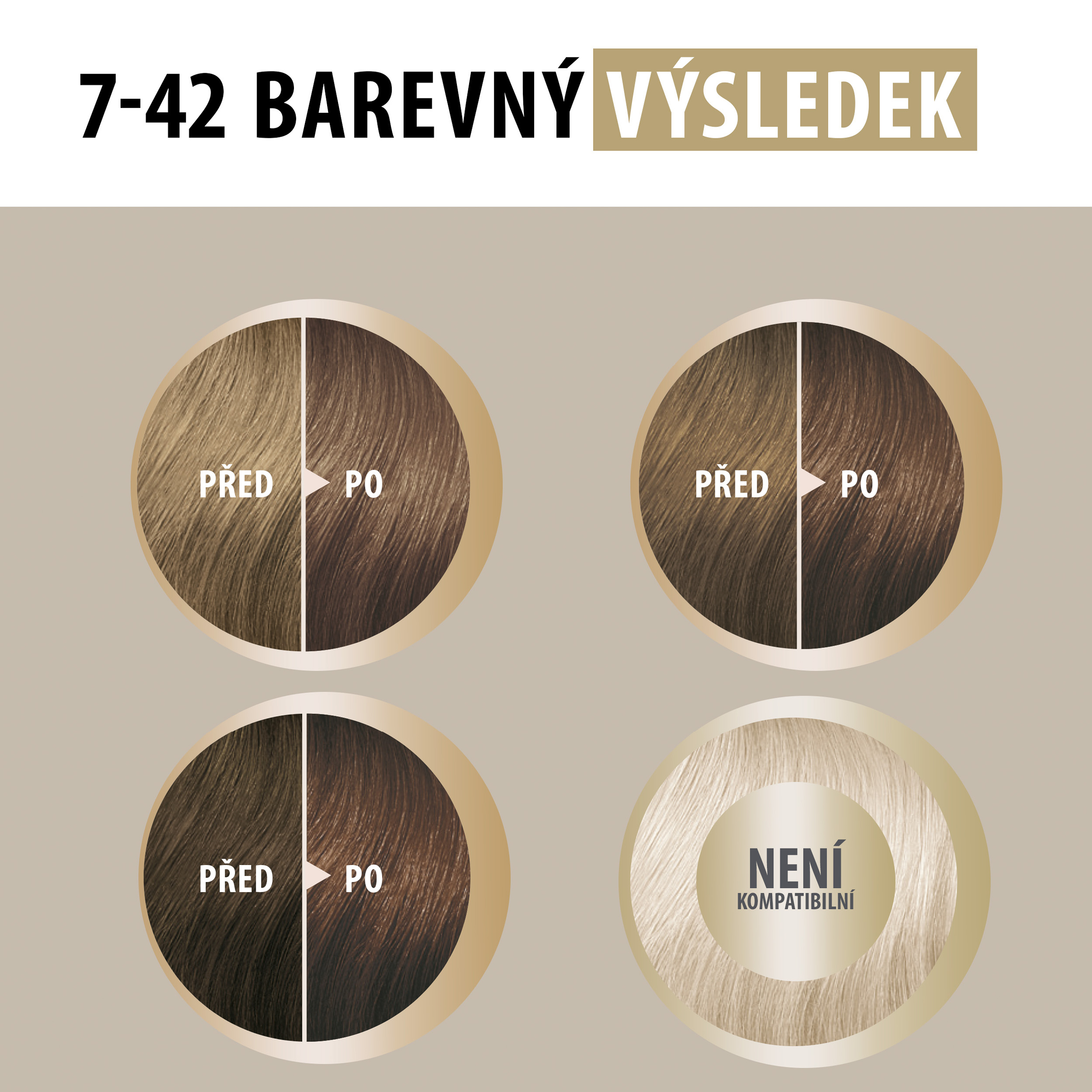 KROK 3 – OPLÁCHNUTÍ A NÁSLEDNÁ PÉČE Po uplynutí doby působení si znovu nasaďte rukavice. Na závěr aplikace přidejte do vlasů teplou vodu a vytvořte pěnu. Poté důkladně oplachujte, dokud voda nebude čirá. Do ručníkem vysušených vlasů (mimo kořínky) naneste Bonding masku (3). Nechte působit 5 minut a poté důkladně opláchněte. Vaše vlasy budou snadno rozčesatelné, hebké a lesklé. Masku si ponechte pro další použití, vystačí až na 4 aplikace pro snadno rozčesatelné, jemné vlasy. Barvy na vlasy mohou způsobit těžké alergické reakce. Přečtěte si instrukce a řiďte se jimi. Tento výrobek není určen k používání pro osoby mladší 16 let. Dočasné tetování černou hennou může zvýšit riziko alergie. Nebarvěte si vlasy, pokud: — máte vyrážku na obličeji nebo citlivou, podrážděnou a poškozenou pokožku hlavy, — jste již někdy zaznamenali jakoukoliv reakci po barvení vlasů, — jste v minulosti zaznamenali reakci na dočasné tetování černou hennou. Obsahuje peroxid vodíku, fenylendiaminy (toluenediaminy), resorcinol a amoniak. Nepoužívejte k barvení řas nebo obočí. Po aplikaci vlasy důkladně opláchněte. Složení: viz krabička. Proveďte varovný test na alergii 48 hodin před každým použitím výrobku (viz příbalový leták), a to i v případě, že jste barvy na vlasy používali již dříve. Proto si produkt nezapomeňte zakoupit s předstihem 48 hodin. V případě jakékoliv reakce nebo pochybností se před použitím jakékoliv barvy na vlasy poraďte s lékařem. Řiďte se pokyny a bezpečnostními instrukcemi v přiloženém letáku. Zamezte kontaktu s očima. Při zasažení je ihned vypláchněte. Používejte vhodné ochranné rukavice. Uchovávejte mimo dosah dětí.