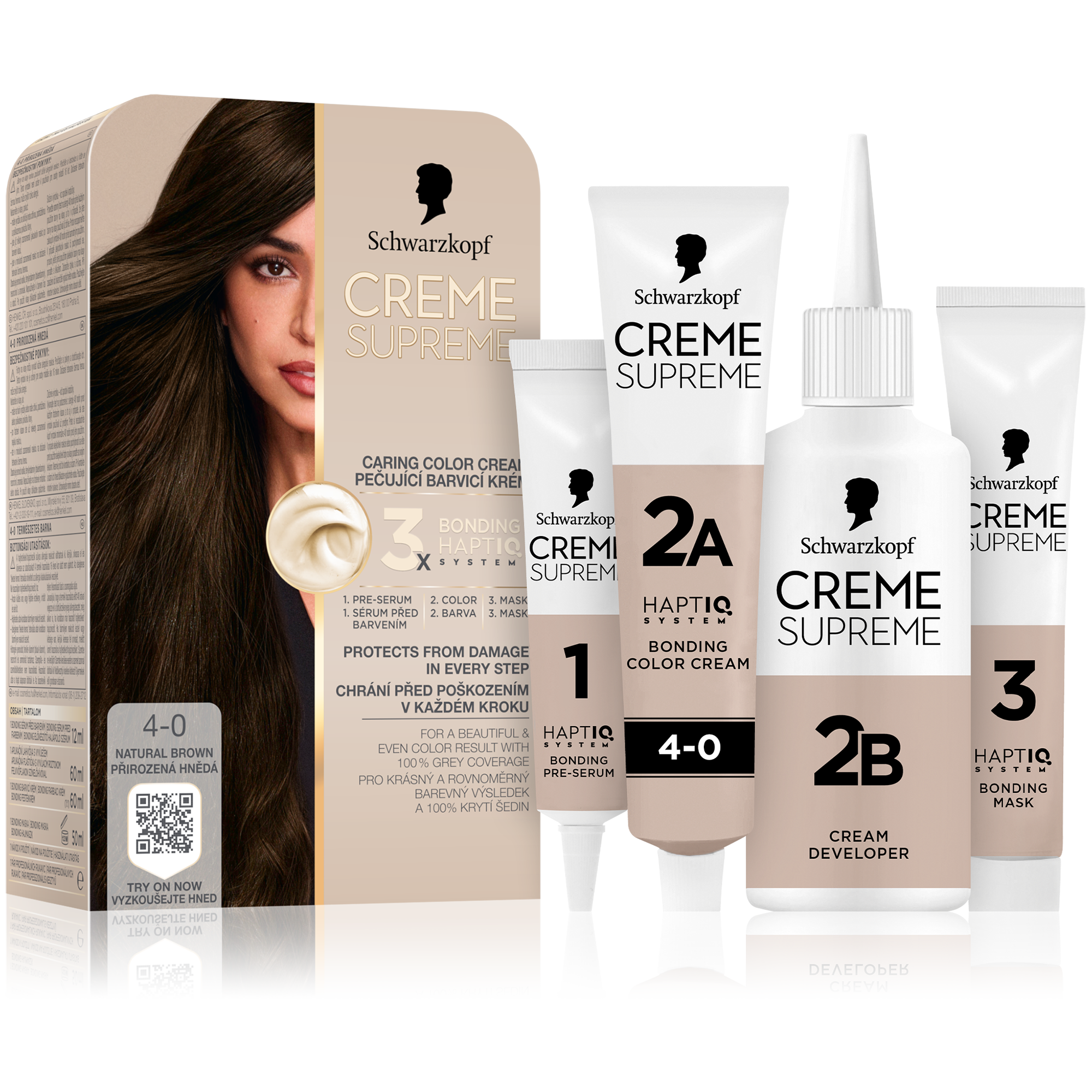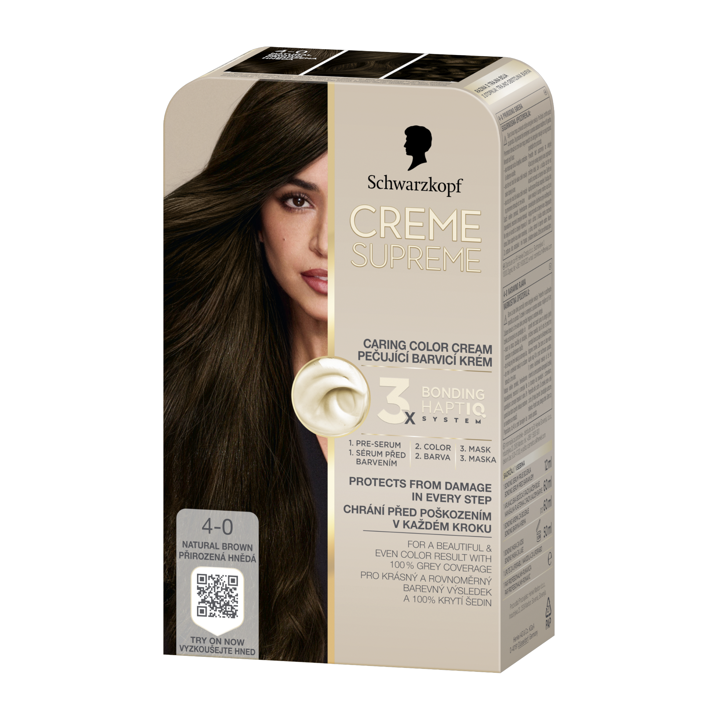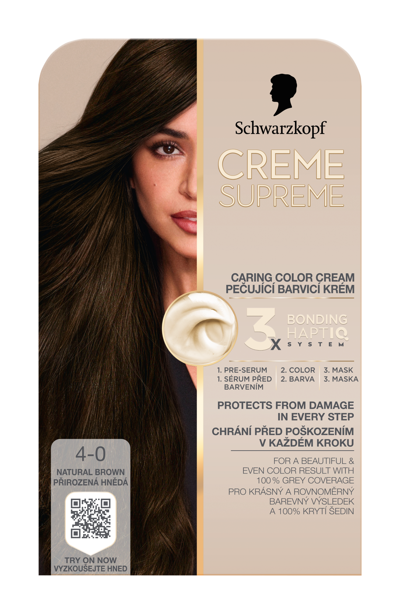 Schwarzkopf Creme Supreme 4-0 Přirozená hnědá - Vysněná barva na vlasy s péčí, kterou si zasloužíte Tato pečující barva na vlasy od Schwarzkopf s technologií 3x Bonding HaptIQ System poskytuje intenzivní ochranu a péči, díky čemuž zajišťuje krásný a jednotný barevný výsledek se 100% krytím šedin. Jak to celé funguje? Bonding sérum před barvením: Toto intenzivně pečující sérum vlasy dokonale připraví na celý proces barvení. Díky inovativní technologii vytváří mikrovazby a posiluje vlasy pro jejich rovnoměrné obarvení. Bonding barvicí krém: Poskytuje vlasům ochranu, aby nedošlo k jejich poškození během barvení. Bonding maska: Obaluje vlasy ochrannou vrstvou a vytváří nové mikrovazby pro hloubkovou péči. Certifikace PETA* *Globální politika netestování na zvířatech.