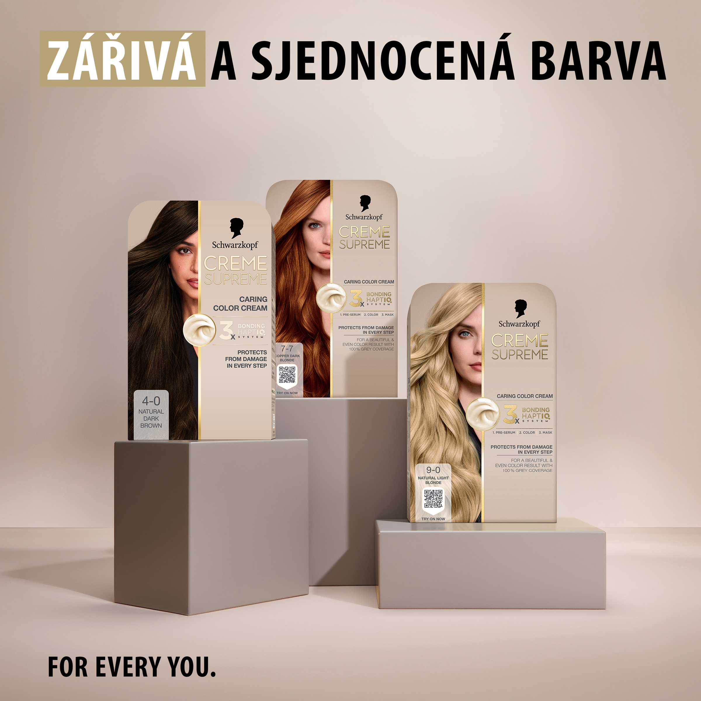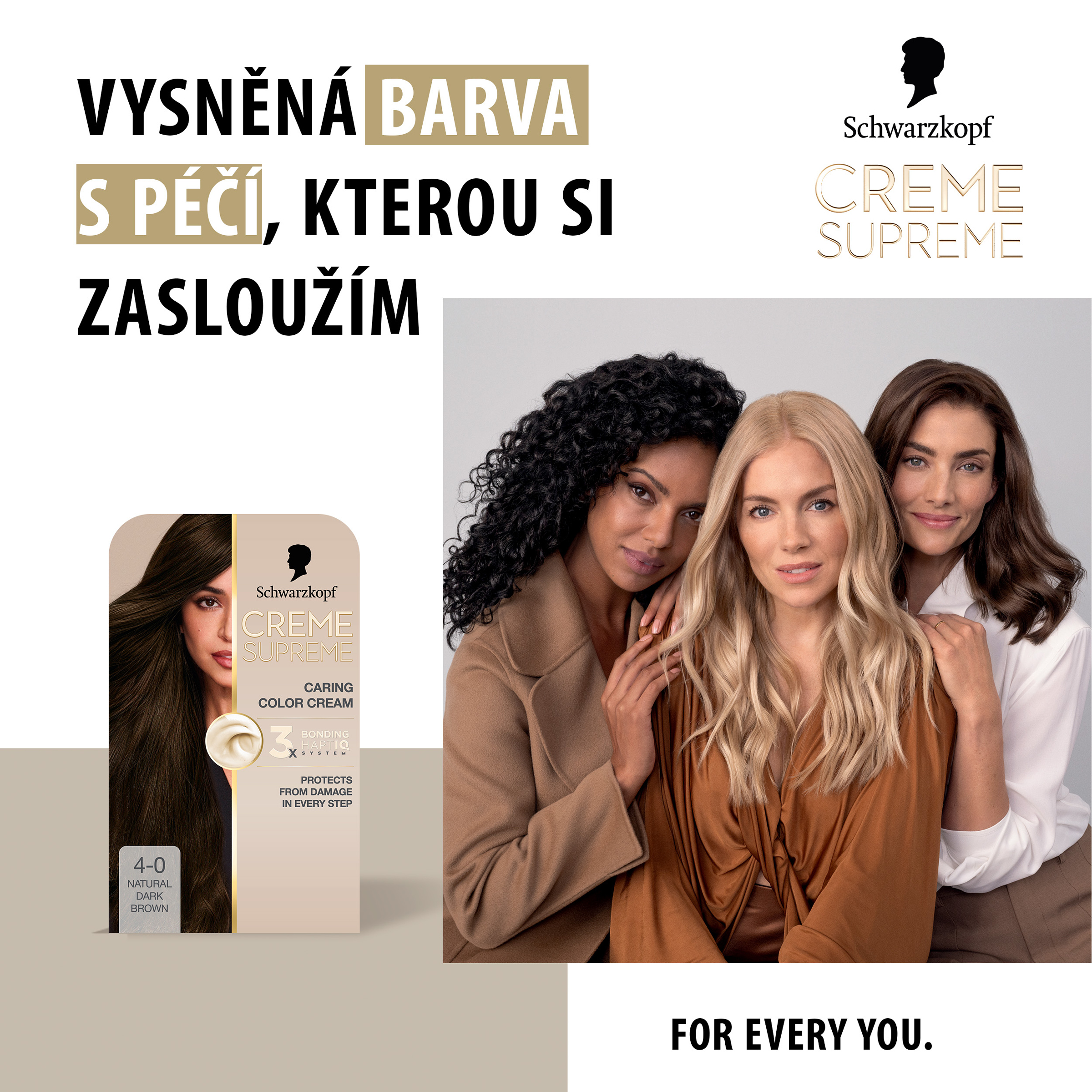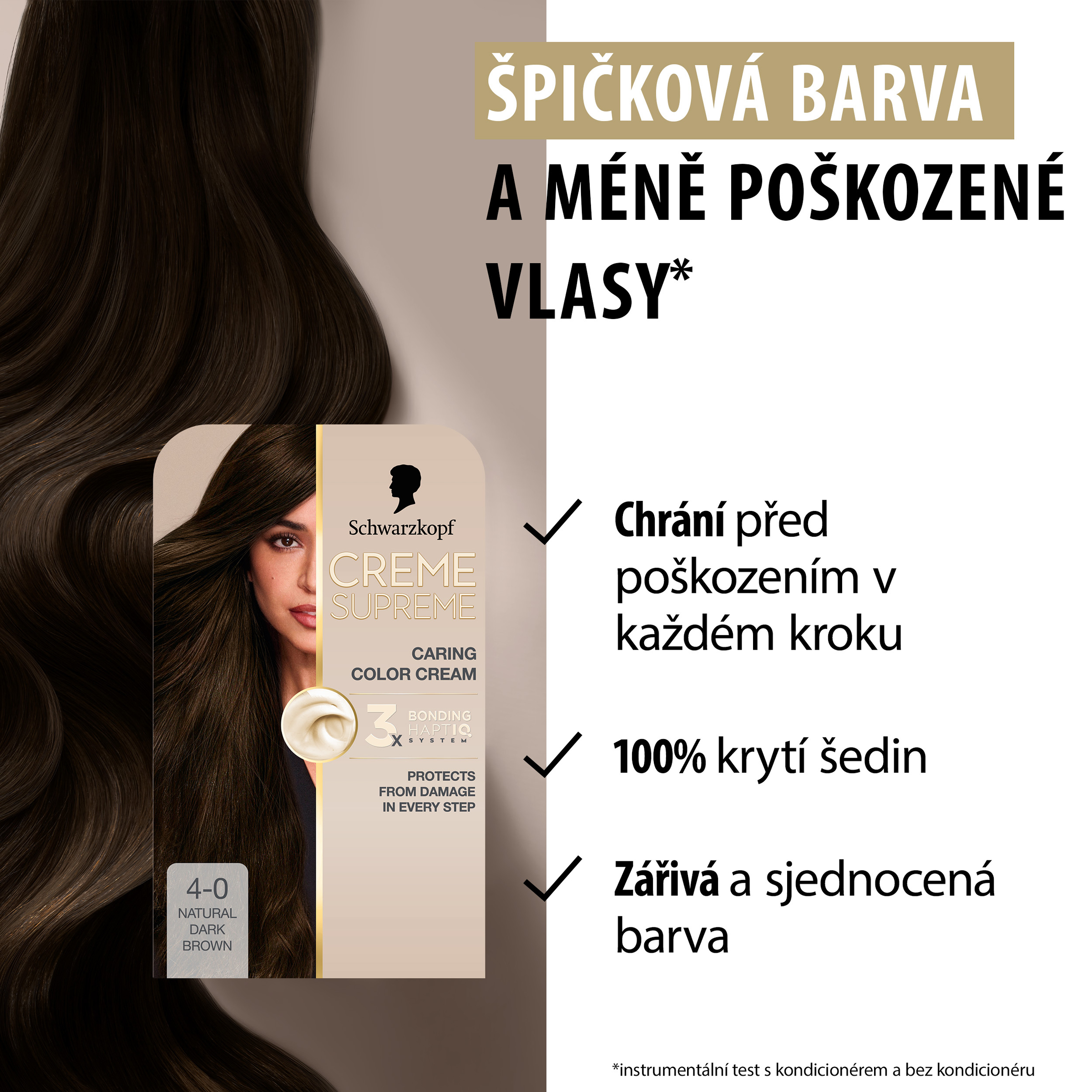 Schwarzkopf Creme Supreme 4-0 Přirozená hnědá - Vysněná barva na vlasy s péčí, kterou si zasloužíte Tato pečující barva na vlasy od Schwarzkopf s technologií 3x Bonding HaptIQ System poskytuje intenzivní ochranu a péči, díky čemuž zajišťuje krásný a jednotný barevný výsledek se 100% krytím šedin. Jak to celé funguje? Bonding sérum před barvením: Toto intenzivně pečující sérum vlasy dokonale připraví na celý proces barvení. Díky inovativní technologii vytváří mikrovazby a posiluje vlasy pro jejich rovnoměrné obarvení. Bonding barvicí krém: Poskytuje vlasům ochranu, aby nedošlo k jejich poškození během barvení. Bonding maska: Obaluje vlasy ochrannou vrstvou a vytváří nové mikrovazby pro hloubkovou péči. Certifikace PETA* *Globální politika netestování na zvířatech.