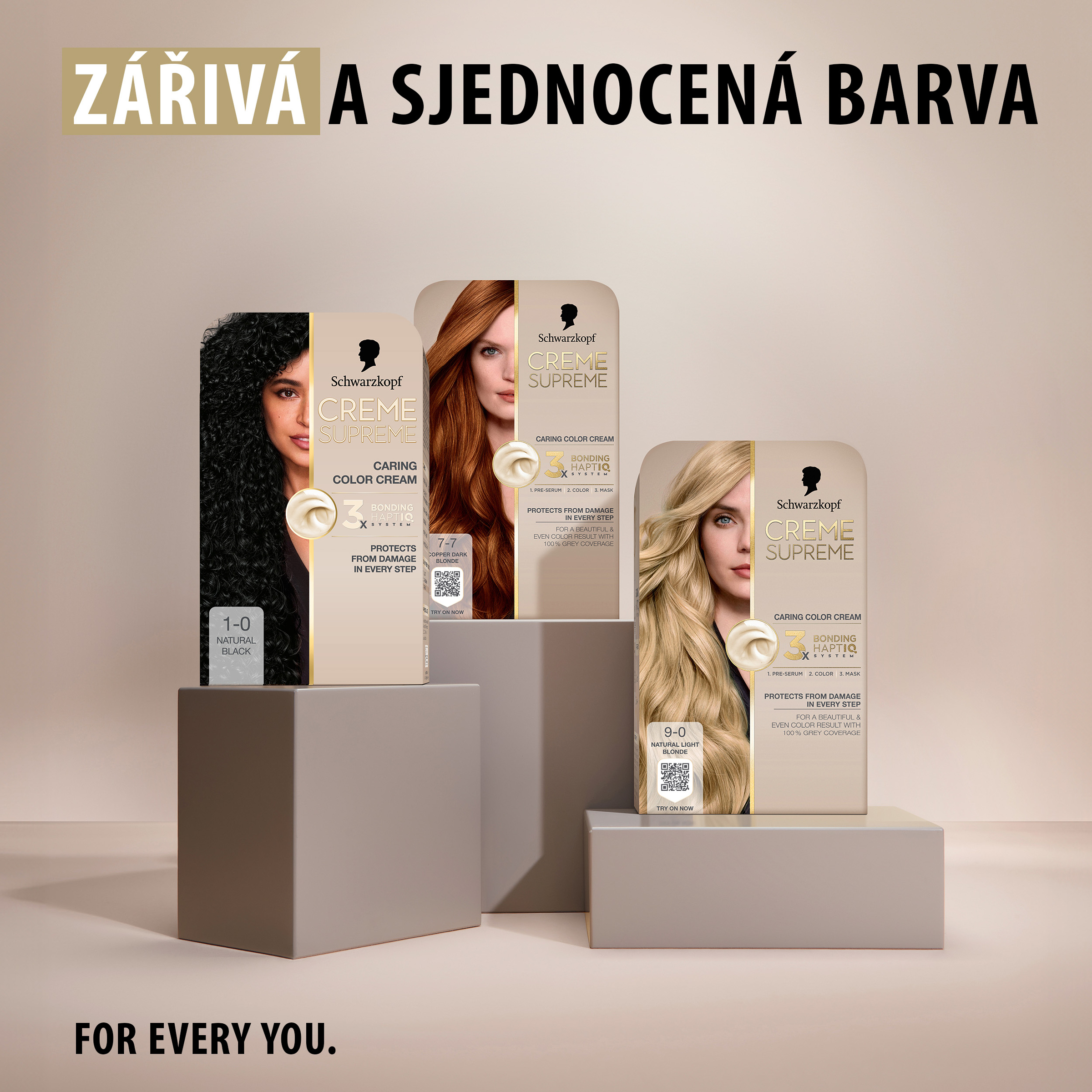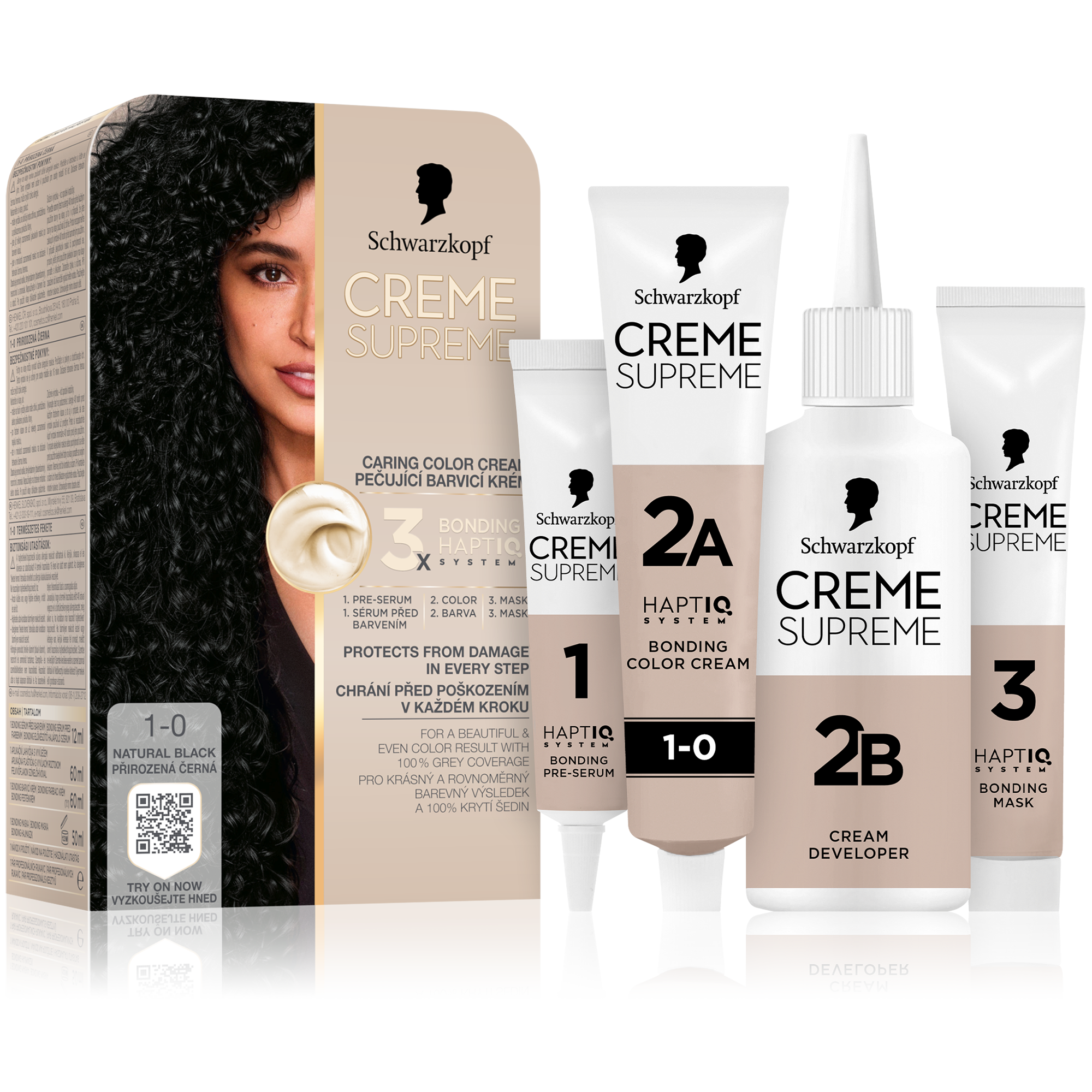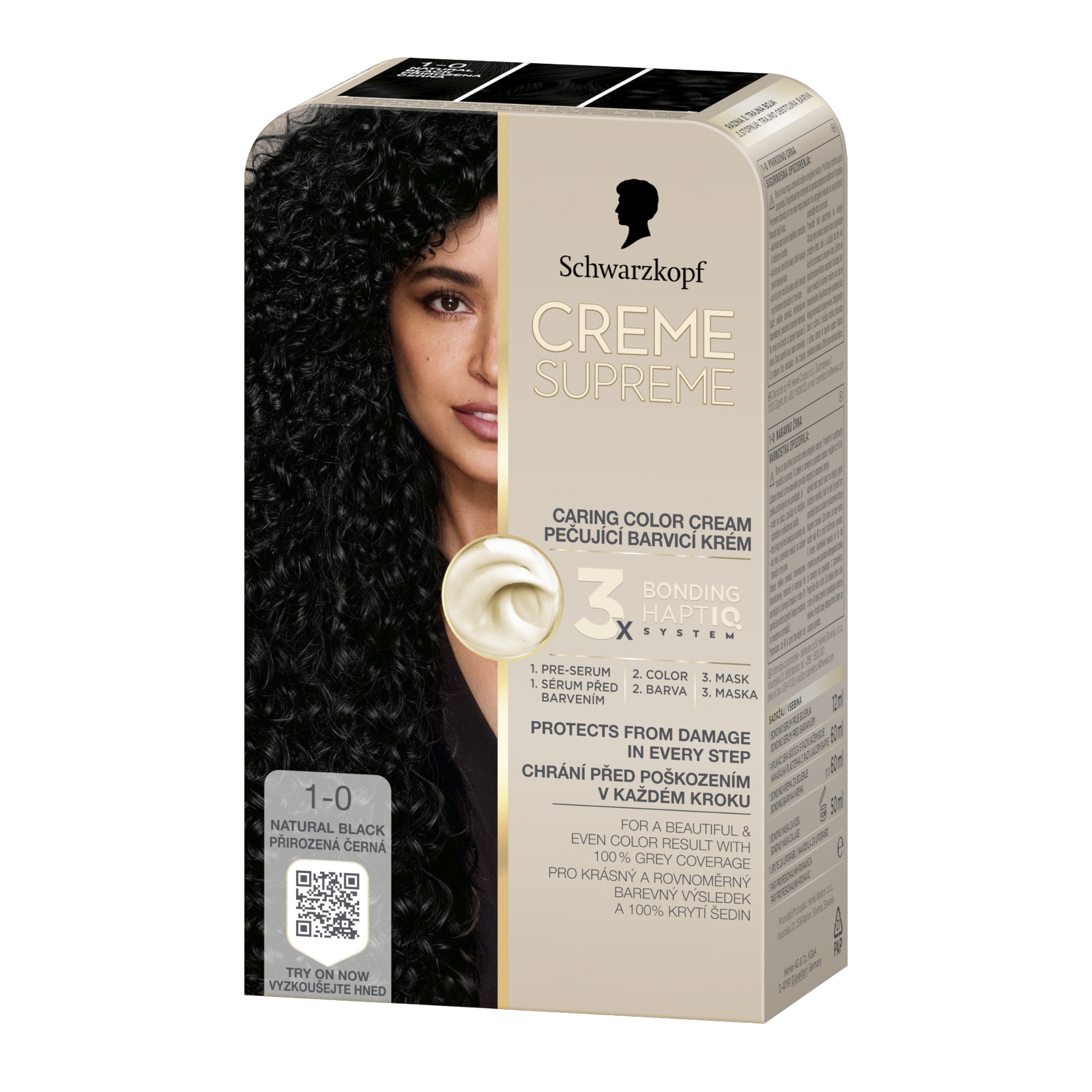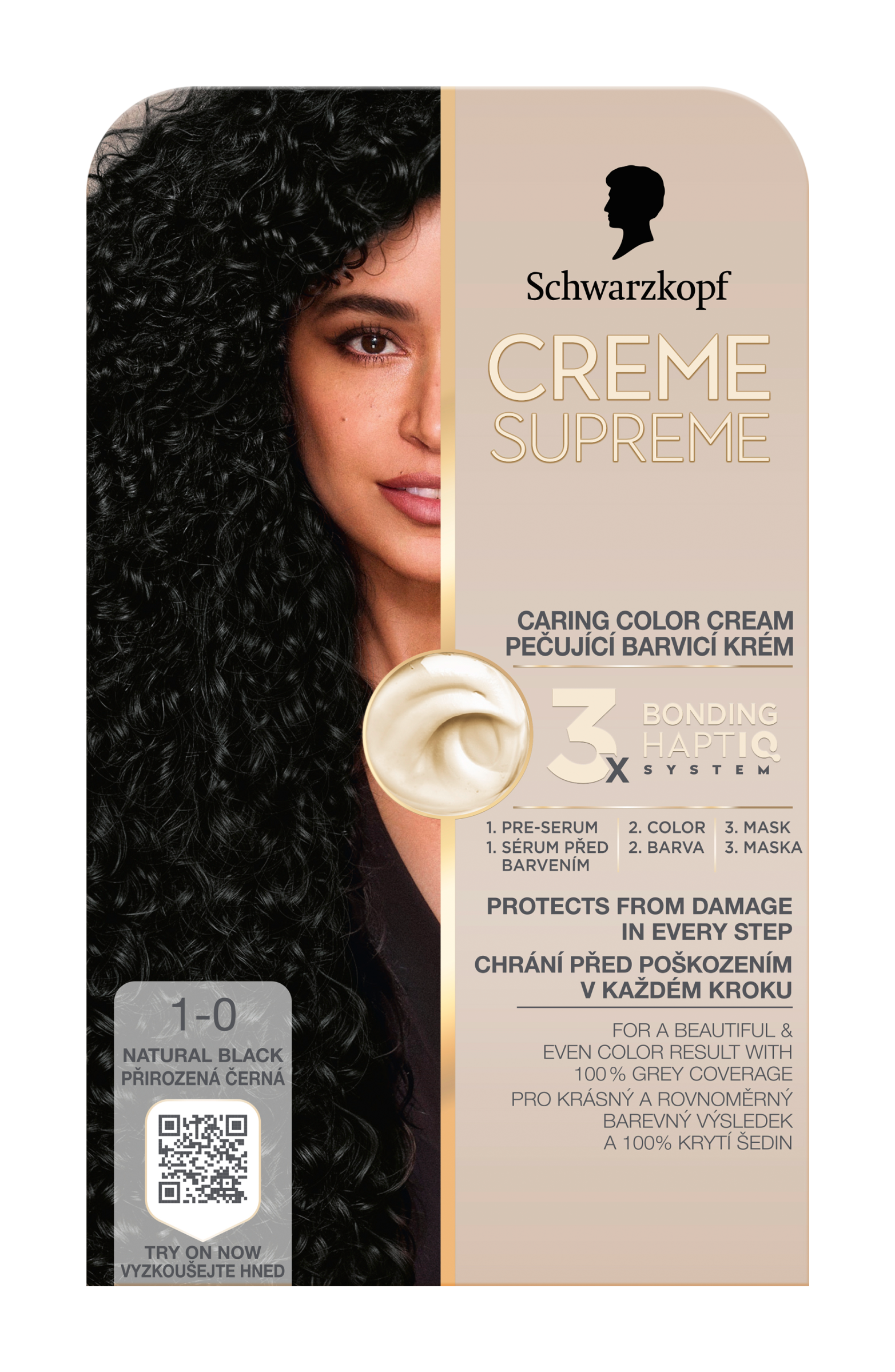 Schwarzkopf Creme Supreme 1-0 Přirozená černá - Vysněná barva na vlasy s péčí, kterou si zasloužíte. Tato pečující barva na vlasy od Schwarzkopf s technologií 3x Bonding HaptIQ System poskytuje intenzivní ochranu a péči, díky čemuž zajišťuje krásný a jednotný barevný výsledek se 100% krytím šedin. Jak to celé funguje? Bonding sérum před barvením: Toto intenzivně pečující sérum vlasy dokonale připraví na celý proces barvení. Díky inovativní technologii vytváří mikrovazby a posiluje vlasy pro jejich rovnoměrné obarvení. Bonding barvicí krém: Poskytuje vlasům ochranu, aby nedošlo k jejich poškození během barvení. Bonding maska: Obaluje vlasy ochrannou vrstvou a vytváří nové mikrovazby pro hloubkovou péči.