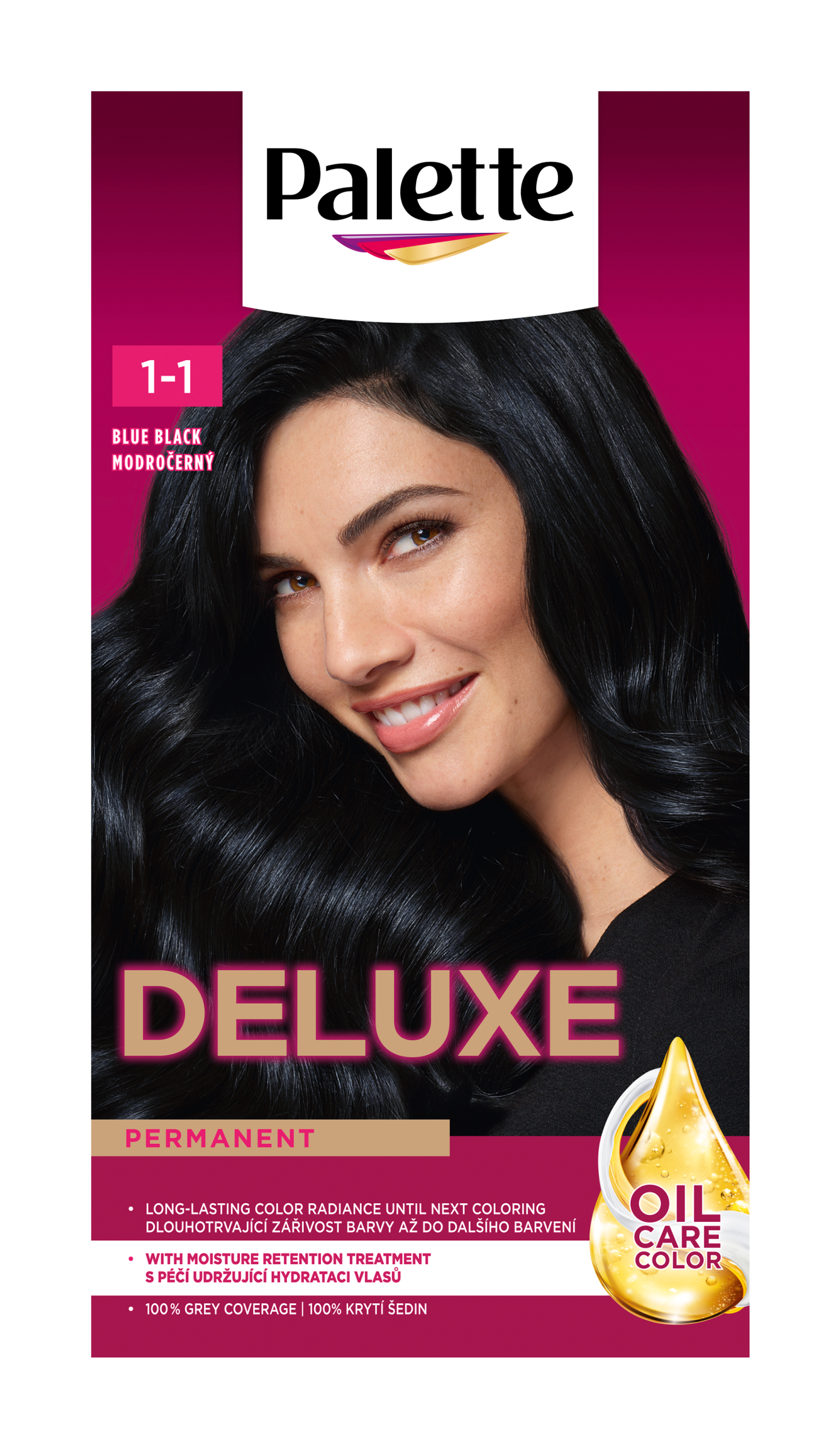Palette Deluxe Oil Care barva na vlasy 1-1 Modročerný - Radost z barev s Deluxe. Permanentní barva na vlasy se 100% krytím šedin Radujte se z barev s Palette Deluxe Oil Care: Bohaté složení Oil-in-creme s vysoce koncentrovanými pigmenty proniká do vlasů pro 100% krytí šedin a poskytuje dlouhotrvající zářivost barvy až do dalšího barvení. Speciálně vyvinutá péče, která udržuje hydrataci vlasů, přináší pocit hloubkové hydratace a hedvábně hladkých a zdravě vypadajících vlasů. Složení bez silikonů také zlepšuje hebkost vlasů, usnadňuje jejich rozčesávání a dodává jim neodolatelný lesk. Složení Palette Deluxe je až z 93 % přírodního původu*. Krabička má certifikaci FSC. Hliníková tuba a příbalový leták jsou recyklované. Společně vytváříme krásné okamžiky pro barevný a udržitelný svět.