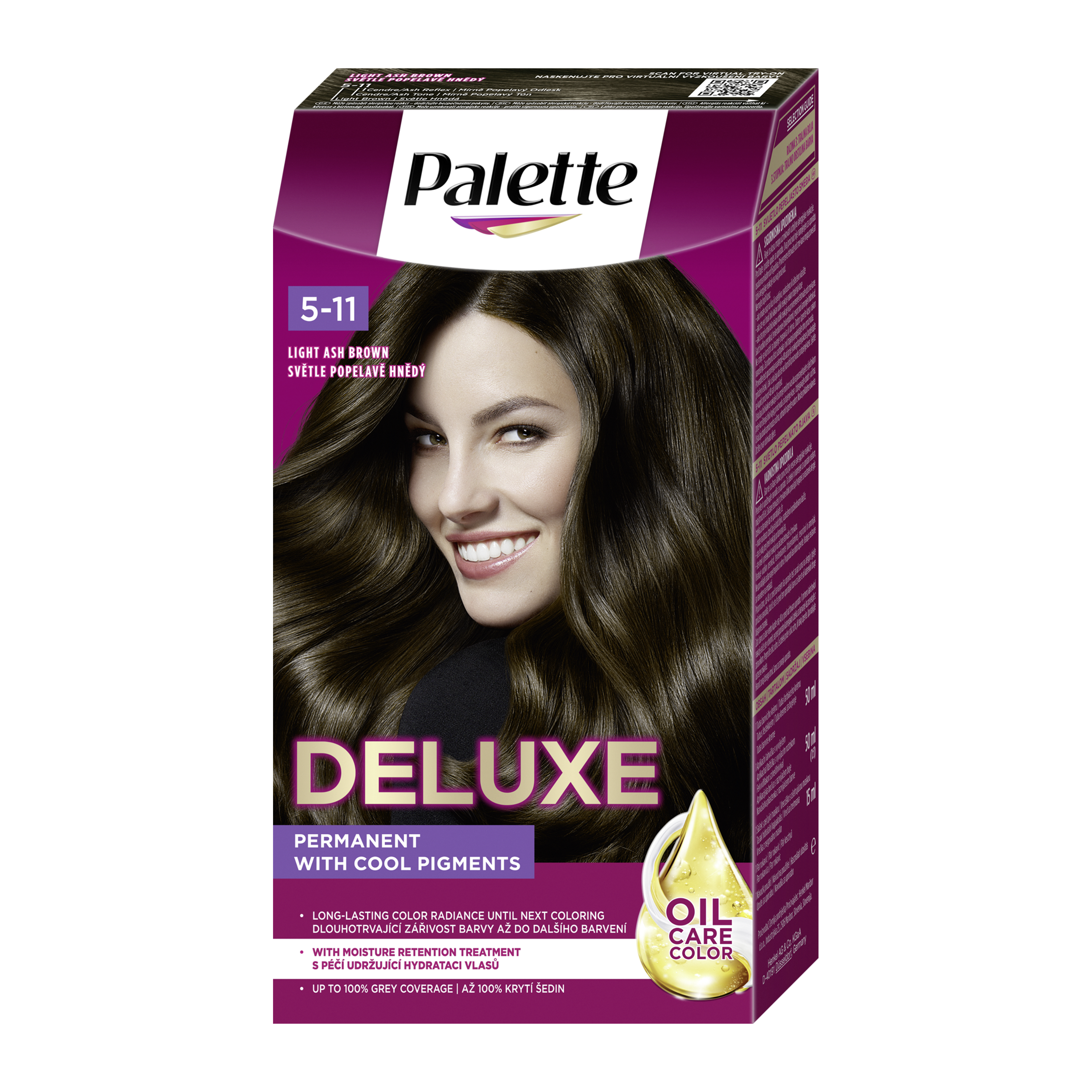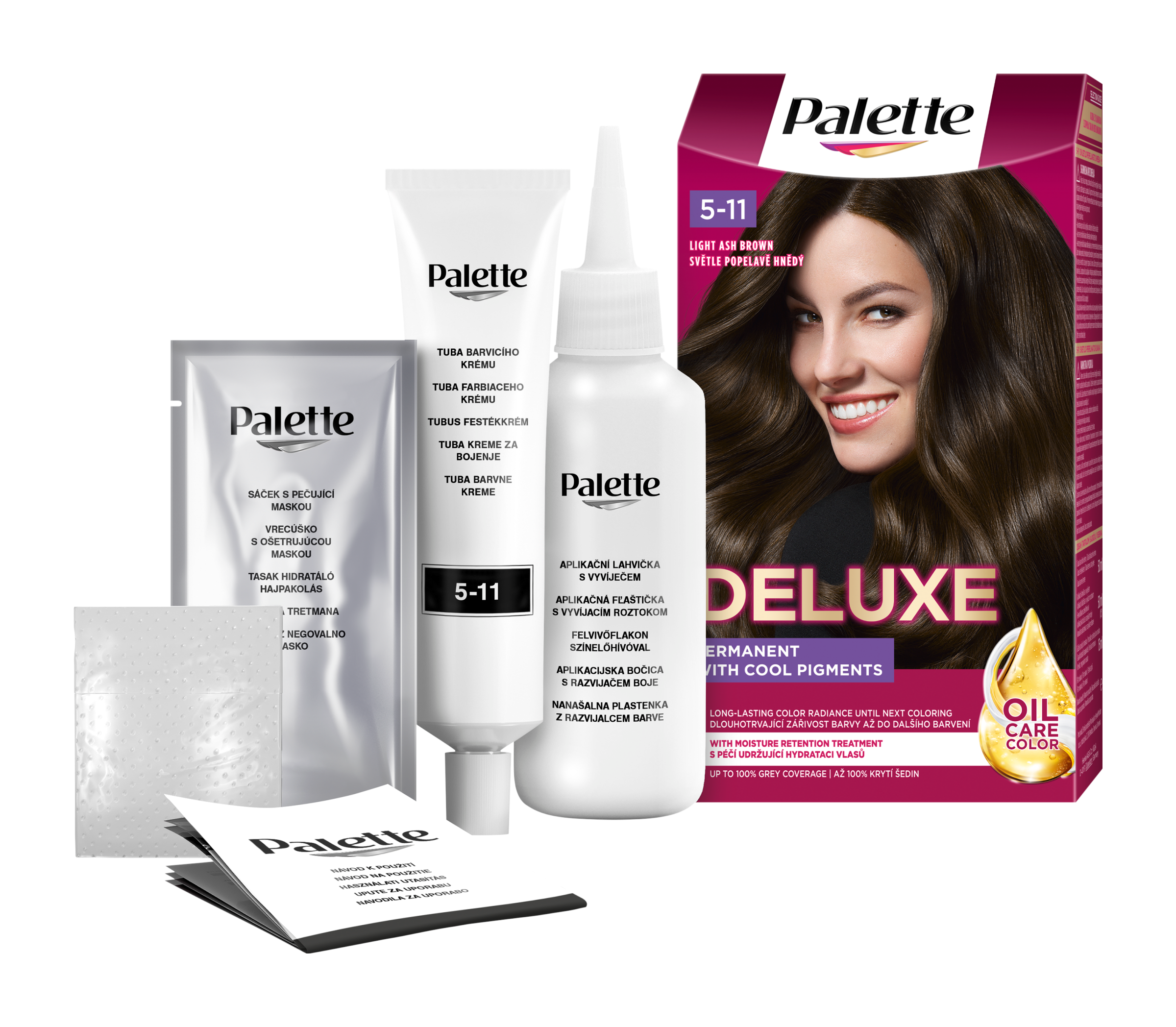 Palette Deluxe Oil Care barva na vlasy 5-11 Světle popelavě hnědý - Radost z barev s Deluxe. Permanentní barva na vlasy s až 100% krytím šedin Radujte se z barev s Palette Deluxe Oil Care: Bohaté složení Oil-in-creme s vysoce koncentrovanými pigmenty proniká do vlasů pro až 100% krytí šedin a poskytuje dlouhotrvající zářivost barvy až do dalšího barvení. Speciálně vyvinutá péče, která udržuje hydrataci vlasů, přináší pocit hloubkové hydratace a hedvábně hladkých a zdravě vypadajících vlasů. Složení bez silikonů také zlepšuje hebkost vlasů, usnadňuje jejich rozčesávání a dodává jim neodolatelný lesk. Složení Palette Deluxe je až z 93 % přírodního původu*. Krabička má certifikaci FSC. Hliníková tuba a příbalový leták jsou recyklované. Společně vytváříme krásné okamžiky pro barevný a udržitelný svět.