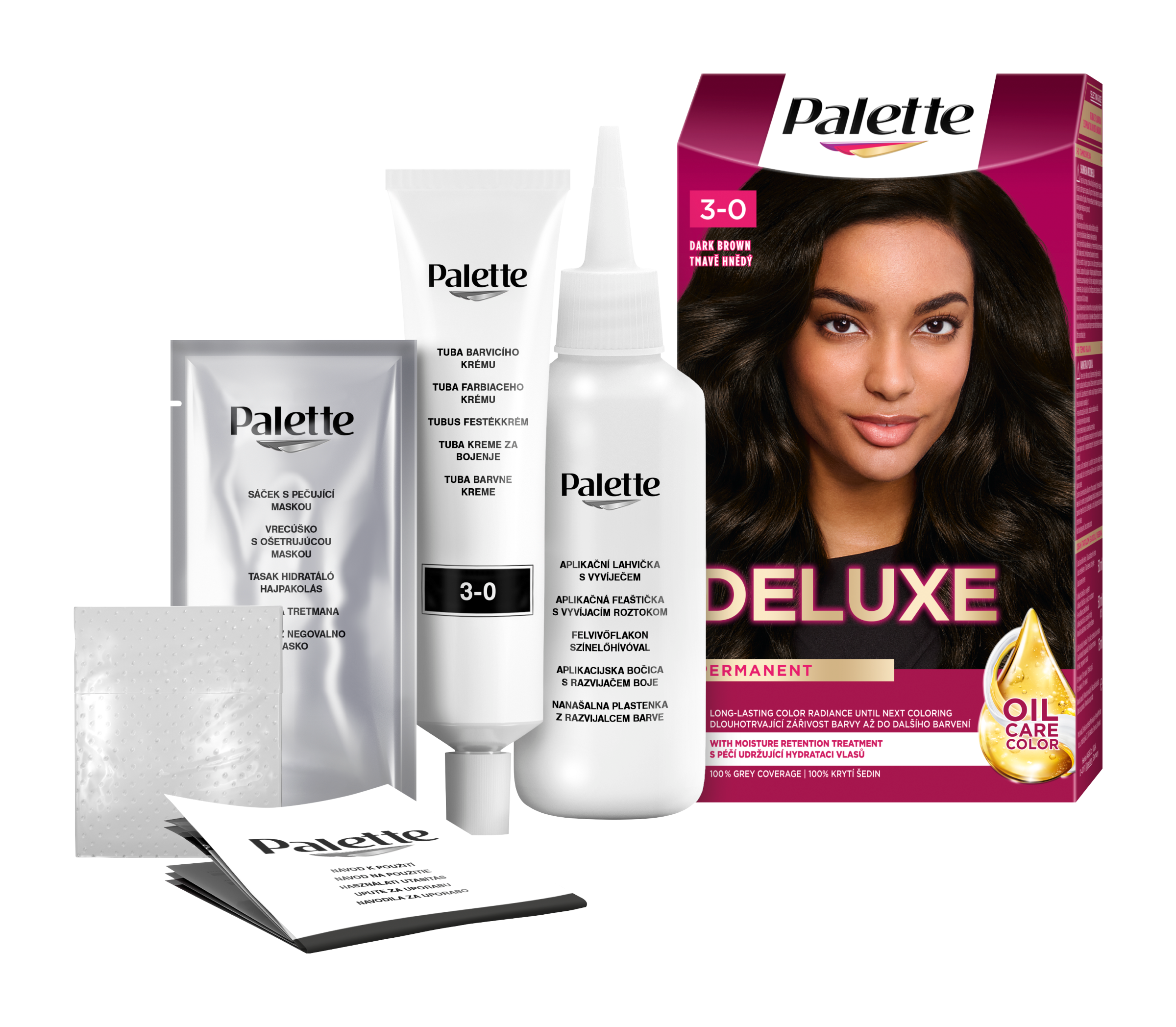 Palette Deluxe Oil Care barva na vlasy 3-0 Tmavě hnědý - Radost z barev s Deluxe. Permanentní barva na vlasy se 100% krytím šedin Radujte se z barev s Palette Deluxe Oil Care: Bohaté složení Oil-in-creme s vysoce koncentrovanými pigmenty proniká do vlasů pro 100% krytí šedin a poskytuje dlouhotrvající zářivost barvy až do dalšího barvení. Speciálně vyvinutá péče, která udržuje hydrataci vlasů, přináší pocit hloubkové hydratace a hedvábně hladkých a zdravě vypadajících vlasů. Složení bez silikonů také zlepšuje hebkost vlasů, usnadňuje jejich rozčesávání a dodává jim neodolatelný lesk. Složení Palette Deluxe je až z 93 % přírodního původu*. Krabička má certifikaci FSC. Hliníková tuba a příbalový leták jsou recyklované. Společně vytváříme krásné okamžiky pro barevný a udržitelný svět.