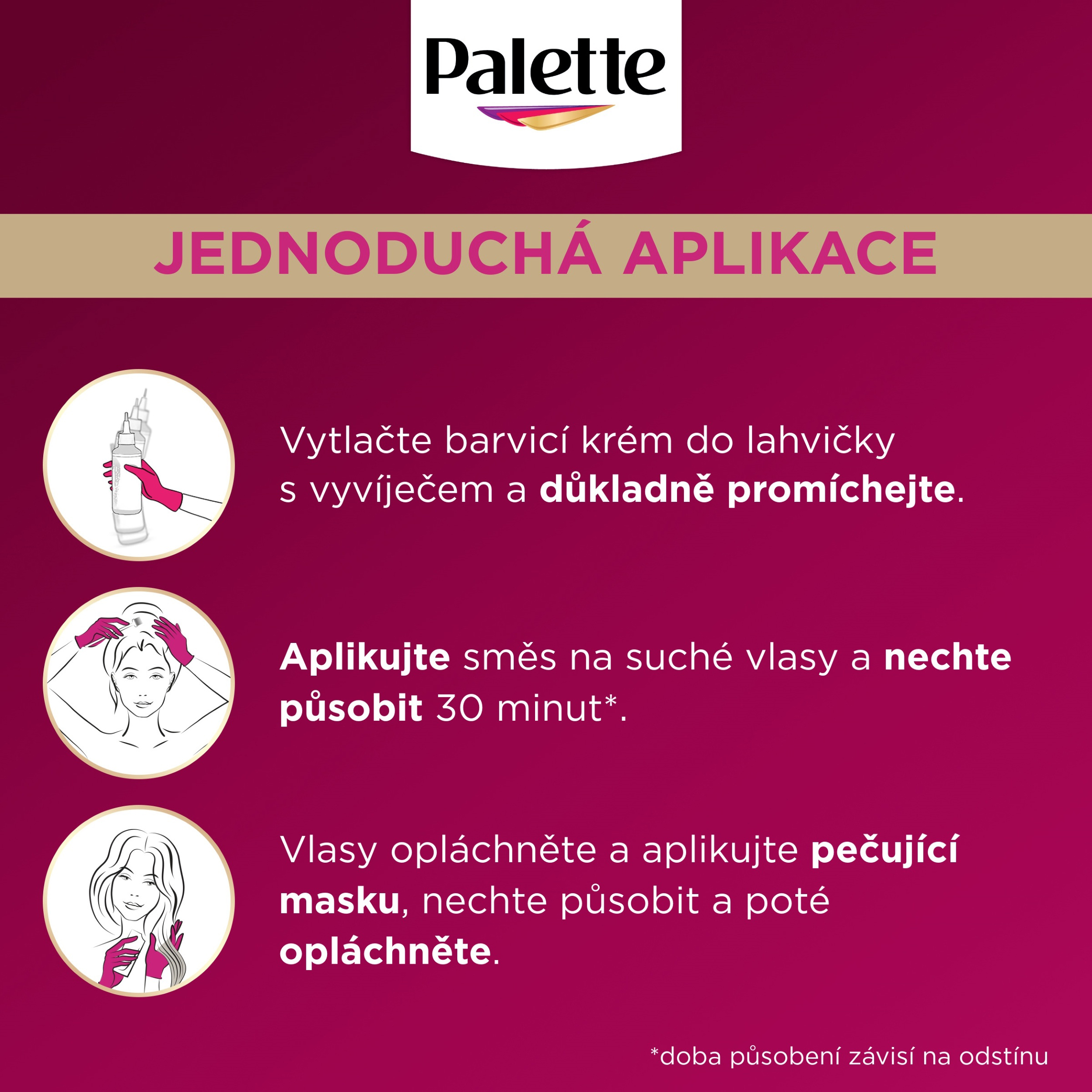 Jak postupovat: 1. Vytlačte obsah pečujícího barvicího krému Palette do lahvičky aplikátoru s vyvíječem a dobře promíchejte. 2. Směs rovnoměrně naneste pomocí aplikační lahvičky na suché předem nemyté vlasy a nechte působit 30-45 minut. 3. Oplachujte vlažnou vodou, dokud nepoteče zcela čirá. Poté použijte pečující masku, která je součástí balení.
