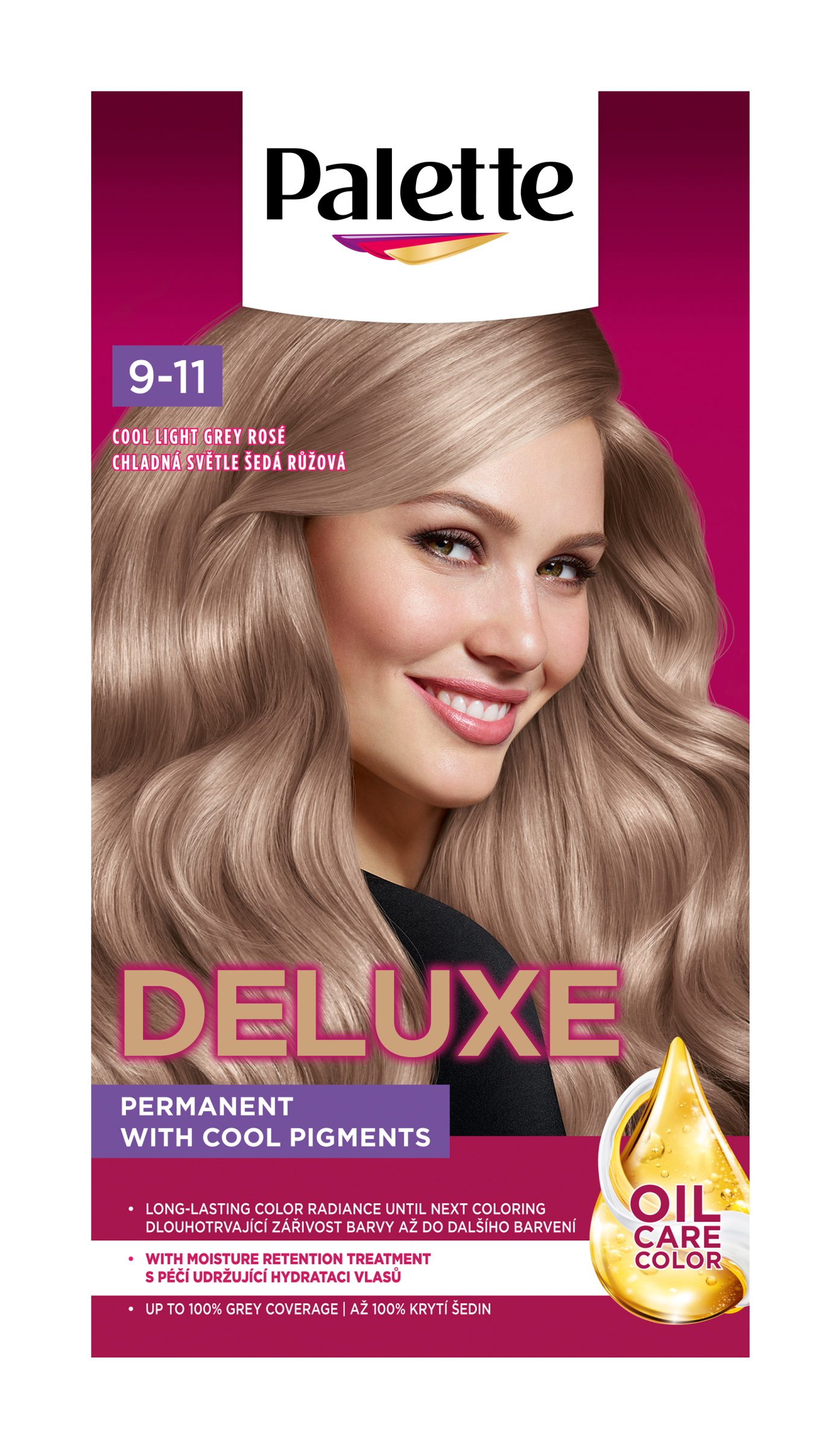 Palette Deluxe Oil Care barva na vlasy 9-11 Chladná světle šedá růžová - Radost z barev s Deluxe. Permanentní barva na vlasy s až 100% krytím šedin Radujte se z barev s Palette Deluxe Oil Care: Bohaté složení Oil-in-creme s vysoce koncentrovanými pigmenty proniká do vlasů pro až 100% krytí šedin a poskytuje dlouhotrvající zářivost barvy až do dalšího barvení. Speciálně vyvinutá péče, která udržuje hydrataci vlasů, přináší pocit hloubkové hydratace a hedvábně hladkých a zdravě vypadajících vlasů. Složení bez silikonů také zlepšuje hebkost vlasů, usnadňuje jejich rozčesávání a dodává jim neodolatelný lesk. Složení Palette Deluxe je až z 93 % přírodního původu*. Krabička má certifikaci FSC. Hliníková tuba a příbalový leták jsou recyklované. Společně vytváříme krásné okamžiky pro barevný a udržitelný svět.