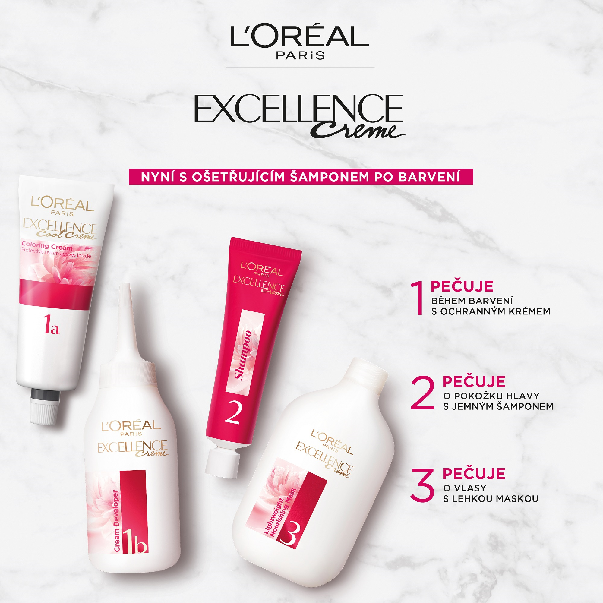 Permanentní barva obohacená o ochranné složky. L'Oréal Paris Excellence přináší rituál barvení s trojí ochranou obohacený o kyselinu hyaluronovou, který se stará o vaši barvu, pokožku hlavy i o vaše vlasy. S novým jemným ošetřujícím pH šamponem po barvení budou vaše vlasy hladké a plné lesku s přirozeně vypadající barvou. Kryje 100 % šedin. Kyselina hyaluronová je silná molekula přitahující hydrataci, přirozeně přítomná v těle, se schopností udržet 1000násobek své hmotnosti ve vodě.