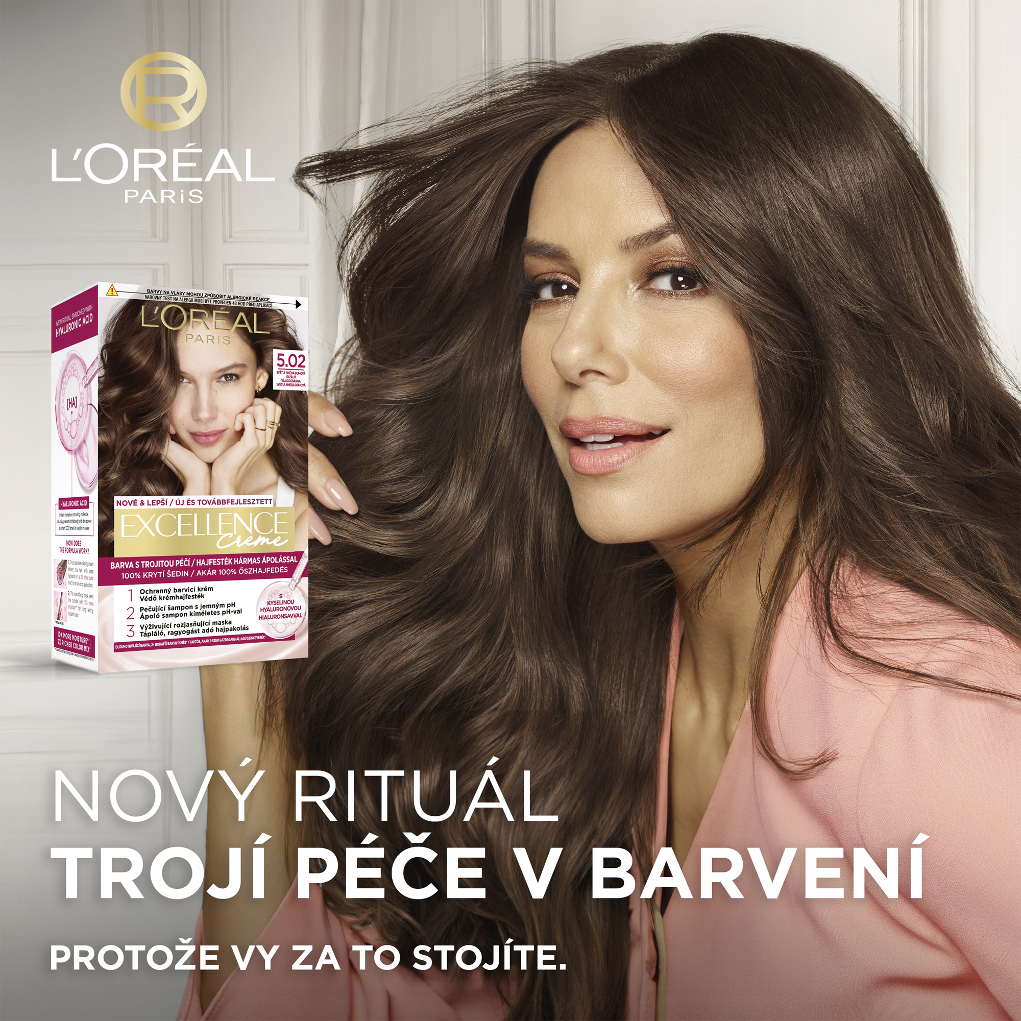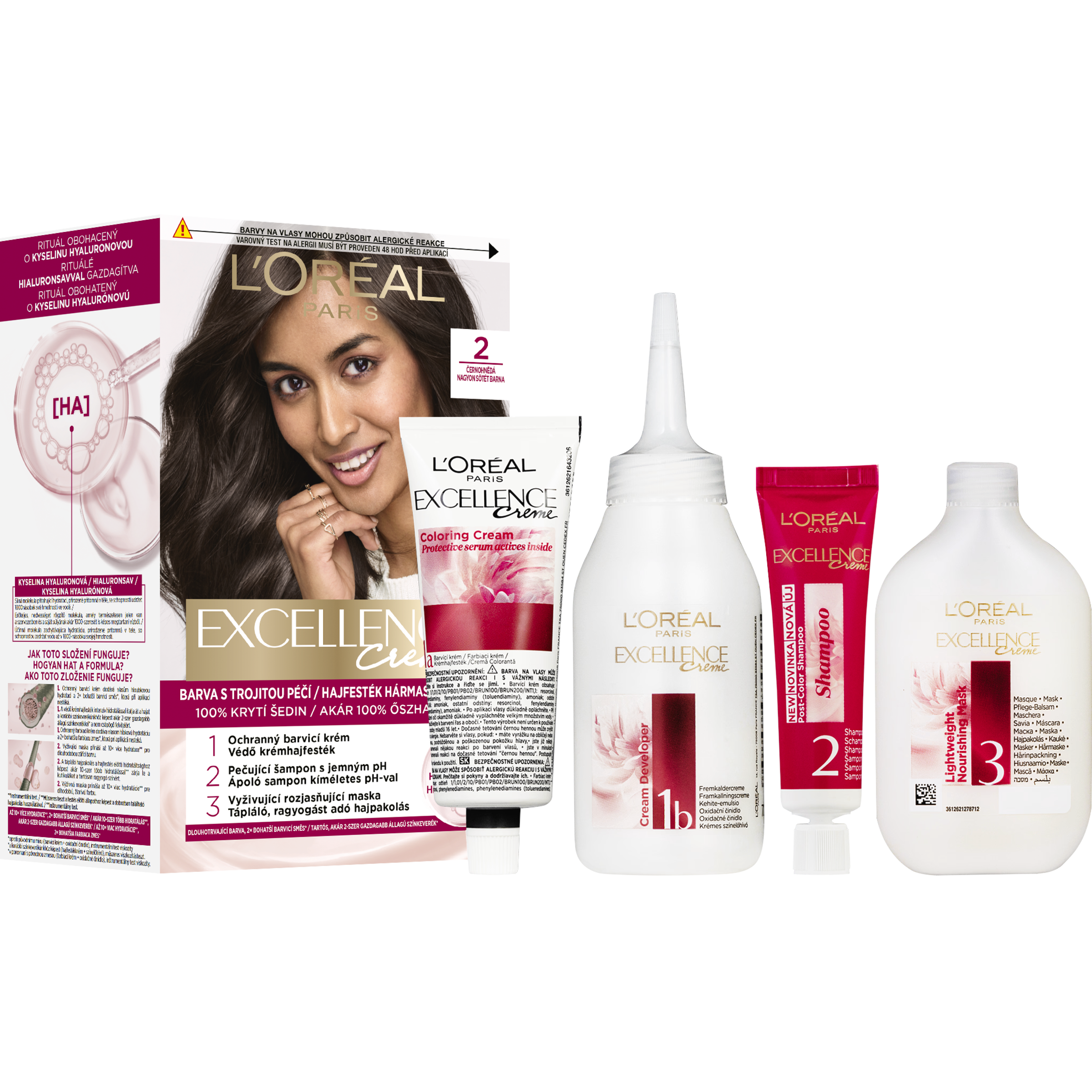 Permanentní barva na vlasy L'Oréal Paris Excellence Crème 2 Černohnědá poskytuje 100% krytí šedin a dlouhotrvající, přirozeně vypadající barevný výsledek. Složení je obohacené o kyselinu hyaluronovou, která dokáže vázat až 1000násobek své hmotnosti ve vodě a pomáhá tak udržovat hydrataci vlasů během barvení. Trojitý pečující rituál zahrnuje ochranný barvicí krém, jemný šampon s vyváženým pH po barvení a vyživující masku, které společně pečují o vlasy i pokožku hlavy. Výsledkem jsou hladké, hebké a lesklé vlasy s až 2× bohatší barvou a až 10× vyšší hydratací, vhodné pro všechny typy vlasů.
