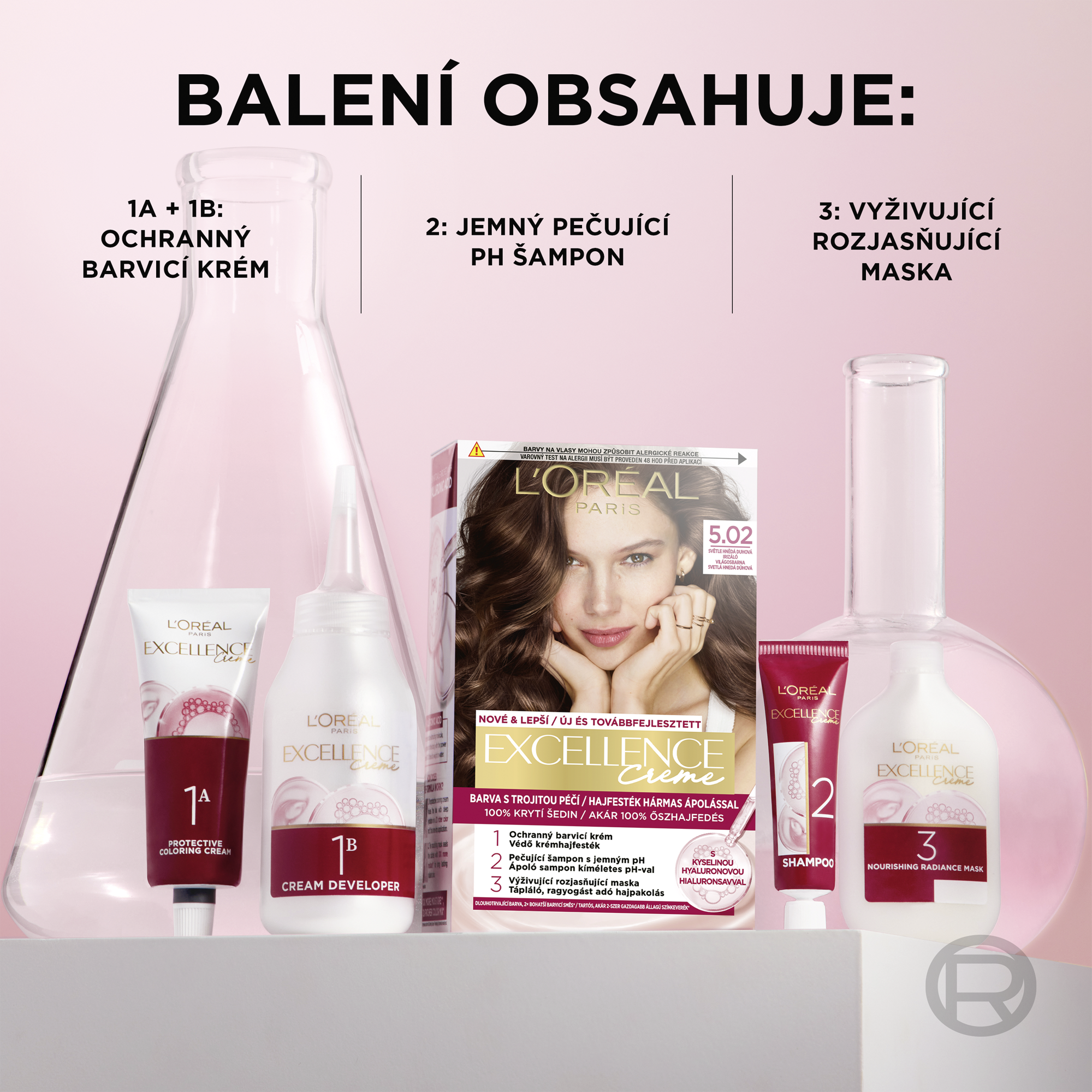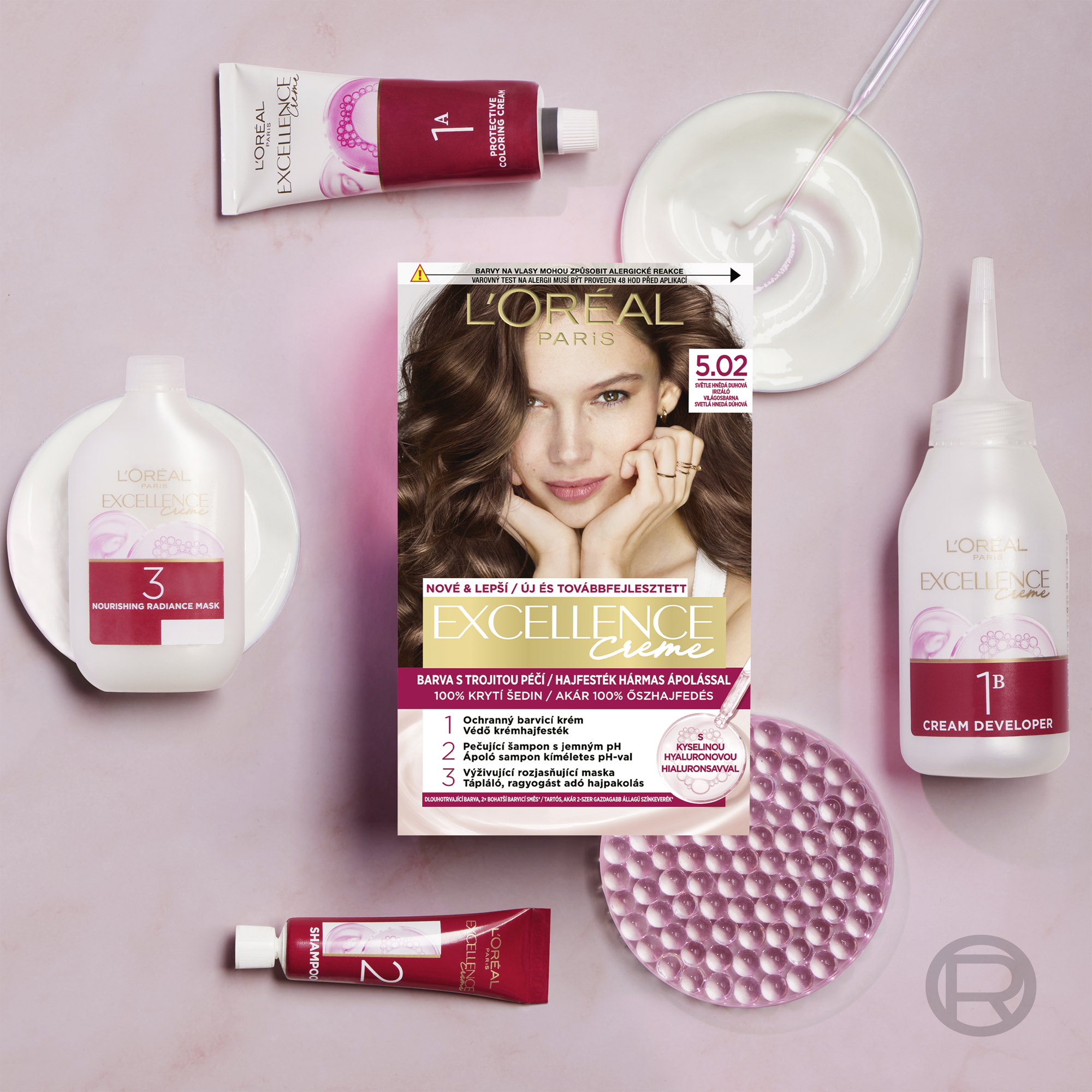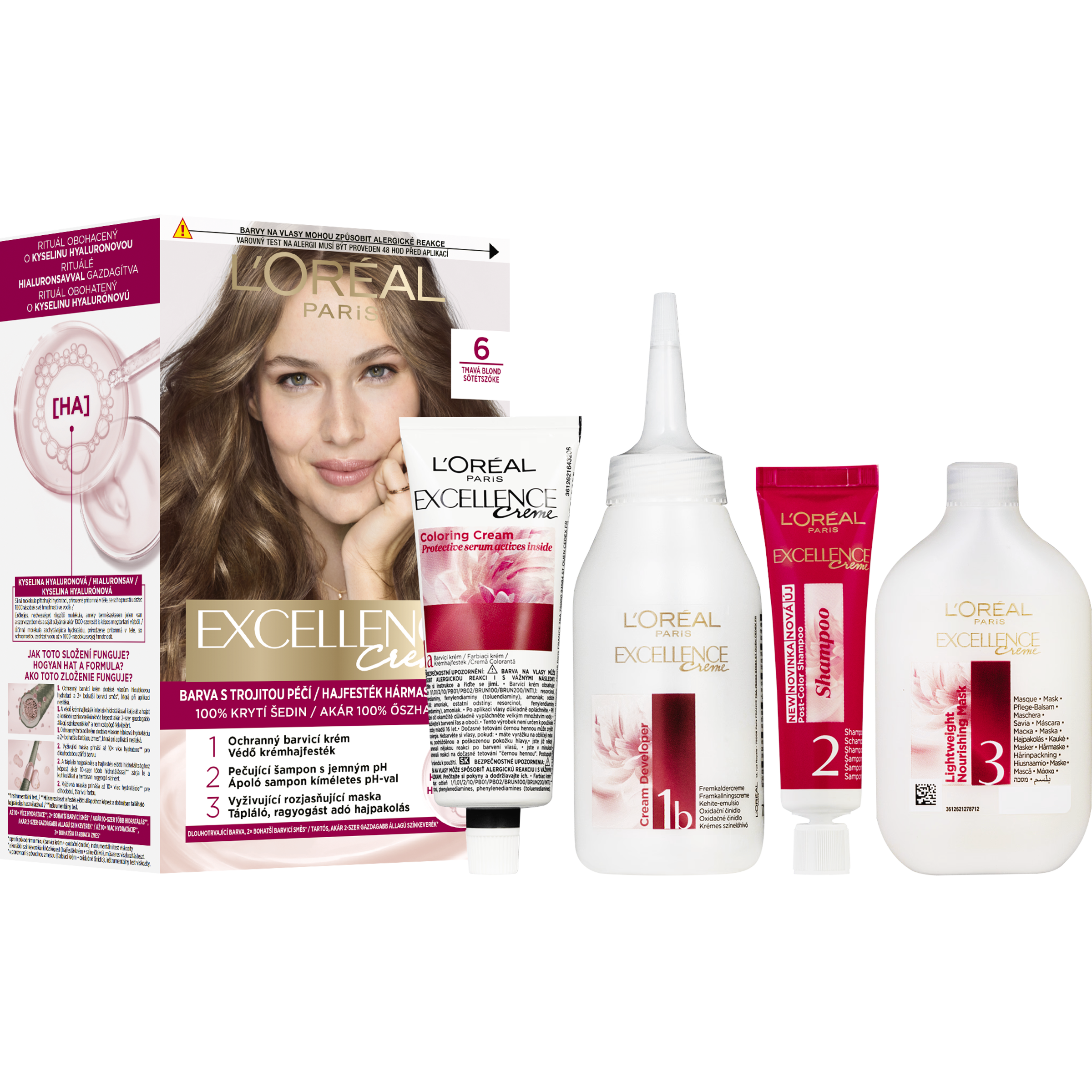 Permanentní barva na vlasy L'Oréal Paris Excellence Crème 6 Tmavá blond poskytuje 100% krytí šedin a dlouhotrvající, přirozeně vypadající barvu s leskem. Složení je obohacené o kyselinu hyaluronovou, která dokáže vázat až 1000násobek své hmotnosti ve vodě a pomáhá tak udržovat hydrataci vlasů během barvení. Trojitý pečující rituál zahrnuje ochranný barvicí krém, jemný šampon s vyváženým pH po barvení a vyživující masku, které společně pečují o vlasy i pokožku hlavy. Výsledkem jsou hladké, hebké a lesklé vlasy s až 2× bohatší barvou a až 10× vyšší hydratací.