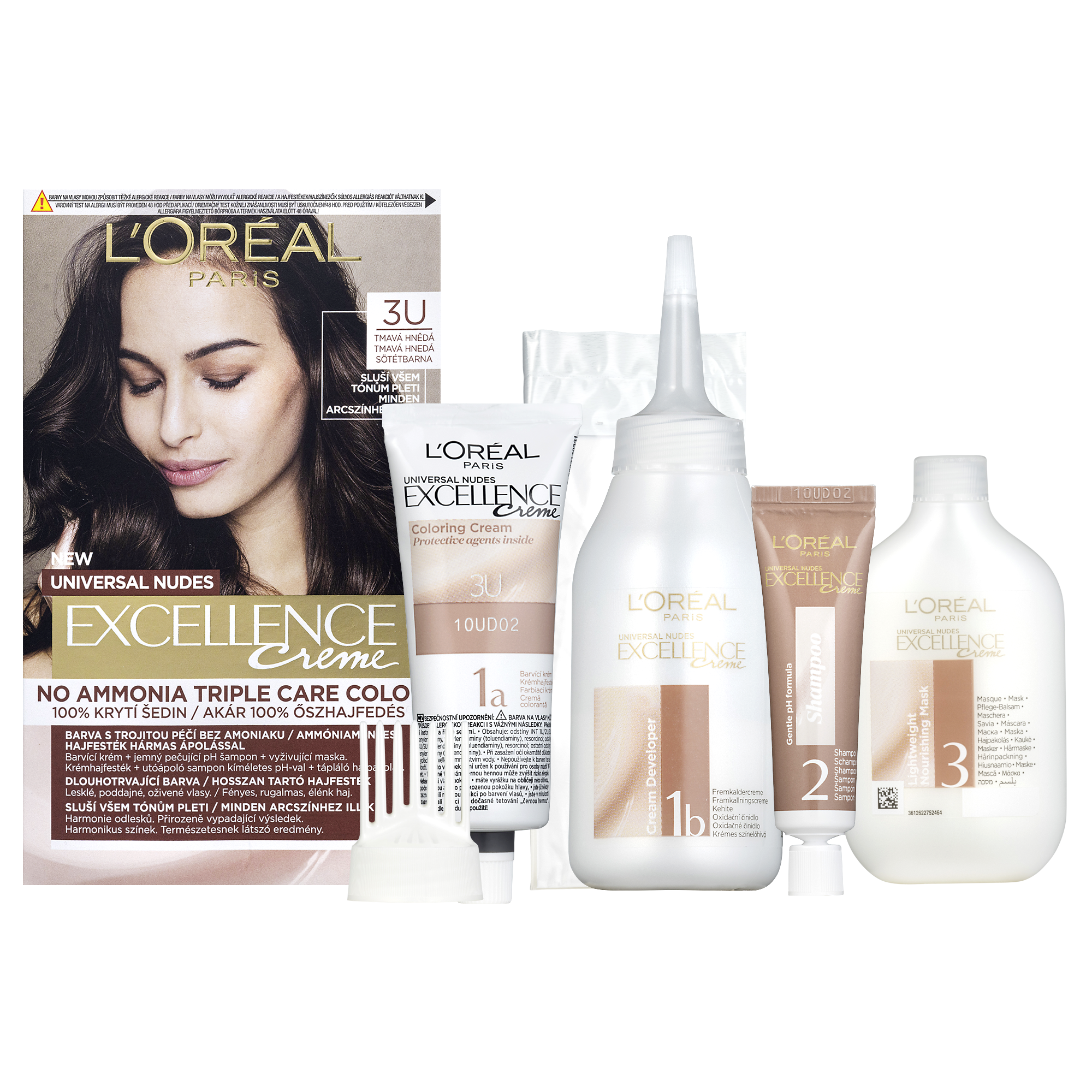 Jak funguje v barvách na vlasy? 1. V ochranném barvicím krému dodává vlasům hloubkovou hydrataci a až 2x bohatší barevný výsledek*. 2. Ve vyživující masce přináší až 10x větší hydrataci** pro dlouhodobou zářící barvu. Excellence Nudes přináší odlesk U, který je unikátní spojení studených a teplých odlesků, které ladí ke všem podtónům pleti, pro přirozeně vypadající výsledek.