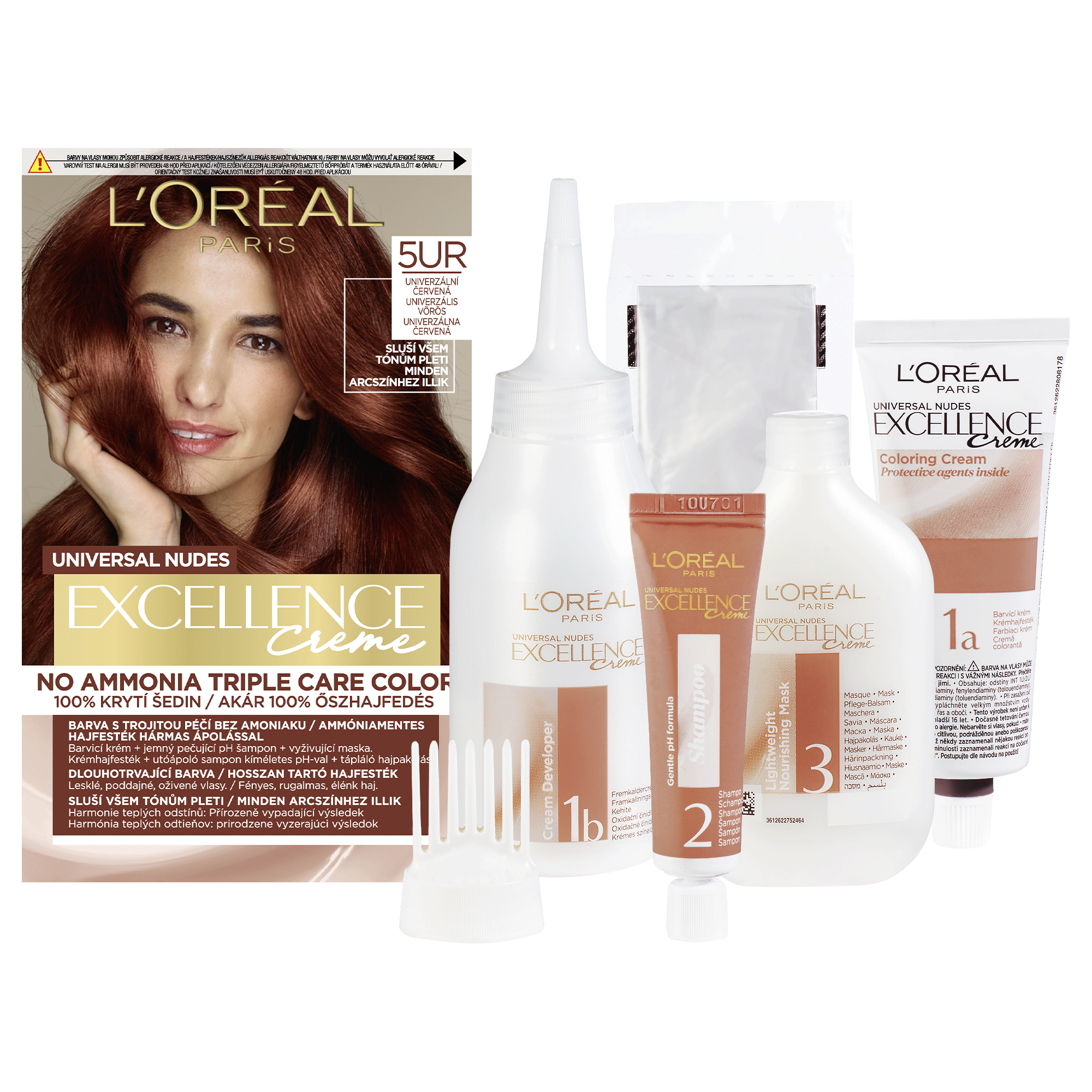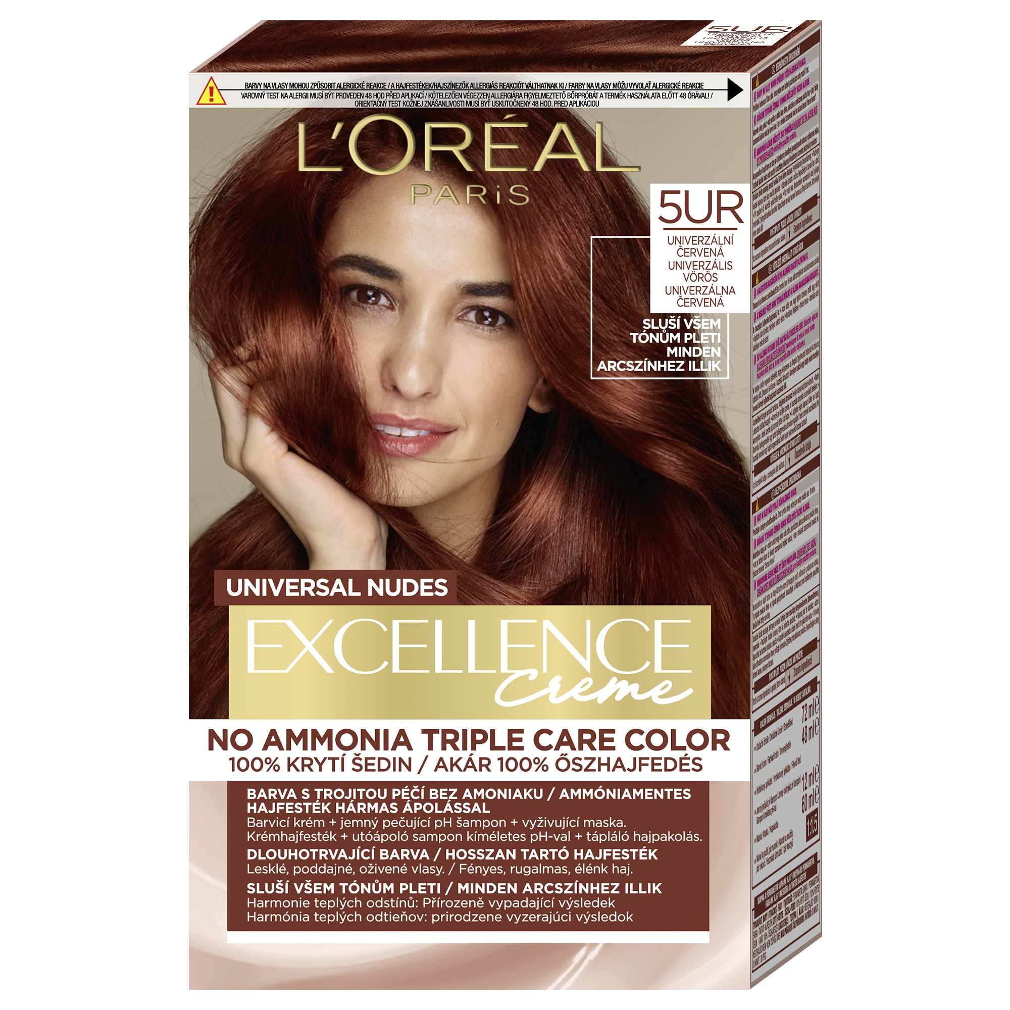 Intenzivní permanentní barva ve složení bez amoniaku, obohacené o ochranné složky. L'Oréal Paris Excellence přichází s rituálem barvení s trojí ochranou, který se stará o vaši barvu, pokožku hlavy i o vaše vlasy.To vše díky pečujícímu barvicímu krému, jemnému pečujícímu pH šamponu a vyživující masce. Vaše vlasy zanechá hladké a plné lesku s přirozeně vypadající barvou. Kryje až 100 % šedin. Excellence Nudes Copper navíc přináší odraz UR, který unikátně spojuje delikátní teplé odstíny pro barevný výsledek, který je harmonický s každým typem pleti a vypadá přirozeně*. *Testováno na přirozených kombinacích barvy vlasů a tónů pleti dle vědeckých publikací.
