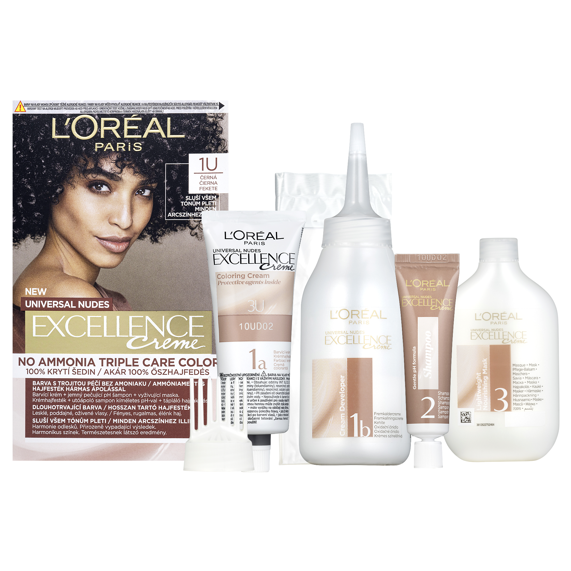 Jak funguje v barvách na vlasy? 1. V ochranném barvicím krému dodává vlasům hloubkovou hydrataci a až 2x bohatší barevný výsledek*. 2. Ve vyživující masce přináší až 10x větší hydrataci** pro dlouhodobou zářící barvu. Excellence Nudes přináší odlesk U, který je unikátní spojení studených a teplých odlesků, které ladí ke všem podtónům pleti, pro přirozeně vypadající výsledek.