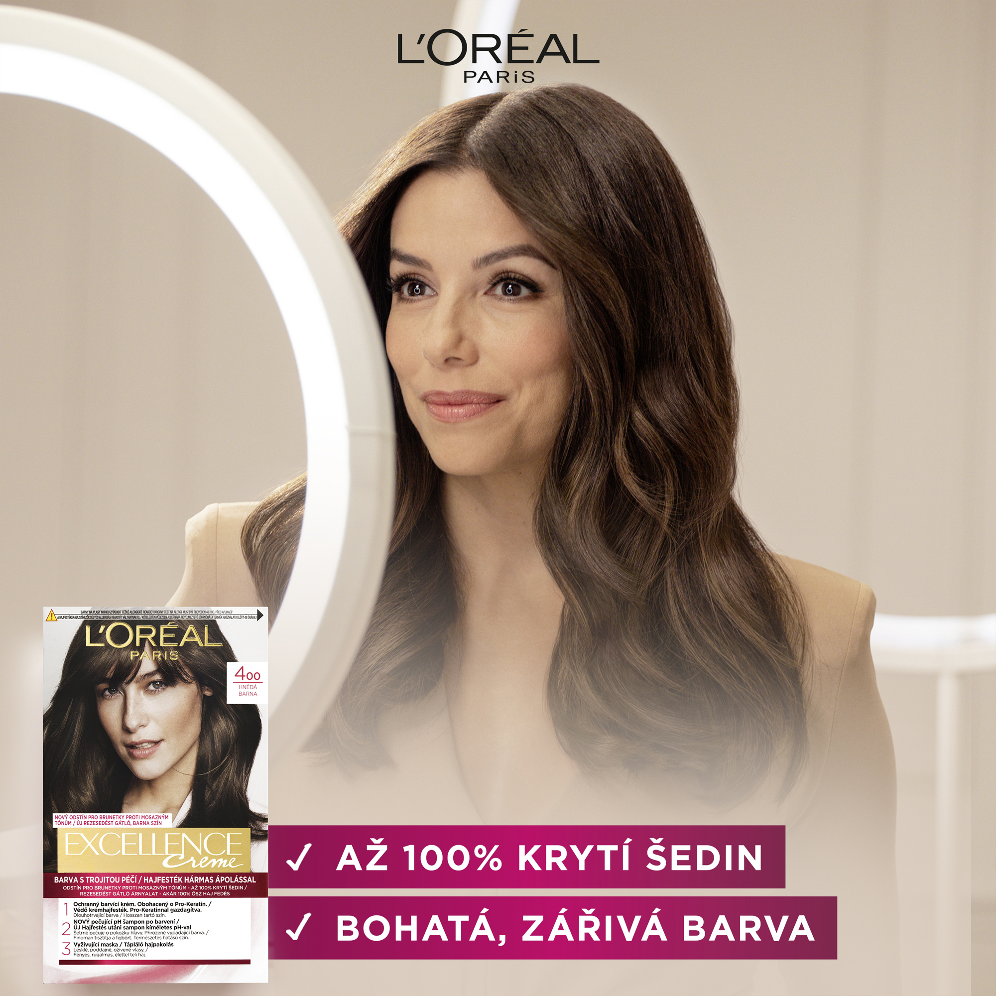 Permanentní barva ve složení bez amoniaku, obohacené o ochranné složky. L'Oréal Paris Excellence přináší rituál barvení s trojí ochranou obohacený o kyselinu hyaluronovou, který se stará o vaši barvu, pokožku hlavy i o vaše vlasy. S novým jemným ošetřujícím pH šamponem po barvení budou vaše vlasy hladké a plné lesku s přirozeně vypadající barvou. Kryje 100 % šedin. Kyselina hyaluronová je silná molekula přitahující hydrataci, přirozeně přítomná v těle, se schopností udržet 1000násobek své hmotnosti ve vodě.