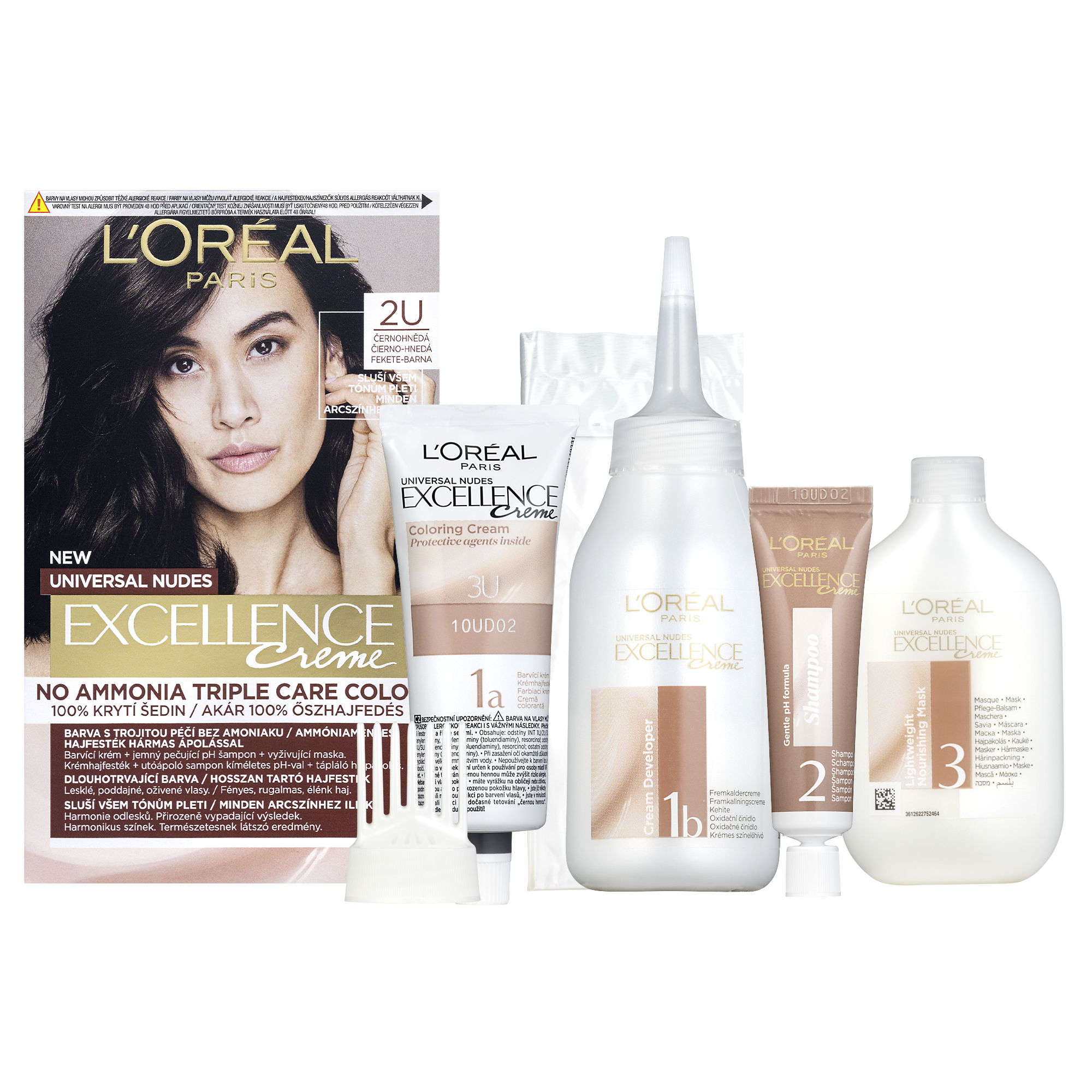 Jak funguje v barvách na vlasy? 1. V ochranném barvicím krému dodává vlasům hloubkovou hydrataci a až 2x bohatší barevný výsledek*. 2. Ve vyživující masce přináší až 10x větší hydrataci** pro dlouhodobou zářící barvu. Excellence Nudes přináší odlesk U, který je unikátní spojení studených a teplých odlesků, které ladí ke všem podtónům pleti, pro přirozeně vypadající výsledek.