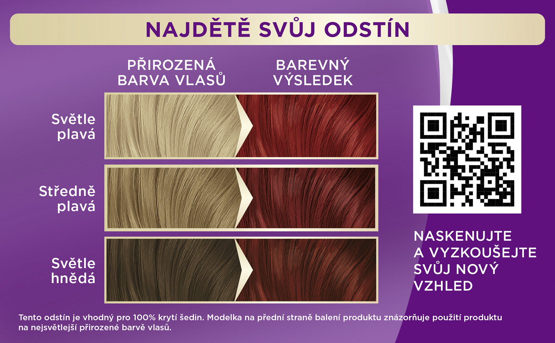 Rozsah použití viz obal. Vhodný i na úplně šedivé vlasy. Modelka na přední straně znázorňuje barevný výsledek na zvýrazněné přirozené barvě vlasů.