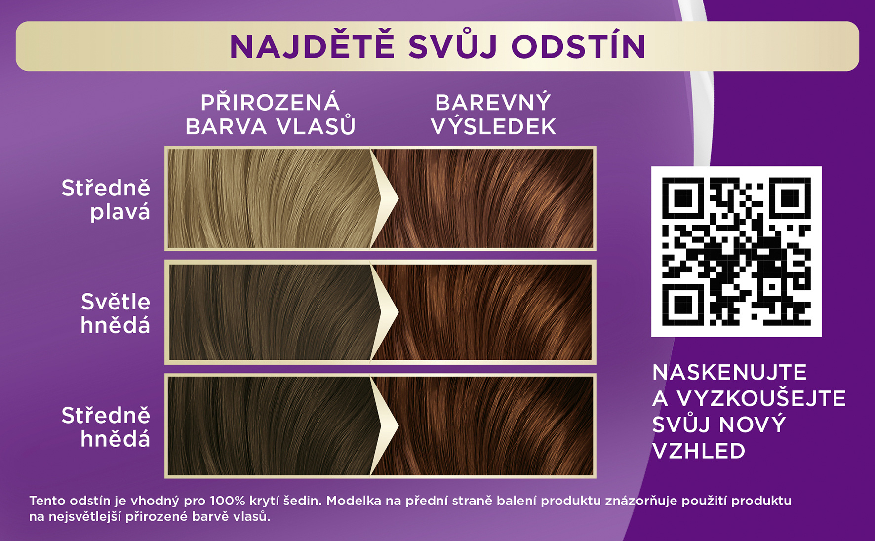 Rozsah použití viz obal. Vhodný i na úplně šedivé vlasy. Modelka na přední straně znázorňuje barevný výsledek na zvýrazněné přirozené barvě vlasů.