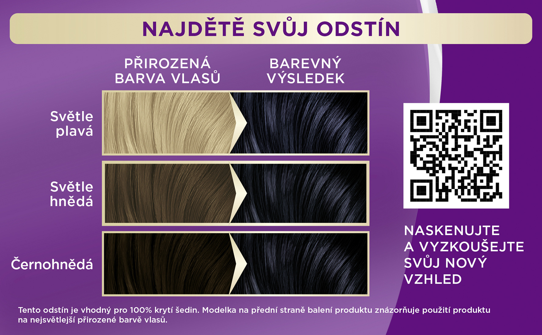 UPOZORNĚNÍ: Obsahuje peroxid vodíku, fenylendiaminy (toluendiaminy) a resorcinol. Nepoužívejte k barvení řas a obočí. Po použití vlasy důkladně opláchněte. Složení výrobku - viz spodek krabičky. Proveďte varovný test na alergii 48 hodin před každým použitím barvy na vlasy, a to i v případě, že jste barvy na vlasy používali již dříve. Proto nezapomeňte zakoupit výrobek 48 hodin před samotným použitím. V případě jakýchkoliv reakcí či pochybností se, prosím, ještě před použitím jakékoliv barvy na vlasy poraďte s lékařem. Zamezte styku s očima. Při zasažení očí okamžitě vypláchněte vodou. Používejte vhodné rukavice. Uchovávejte mimo dosah dětí.
