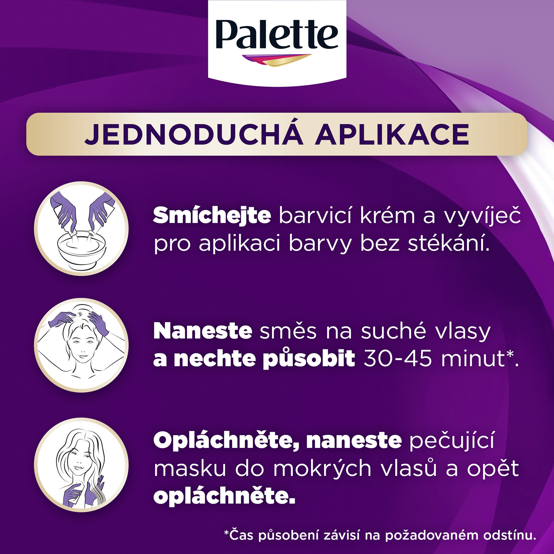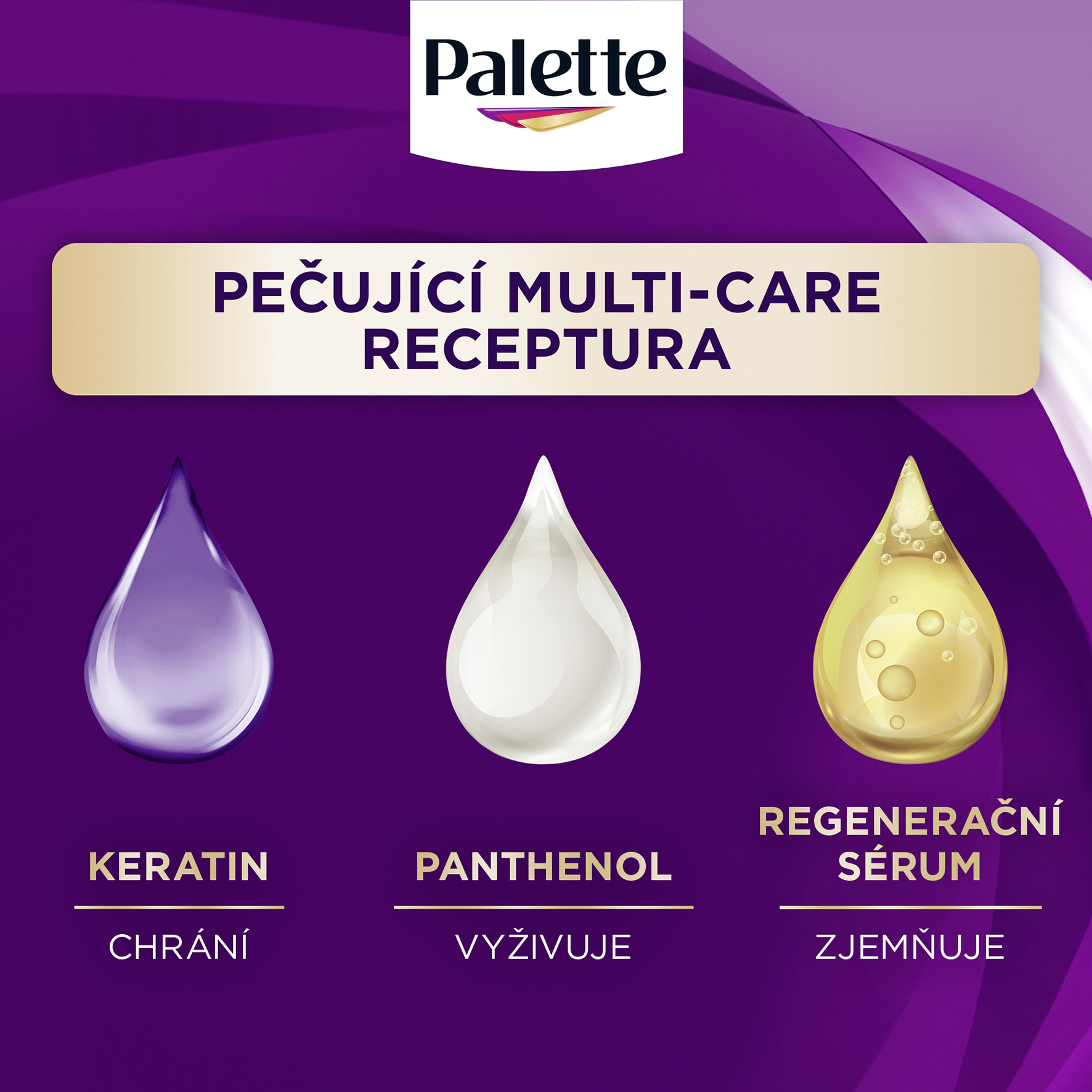 Objevte Palette Intensive Color Creme s MULTI-CARE recepturou pro dlouhotrvající a intenzivní barevný výsledek. Složení s vysoce intenzivními pigmenty proniká hluboko do vlasů a ukotvuje v nich barvu pro ochranu proti vyblednutí. Výsledkem je tak dlouhotrvající intenzita barvy po několik týdnů a 100% krytí šedin. Nová MULTI-CARE receptura díky keratinu, panthenolu a regeneračnímu séru navíc chrání vaše vlasy a poskytuje jim komplexní péči během barvení a po něm. Keratin slouží jako ochranný štít, který vlasy chrání během barvení i po něm. Panthenol vlasy intenzivně vyživuje a viditelně zlepšuje jejich kvalitu. Regenerační sérum je navrženo k obnovení a zjemnění vlasového vlákna. Tento odstín je vhodný pro světle plavé až černé vlasy. Vhodný i na úplně šedivé vlasy.