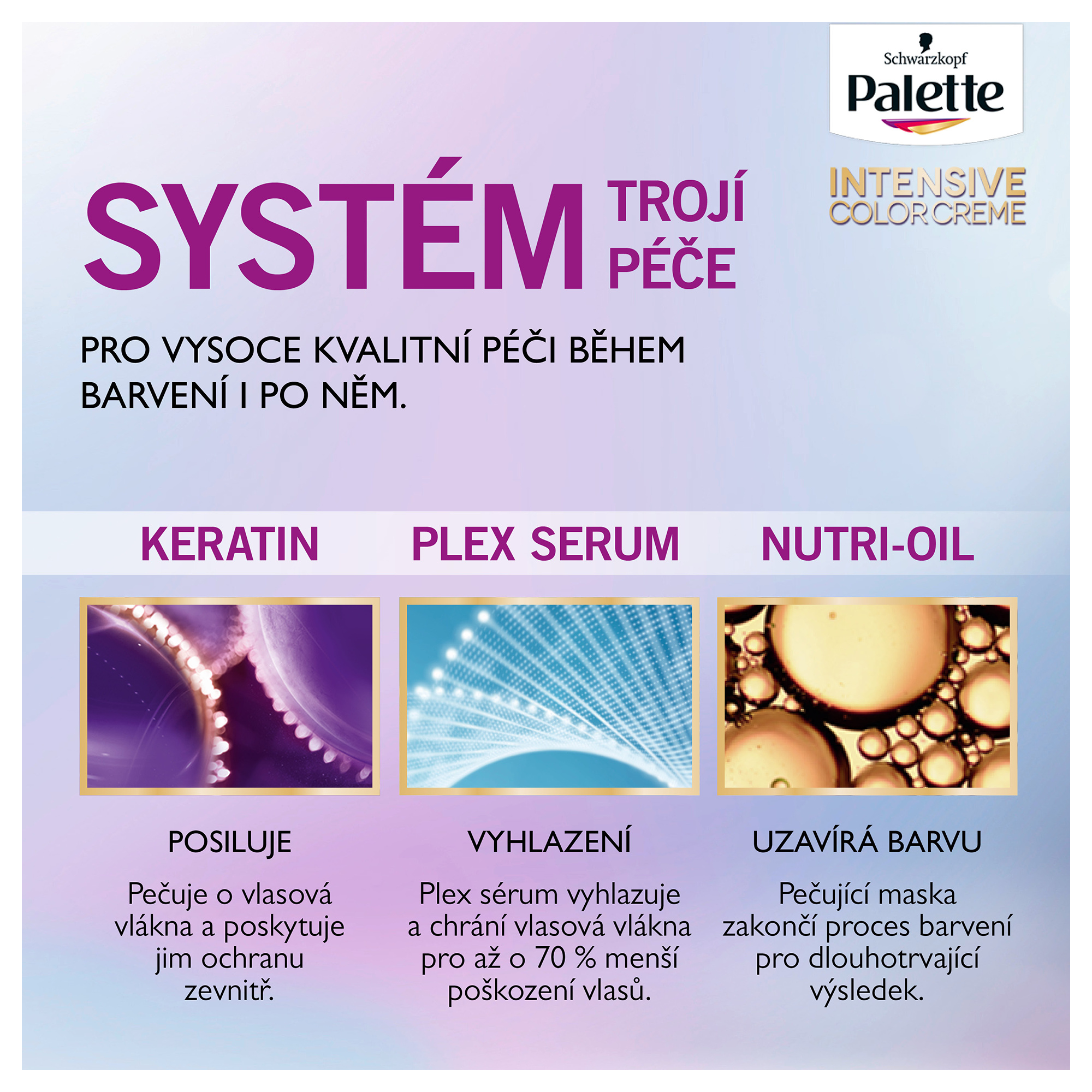 Objevte Palette Intensive Color Creme s MULTI-CARE recepturou pro dlouhotrvající a intenzivní barevný výsledek. Složení s vysoce intenzivními pigmenty proniká hluboko do vlasů a ukotvuje v nich barvu pro ochranu proti vyblednutí. Výsledkem je tak dlouhotrvající intenzita barvy po několik týdnů a 100% krytí šedin. Nová MULTI-CARE receptura díky keratinu, panthenolu a regeneračnímu séru navíc chrání vaše vlasy a poskytuje jim komplexní péči během barvení a po něm. Keratin slouží jako ochranný štít, který vlasy chrání během barvení i po něm. Panthenol vlasy intenzivně vyživuje a viditelně zlepšuje jejich kvalitu. Regenerační sérum je navrženo k obnovení a zjemnění vlasového vlákna. Tento odstín je vhodný pro světle plavé až světle hnědé vlasy. Vhodné i na úplně šedivé vlasy.