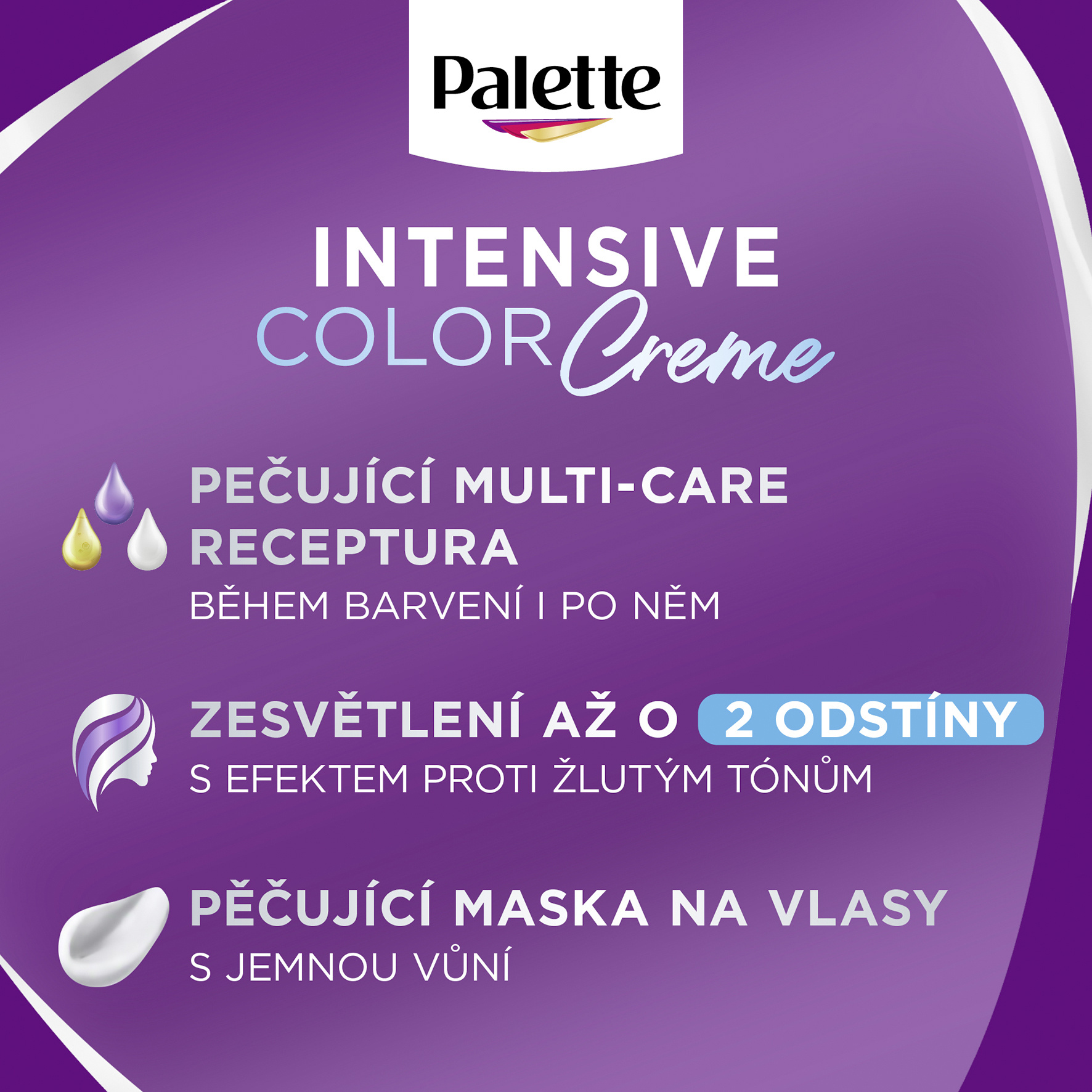 Objevte Palette Intensive Color Creme intenzivní zesvětlovač s MULTI-CARE recepturou pro dlouhotrvající a intenzivní barevný výsledek. Složení obsahuje speciální mix blond pigmentů, které pronikají hluboko do vlasového vlákna pro efekt proti žlutým tónům až po dobu 8 týdnů. Výsledkem je tak dlouhotrvající intenzita barvy a zesvětlení až o 2 odstíny. Nová MULTI-CARE receptura díky keratinu, panthenolu a regeneračnímu séru navíc chrání vaše vlasy a poskytuje jim komplexní péči během barvení a po něm. Keratin slouží jako ochranný štít, který vlasy chrání během barvení i po něm. Panthenol vlasy intenzivně vyživuje a viditelně zlepšuje jejich kvalitu. Regenerační sérum je navrženo k obnovení a zjemnění vlasového vlákna.Tento odstín je vhodný pro předzesvětlené vlasy až světle plavé vlasy. Nedoporučuje se pro šedivé vlasy.