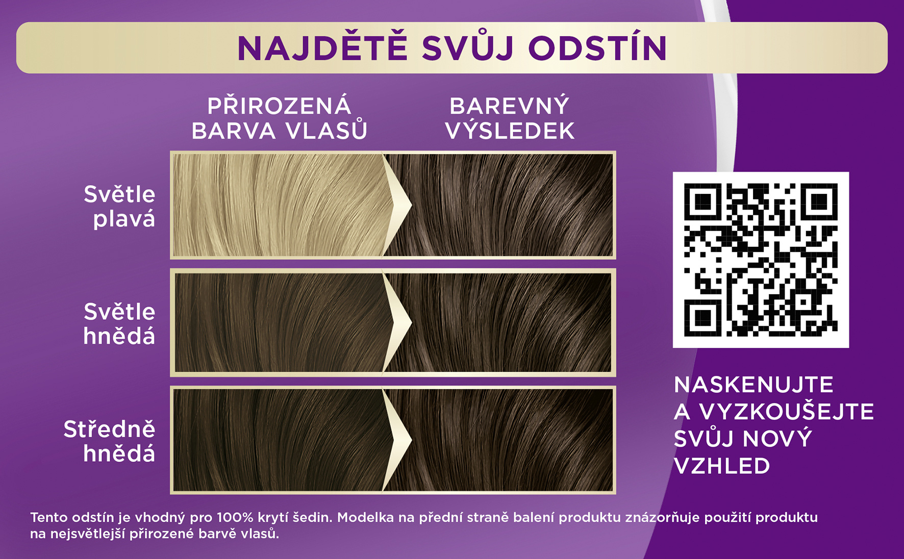 Rozsah použití viz obal. Vhodný i na úplně šedivé vlasy. Modelka na přední straně znázorňuje barevný výsledek na zvýrazněné přirozené barvě vlasů.