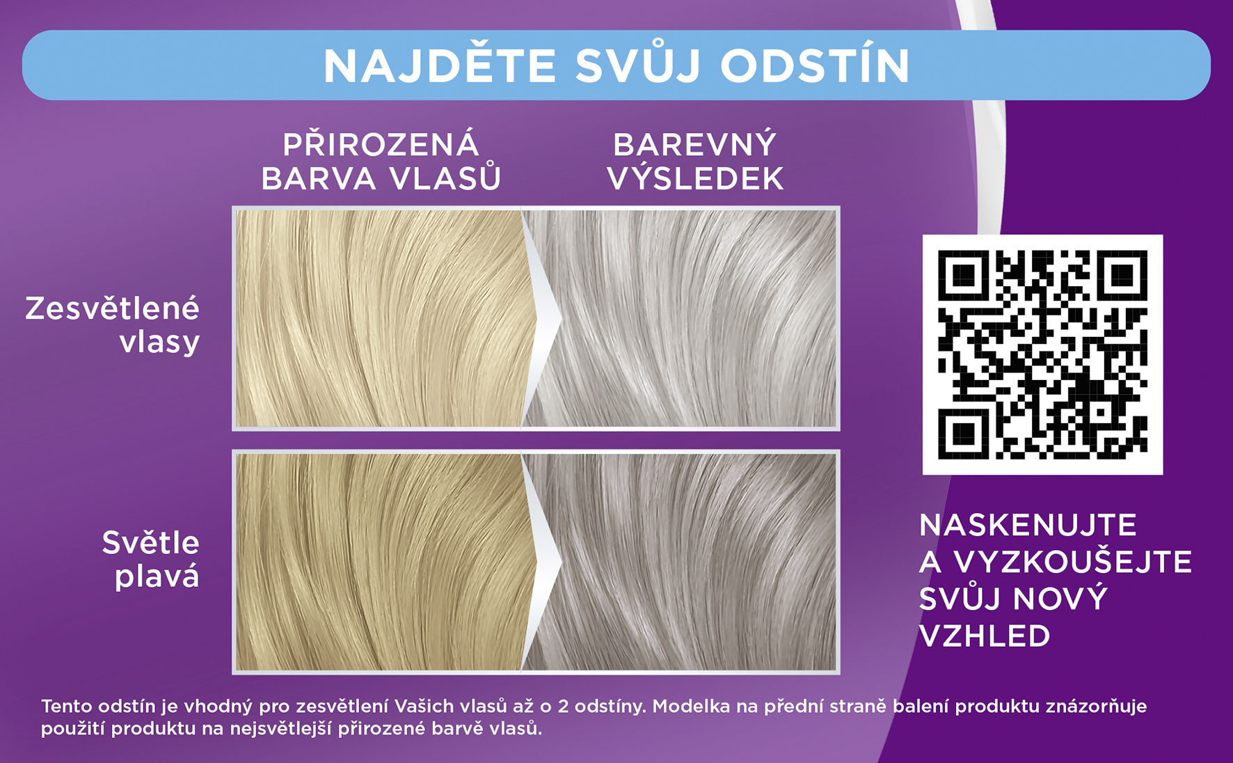 UPOZORNĚNÍ: Obsahuje peroxid vodíku, fenylendiaminy (toluendiaminy) a resorcinol. Nepoužívejte k barvení řas a obočí. Po použití vlasy důkladně opláchněte. Složení výrobku - viz spodek krabičky. Proveďte varovný test na alergii 48 hodin před každým použitím barvy na vlasy, a to i v případě, že jste barvy na vlasy používali již dříve. Proto nezapomeňte zakoupit výrobek 48 hodin před samotným použitím. V případě jakýchkoliv reakcí či pochybností se, prosím, ještě před použitím jakékoliv barvy na vlasy poraďte s lékařem. Zamezte styku s očima. Při zasažení očí okamžitě vypláchněte vodou. Používejte vhodné rukavice. Uchovávejte mimo dosah dětí.