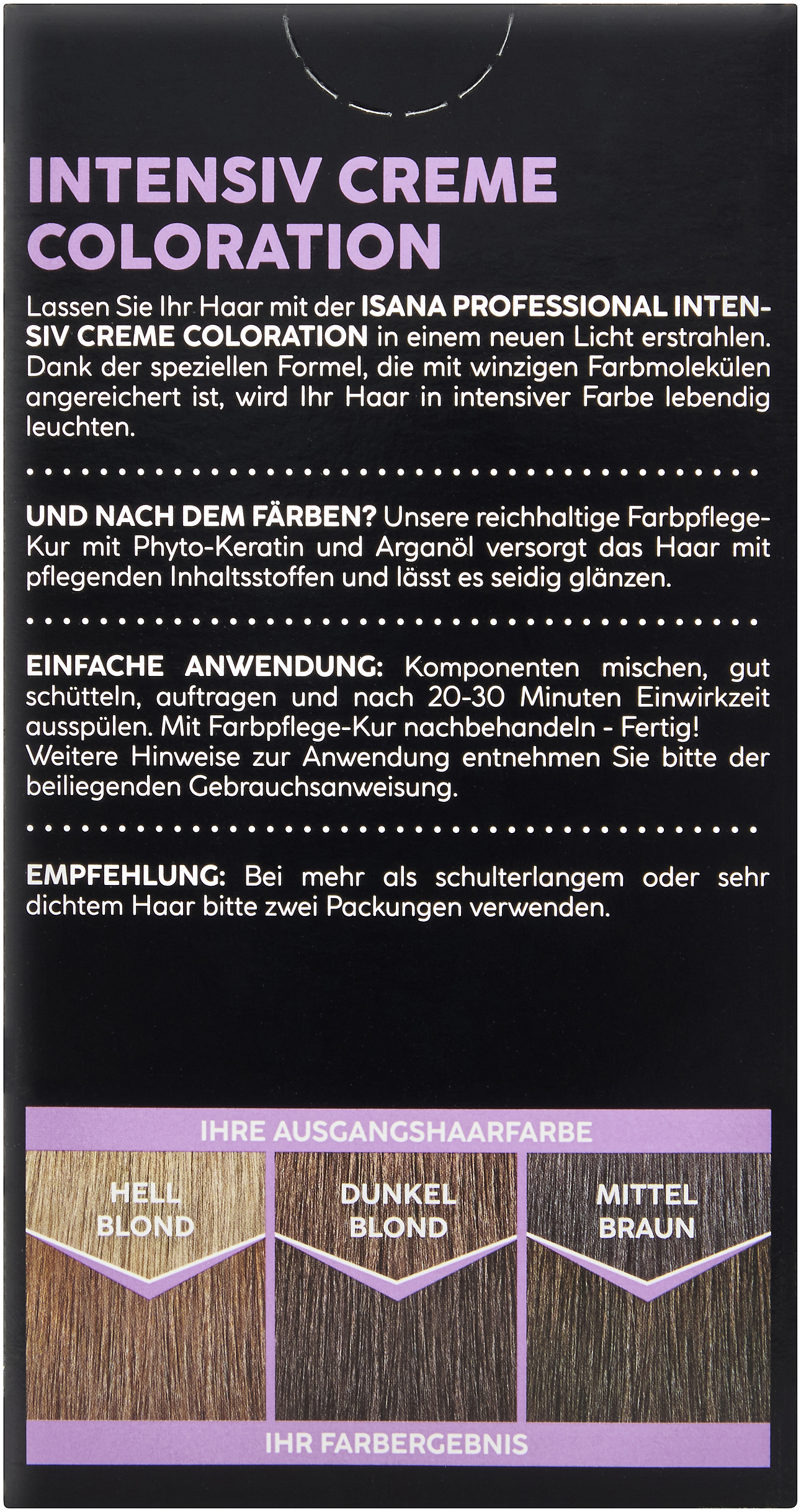Krytí šedin až 100 %. Dlouhotrvající zářivá barva a intenzivní lesk. Rozzáří vaše vlasy novým světlem s Isana Professional Intensive creme coloration. Díky speciálnímu složení obohacenému o drobné barevné molekuly budou vaše vlasy zářit živě a intenzivní barvou. A po barvení? Naše bohatá pečující kúra pro barvu s fytokeratinem a arganovým olejem dodává vlasům vyživující složky a zanechává je hedvábně lesklé.