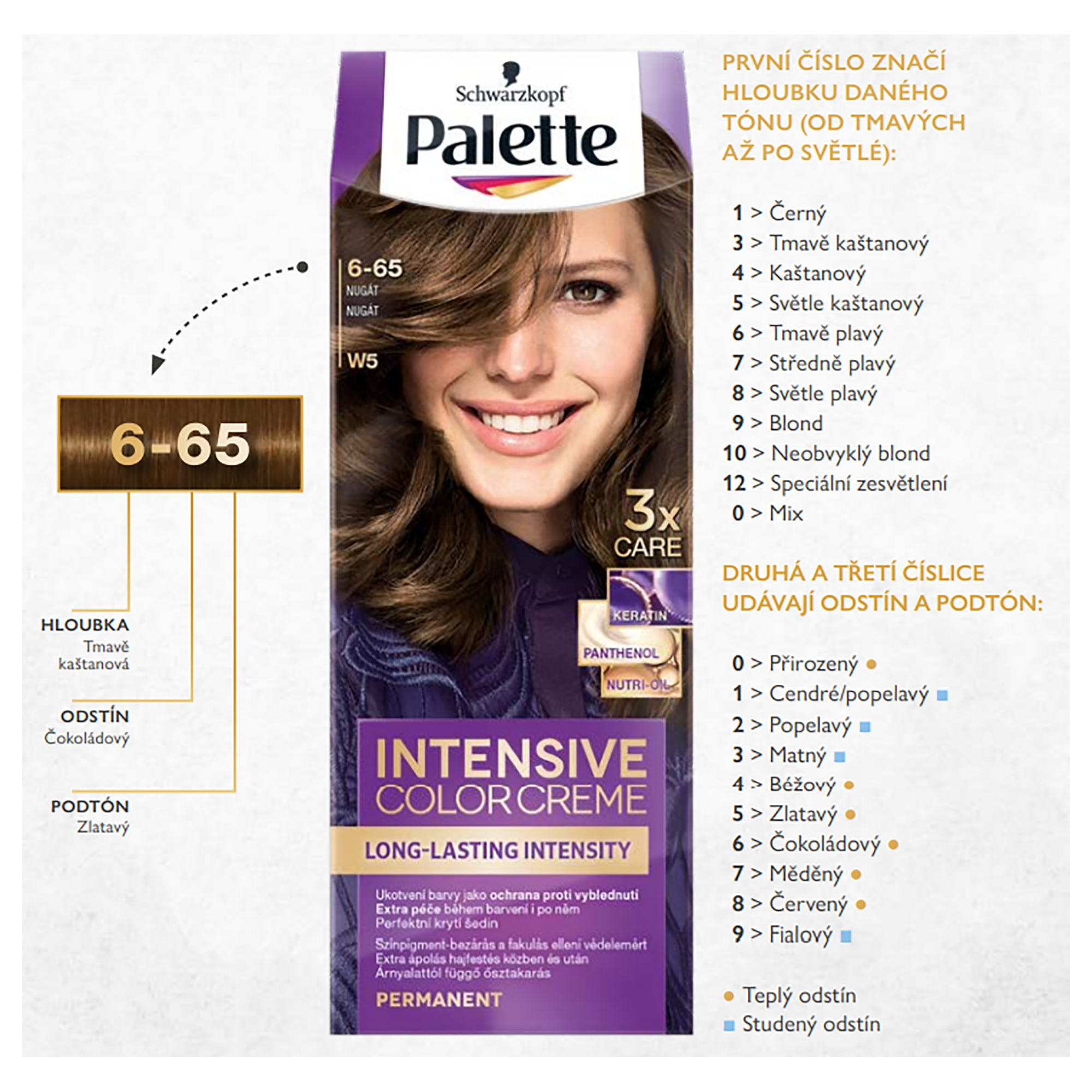 Objevte Palette Intensive Color Creme s MULTI-CARE recepturou pro dlouhotrvající a intenzivní barevný výsledek. Složení s vysoce intenzivními pigmenty proniká hluboko do vlasů a ukotvuje v nich barvu pro ochranu proti vyblednutí. Výsledkem je tak dlouhotrvající intenzita barvy po několik týdnů a 100% krytí šedin. Nová MULTI-CARE receptura díky keratinu, panthenolu a regeneračnímu séru navíc chrání vaše vlasy a poskytuje jim komplexní péči během barvení a po něm. Keratin slouží jako ochranný štít, který vlasy chrání během barvení i po něm. Panthenol vlasy intenzivně vyživuje a viditelně zlepšuje jejich kvalitu. Regenerační sérum je navrženo k obnovení a zjemnění vlasového vlákna. Tento odstín je vhodný pro středně plavé až středně hnědé vlasy. Vhodný i na úplně šedivé vlasy.