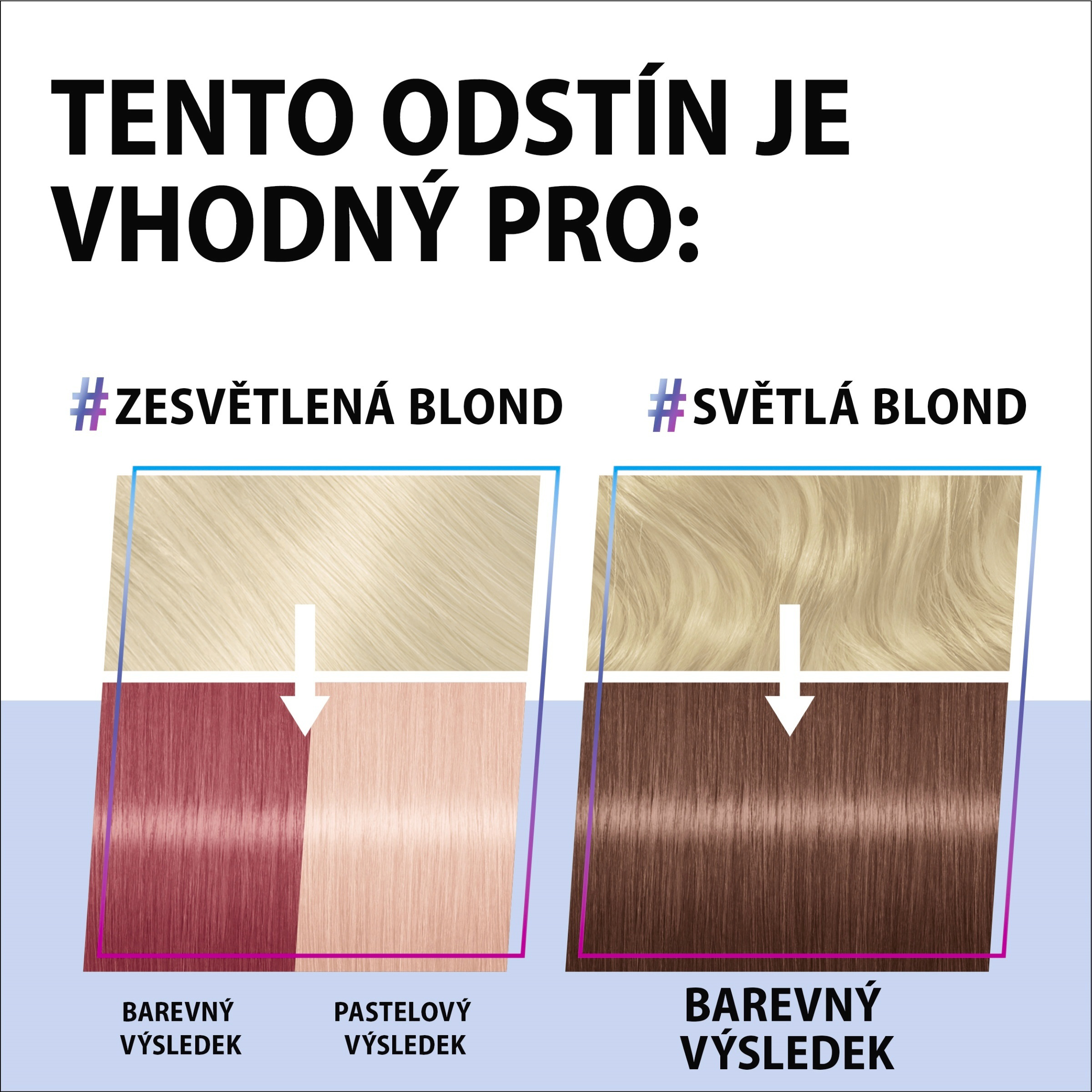 Pro dlouhé nebo husté vlasy doporučujeme použít dvě balení. Tento odstín doporučujeme pro: zesvětlená blond, světle plavá. Zvýrazněný barevný výsledek představuje barvu vlasů modelky na krabičce. Výsledek se může lišit v závislosti na předchozím barvení. Barevný výsledek závisí na přirozené barvě vlasů. Virtuální filtr poskytuje pouze prvotní náznak výsledku obarvení.