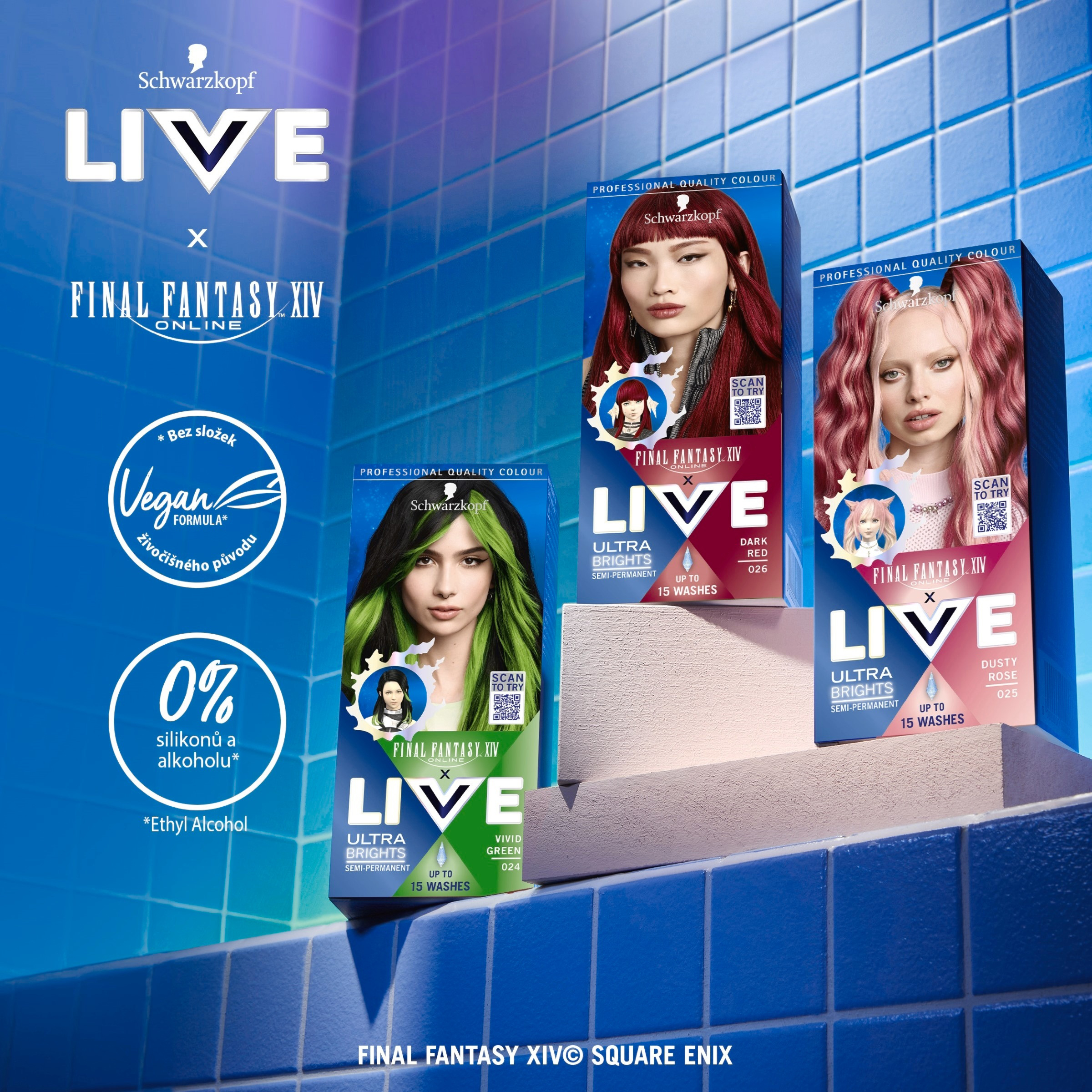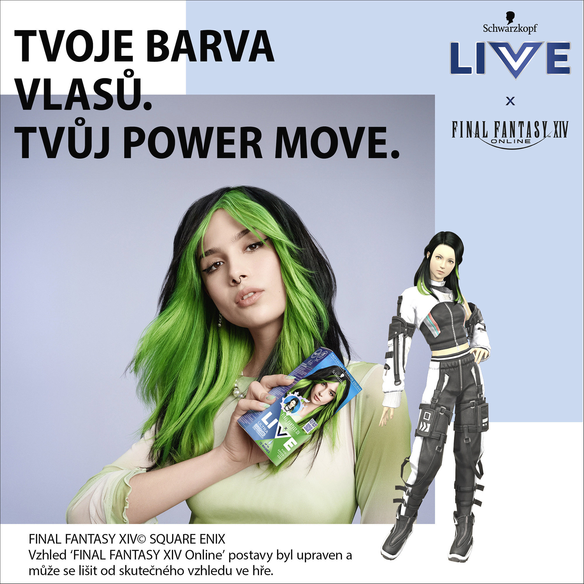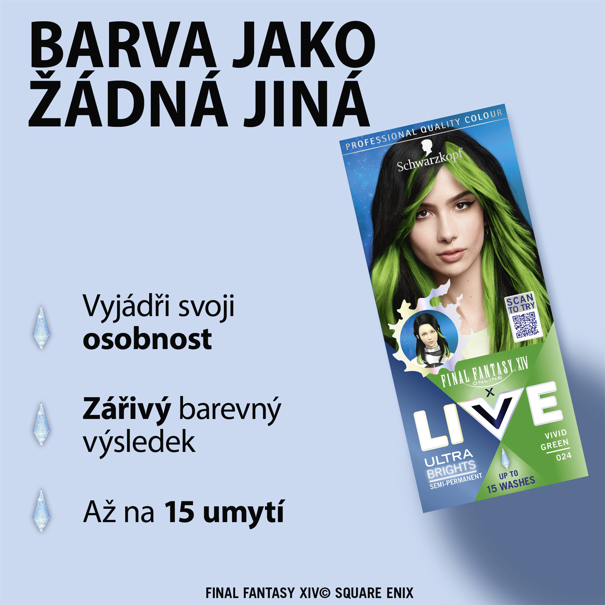Objevte intenzivní zářivost barvy díky obsahu elektrizujících pigmentů. Nebo zkuste pastelový tón, který získáte smícháním barvicího krému s přiloženým balzámem. Vzhled postavy ze hry 'Final Fantasy XIV Online' byl upraven a může se lišit od skutečného vzhledu ve hře