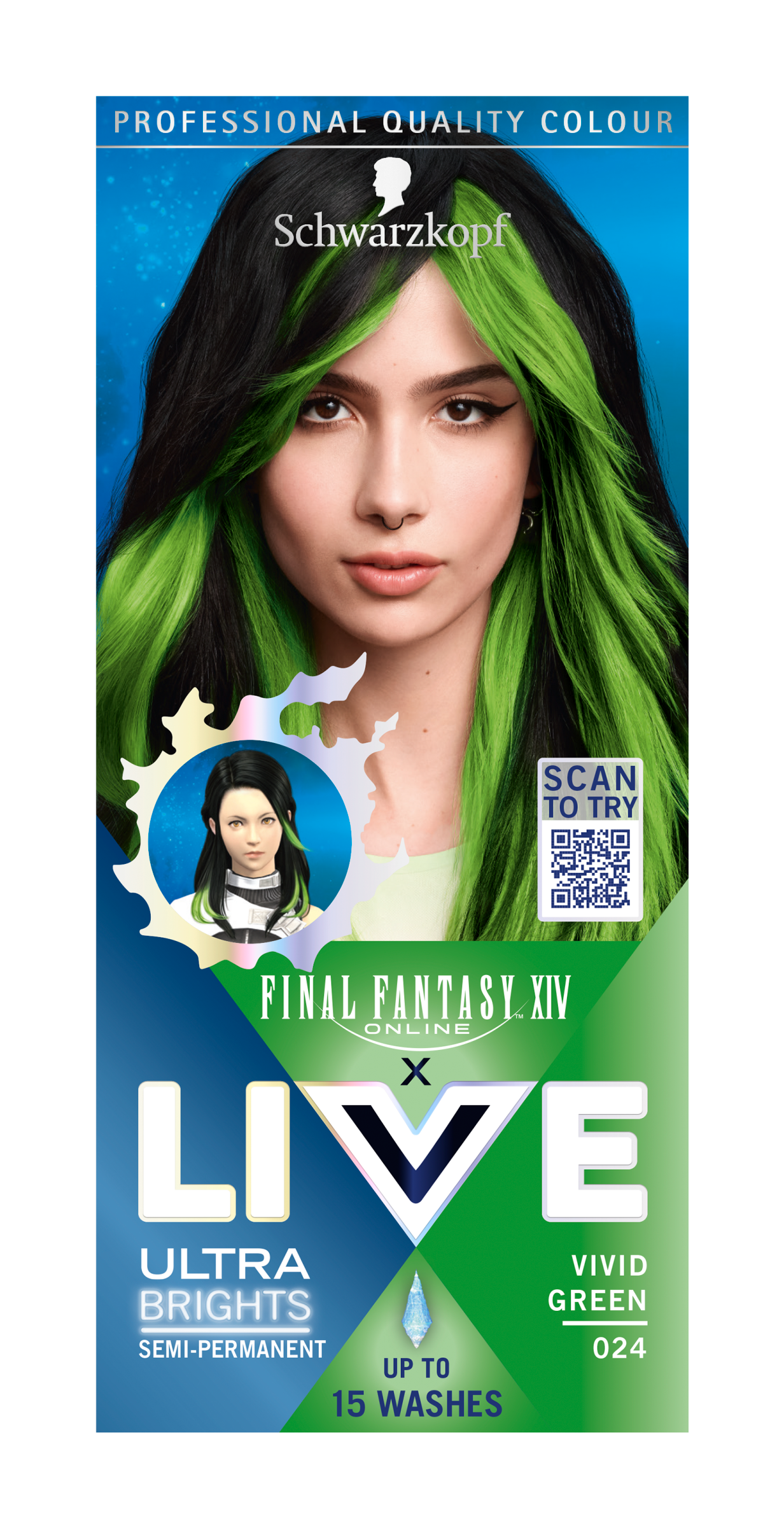 Vyjádřete svoji barevnou kreativitu s barvou na vlasy Schwarzkopf Live Ultra Brights. Tato semi-permanentní barva na vlasy Schwarzkopf Live, která vydrží až 15 umytí, zajistí 2 efekty v 1 produktu. Objevte intenzivní zářivost barev díky obsahu elektrizujících pigmentů, nebo zkuste pastelový tón, který získáte smícháním barvicího krému s přiloženým kondicionérem. Barva byla inspirována hrou Final Fantasy XIV Online. Složení je veganské a vyrobené s 0 % silikonů a alkoholu (ethanolu) a má certifikaci FSC. Tato zářivě zelená barva na vlasy se doporučuje pro odbarvené blond vlasy. Pokud máte tmavší vlasy, doporučujeme je zesvětlit pomocí Schwarzkopf Live Intense Bleach zesvětlovače pro ještě zářivější barevný výsledek.