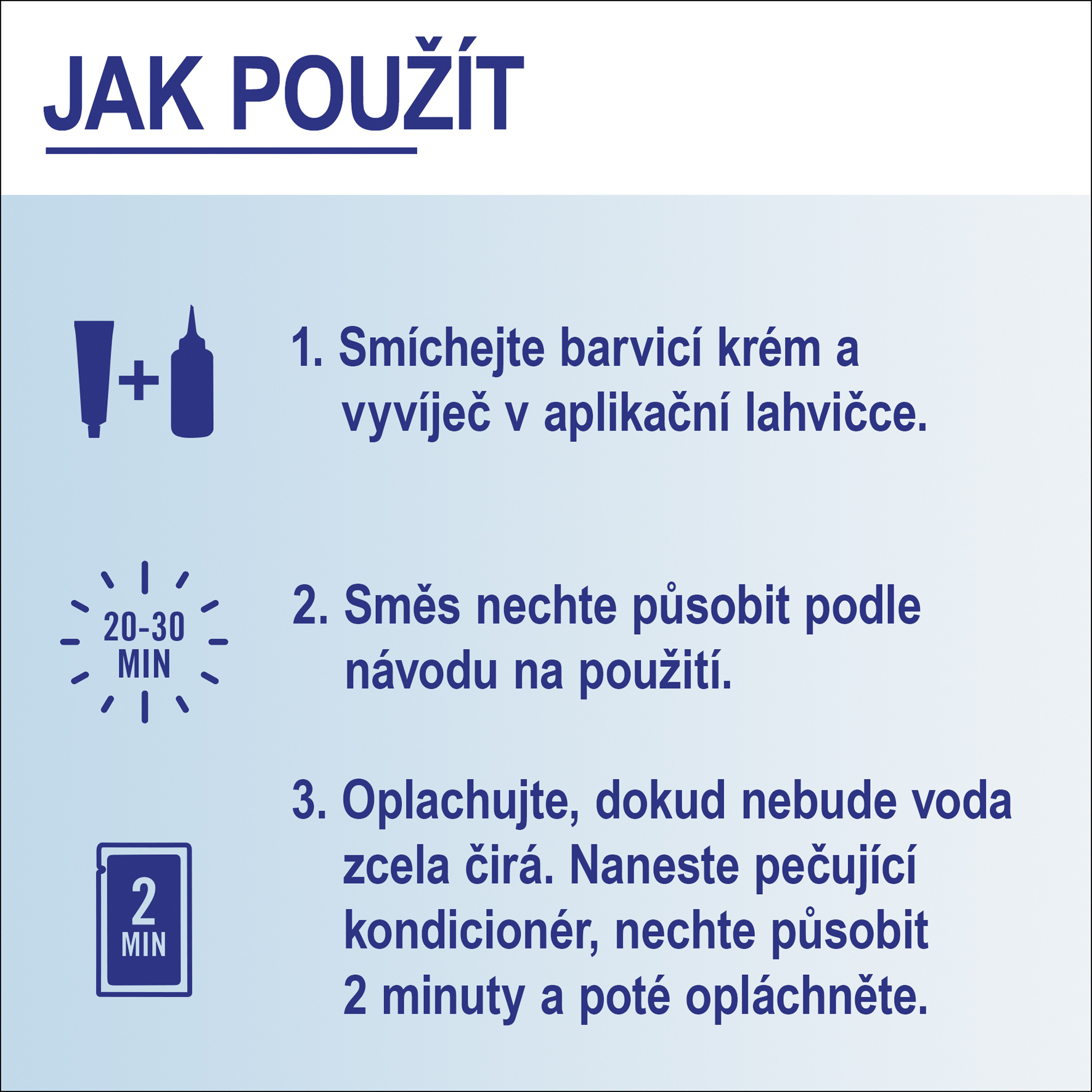 Vždy proveďte varovný test na alergii 48 hodin před každým použitím produktu a důkladně se řiďte bezpečnostními pokyny. Barvy na vlasy mohou způsobit těžké alergické reakce. Přečtěte si instrukce a řiďte se jimi. Tento výrobek není určen k používání pro osoby mladší 16 let. Dočasné tetování černou hennou může zvýšit riziko alergie. Nebarvěte si vlasy, pokud: - máte vyrážku na obličeji nebo citlivou, podrážděnou a poškozenou pokožku hlavy, - jste již někdy zaznamenali jakoukoliv reakci po barvení vlasů, - jste v minulosti zaznamenali reakci na dočasné tetování černou hennou. Obsahuje peroxid vodíku a resorcinol. Nepoužívejte k barvení řas a obočí. Po použití vlasy důkladně opláchněte. Složení výrobku - viz spodek krabičky. Proveďte varovný test na alergii 48 hodin před každým použitím barvy na vlasy (v přiloženém návodu k použití), a to i v případě, že jste barvy na vlasy používali již dříve. Proto nezapomeňte zakoupit výrobek 48 hodin před samotným použitím. V případě jakýchkoliv reakcí či pochybností se, prosím, ještě před použitím jakékoliv barvy na vlasy poraďte s lékařem. Zamezte styku s očima. Při zasažení očí okamžitě vypláchněte vodou. Používejte vhodné rukavice. Uchovávejte mimo dosah dětí.
