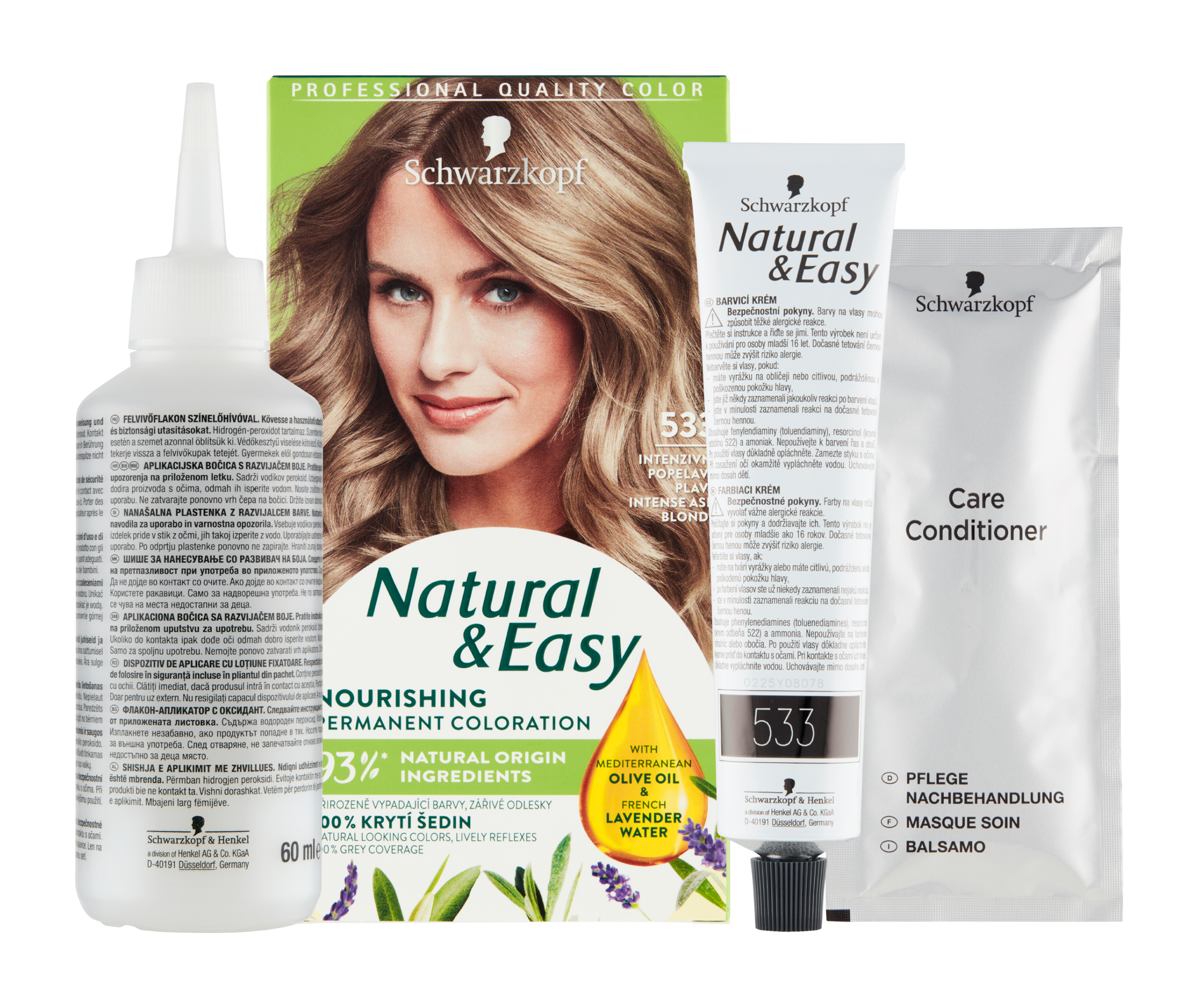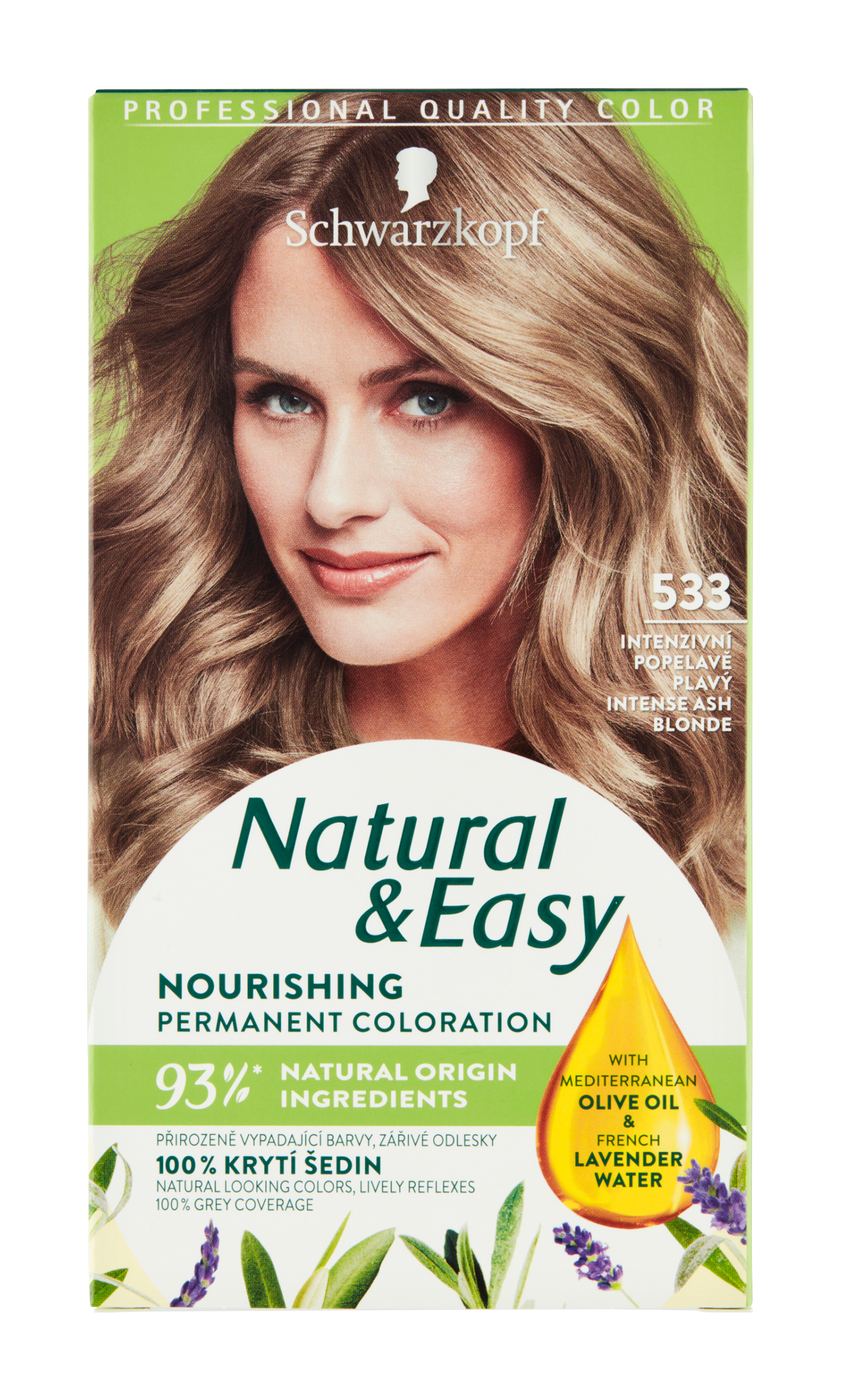 Vyživující permanentní barva na vlasy Natural & Easy s 93%* ingrediencí přírodního původu, zintenzivňuje vaši přirozenou barvu vlasů a dodává vlasům jemný lesk. Ostatní ingredience představují 7% složení, které se stará o perfektní barevný výsledek. Náš vyživující barvicí krém s francouzskou levandulovou vodou obsahuje 3 předmíchané tóny a dodává přirozeně vypadající, vícetónový barevný výsledek a 100% krytí šedin.