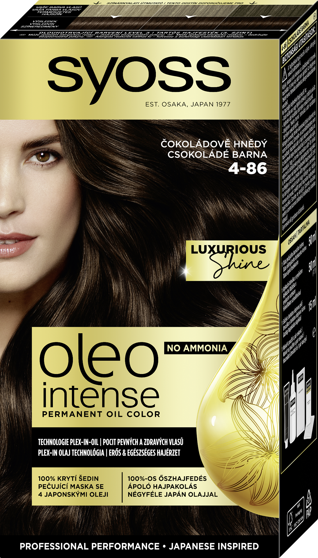 Objevte intenzivní, dlouhotrvající barvu s bohatým čokoládově hnědým odstínem díky permanentní barvě na vlasy Syoss Oleo Intense 4-86. Olejem posílená receptura bez amoniaku je navržená pro šetrné a efektivní barvení, které zajistí 100% krytí šedin a zároveň zanechá vlasy hebké, lesklé a zdravě vypadající. Maska s technologií plex-in-oil po procesu barvení obaluje vlasová vlákna jako štít, pro obnovu síly vlasů a zlepšení textury vlasů. Bohatá maska obsahuje kombinaci 4 japonských olejů. Dodává vašim vlasům závěrečnou výživu, zanechává je sametově hebké a plné luxusního lesku. Pečující receptura pomáhá barevným pigmentům proniknout hluboko do vlasových vláken pro sytou a dlouhotrvající barvu.