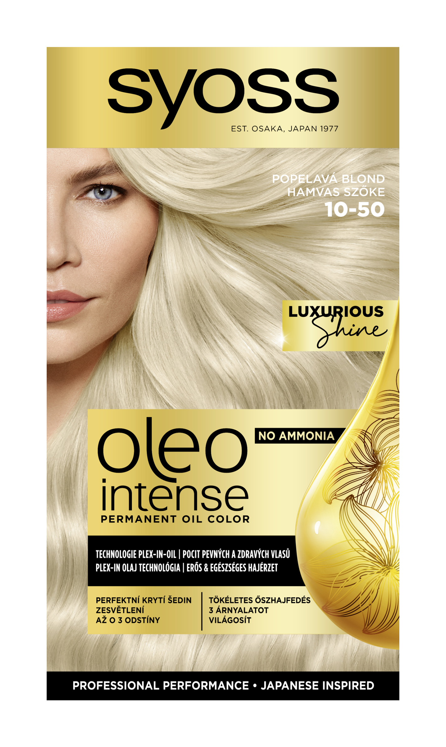 Objevte intenzivní, dlouhotrvající barvu s bohatým popelavě blond odstínem díky permanentní barvě na vlasy Syoss Oleo Intense 10-50. Olejem posílená receptura bez amoniaku je navržená pro šetrné a efektivní barvení, které zajistí 100% krytí šedin a zároveň zanechá vlasy hebké, lesklé a zdravě vypadající. Maska s technologií plex-in-oil po procesu barvení obaluje vlasová vlákna jako štít, pro obnovu síly vlasů a zlepšení textury vlasů. Bohatá maska obsahuje kombinaci 4 japonských olejů. Dodává vašim vlasům závěrečnou výživu, zanechává je sametově hebké a plné luxusního lesku. Pečující receptura pomáhá barevným pigmentům proniknout hluboko do vlasových vláken pro sytou a dlouhotrvající barvu.