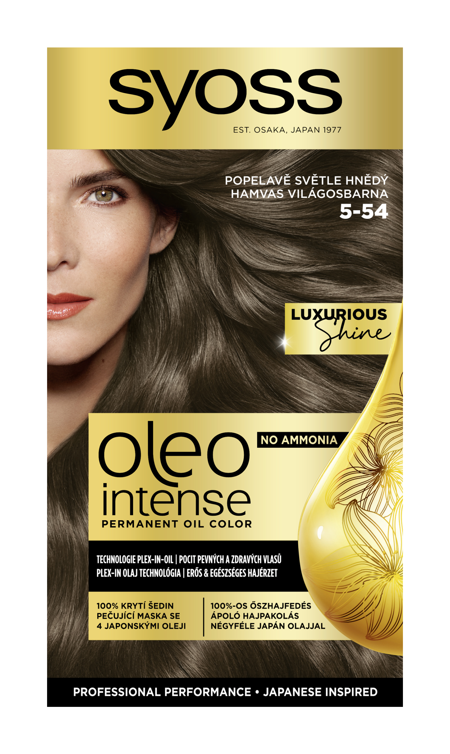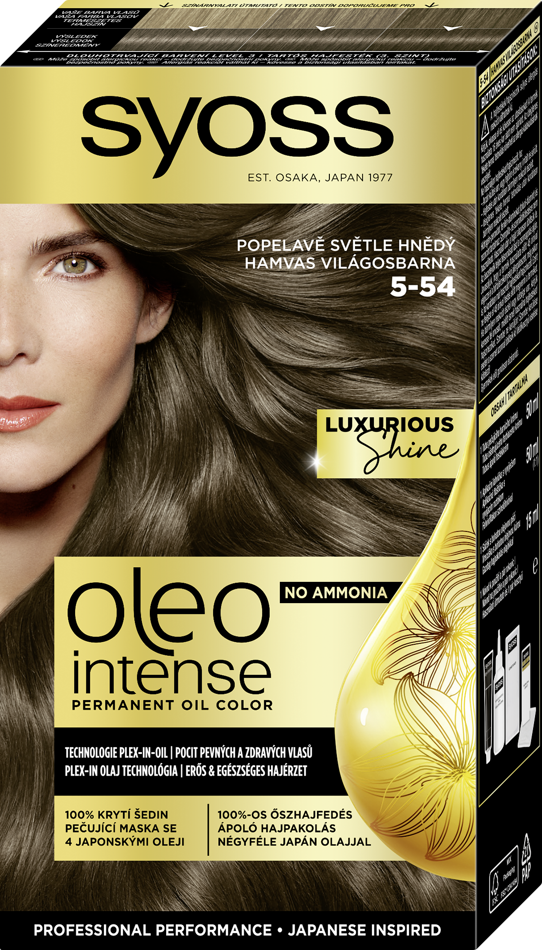 Objevte intenzivní, dlouhotrvající barvu s bohatým popelavě světle hnědým odstínem díky permanentní barvě na vlasy Syoss Oleo Intense 5-54. Olejem posílená receptura bez amoniaku je navržená pro šetrné a efektivní barvení, které zajistí 100% krytí šedin a zároveň zanechá vlasy hebké, lesklé a zdravě vypadající. Maska s technologií plex-in-oil po procesu barvení obaluje vlasová vlákna jako štít, pro obnovu síly vlasů a zlepšení textury vlasů. Bohatá maska obsahuje kombinaci 4 japonských olejů. Dodává vašim vlasům závěrečnou výživu, zanechává je sametově hebké a plné luxusního lesku. Pečující receptura pomáhá barevným pigmentům proniknout hluboko do vlasových vláken pro sytou a dlouhotrvající barvu.
