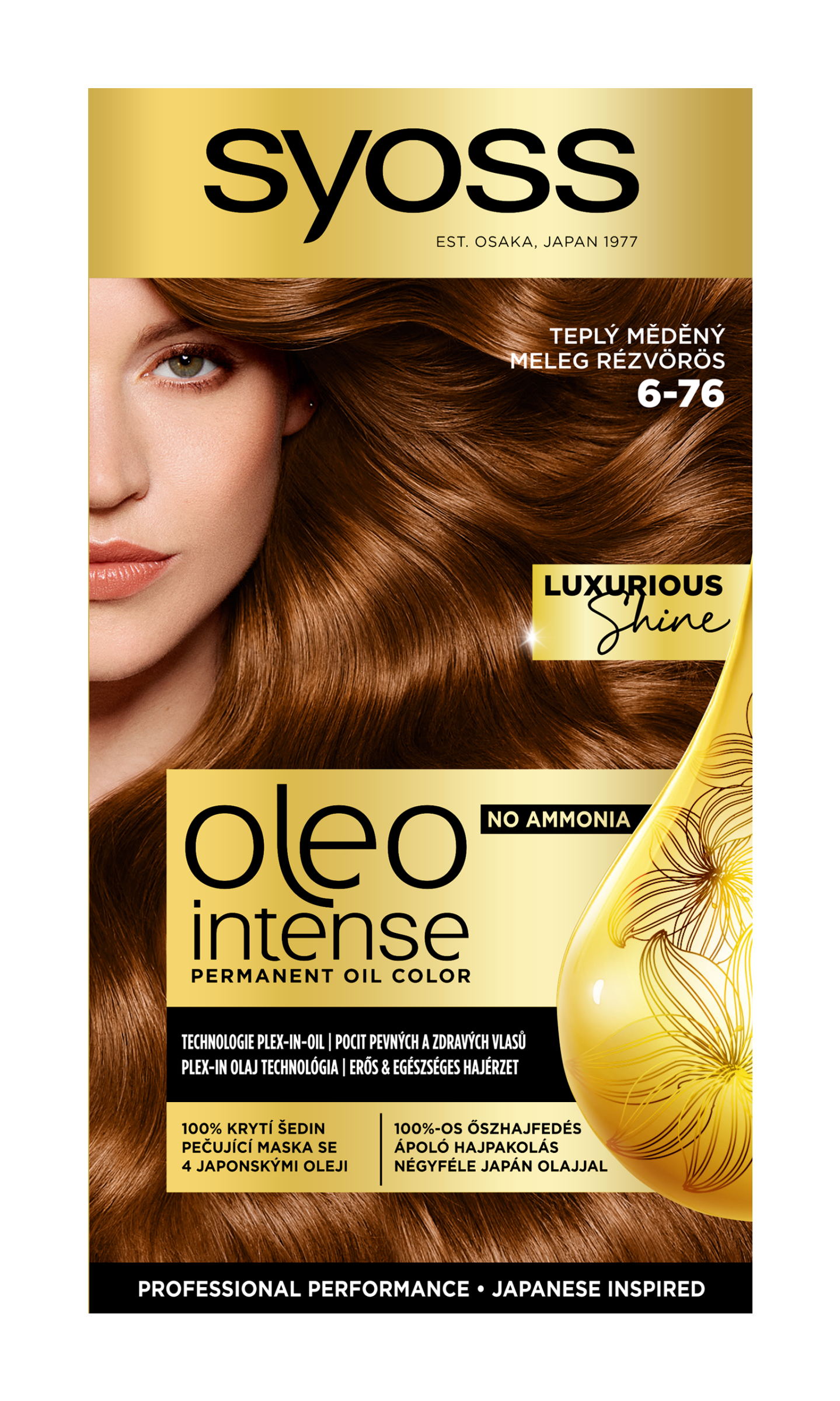 Objevte intenzivní, dlouhotrvající barvu s bohatým teple měděným odstínem díky permanentní barvě na vlasy Syoss Oleo Intense 6-76. Olejem posílená receptura bez amoniaku je navržená pro šetrné a efektivní barvení, které zajistí 100% krytí šedin a zároveň zanechá vlasy hebké, lesklé a zdravě vypadající. Maska s technologií plex-in-oil po procesu barvení obaluje vlasová vlákna jako štít, pro obnovu síly vlasů a zlepšení textury vlasů. Bohatá maska obsahuje kombinaci 4 japonských olejů. Dodává vašim vlasům závěrečnou výživu, zanechává je sametově hebké a plné luxusního lesku. Pečující receptura pomáhá barevným pigmentům proniknout hluboko do vlasových vláken pro sytou a dlouhotrvající barvu.