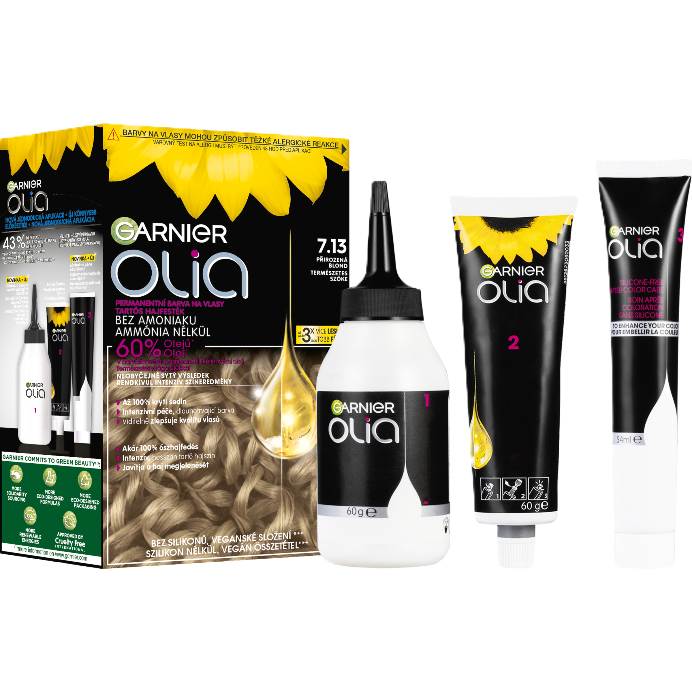Permanentní barva na vlasy Garnier Olia 7.13 Přirozená blond poskytuje 100% krytí šedin a dlouhotrvající, přirozeně vypadající barvu plnou lesku. Unikátní složení s 60 % květinových olejů bez amoniaku zajišťuje šetrné barvení a komfort pokožky hlavy, zatímco olejová technologie pomáhá pronikat barvě hluboko do vlasového vlákna pro intenzivní výsledek. Vlasy jsou po barvení viditelně kvalitnější, hebké a vyživené s až 2× více lesku. Veganské složení bez silikonů navíc podporuje přirozený vzhled a zdravý pocit vlasů.