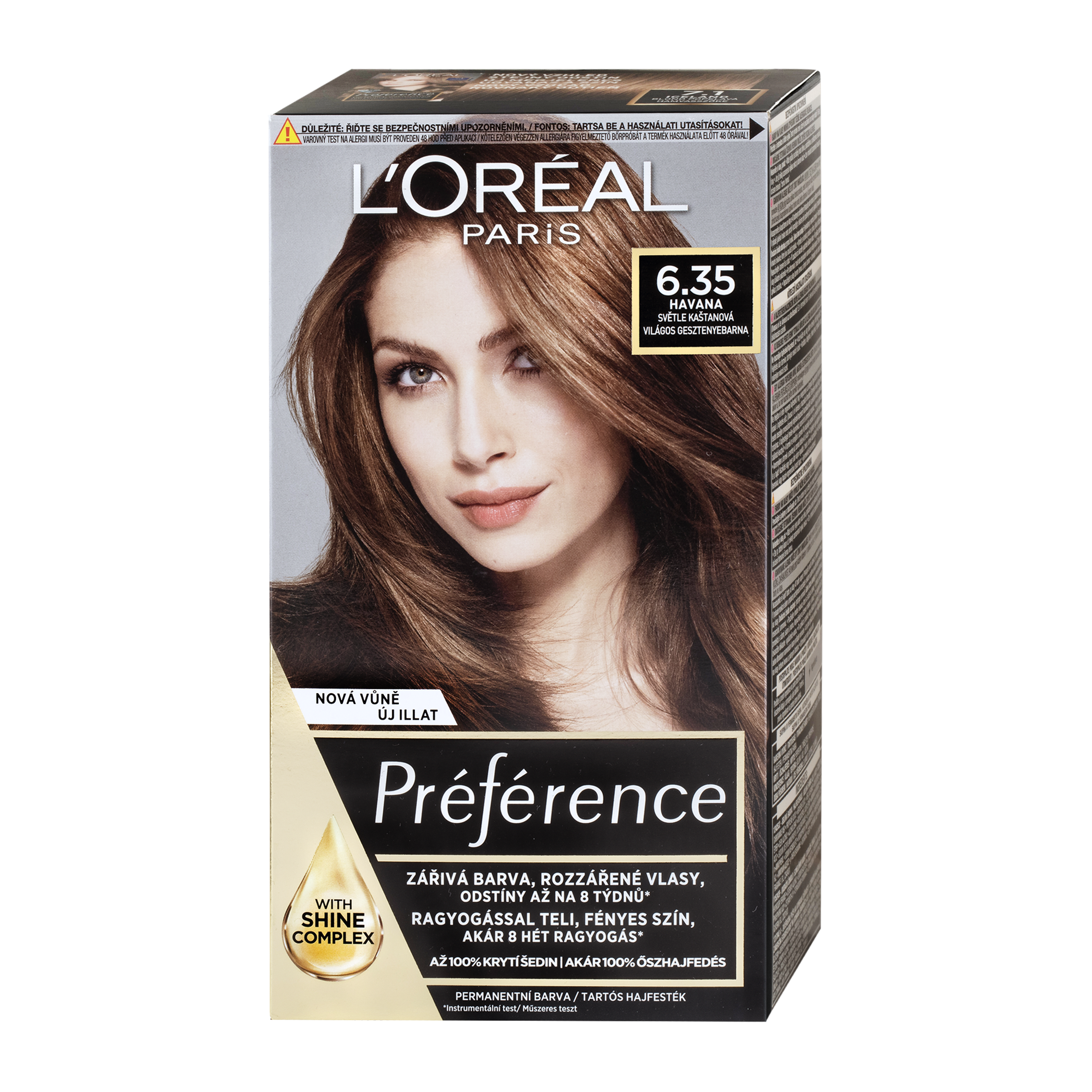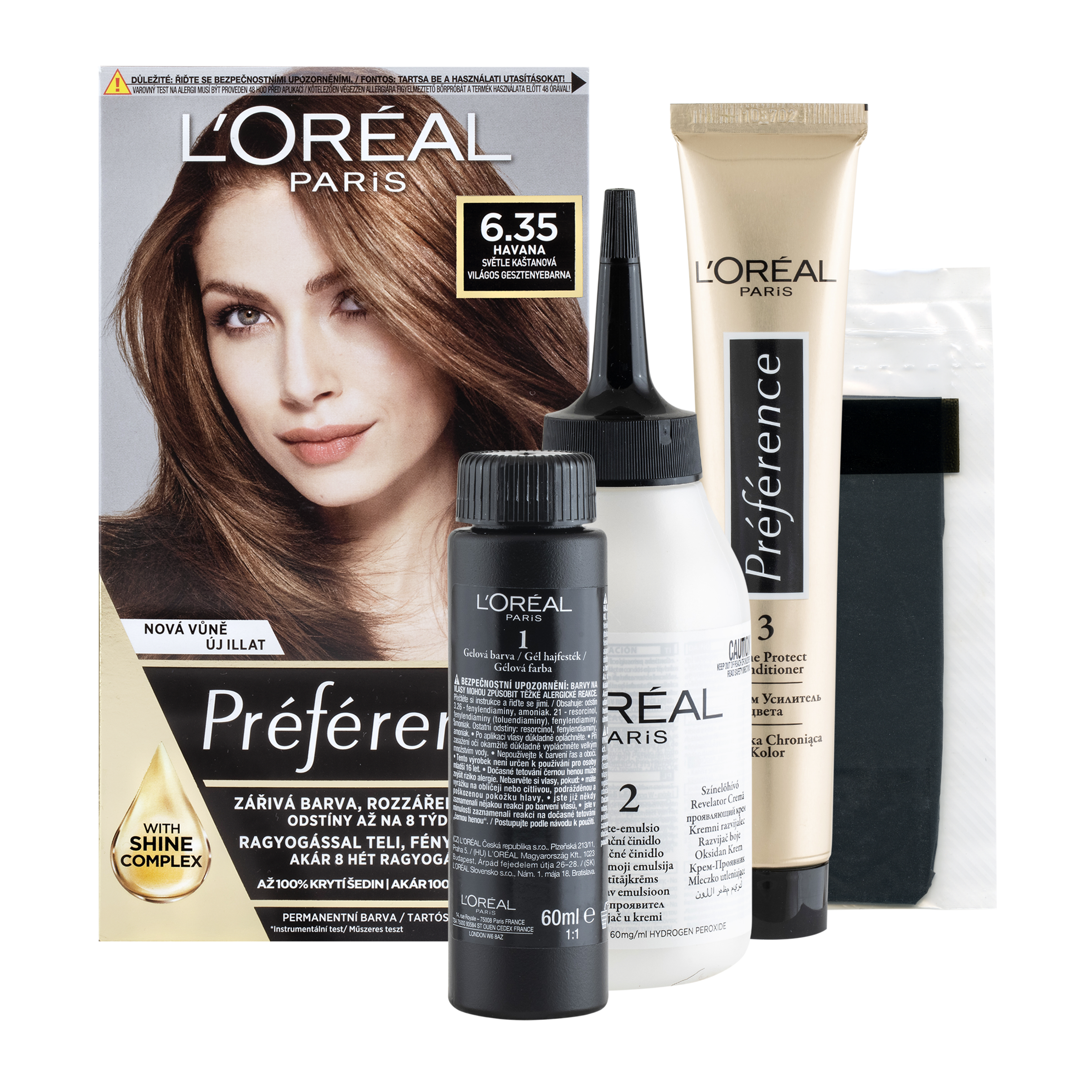 Luxusní permanentní barva na vlasy L’Oréal Paris Préférence dodává vlasům intenzivní barvu a oslnivý lesk. Zářivě lesklé vlasy vydrží až po dobu osmi týdnů. Složení je obohacené o Hi-Shine Complex a obsahuje odolné barvící složky. Až 100% kryje šediny. Balení obsahuje i závěrečnou vyživující ochrannou péči s vitaminem E.