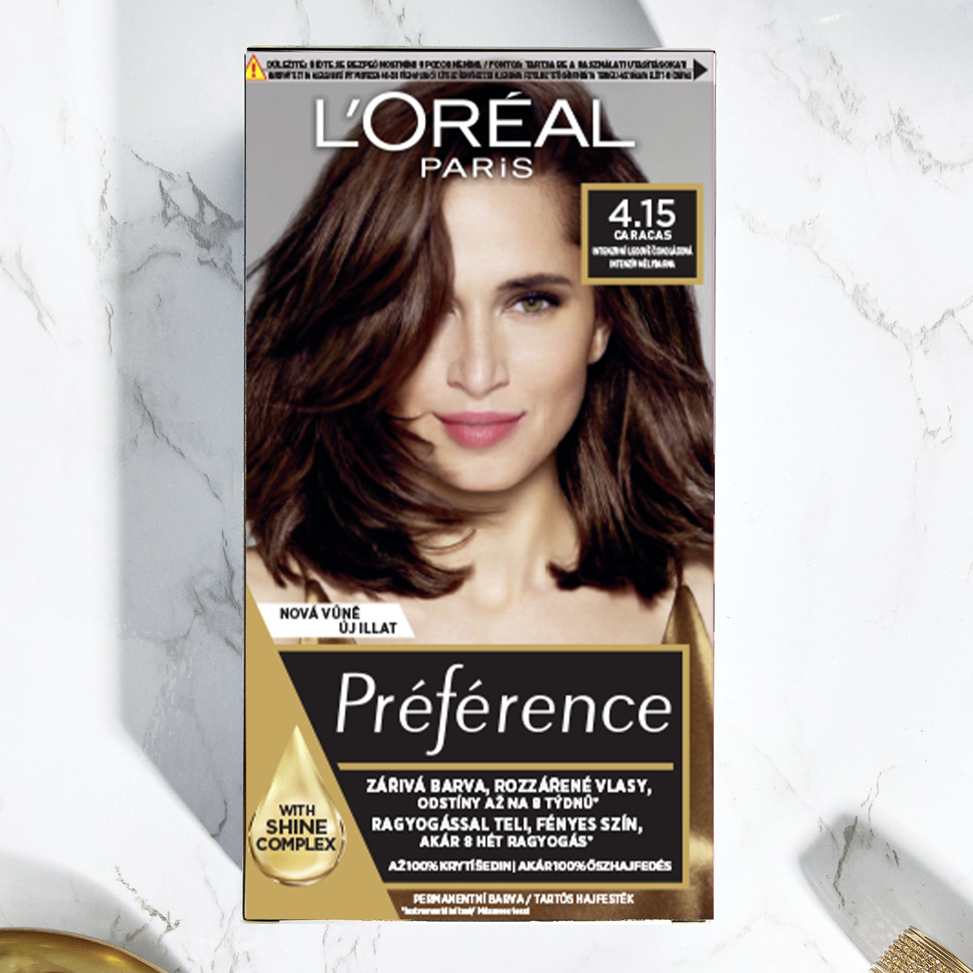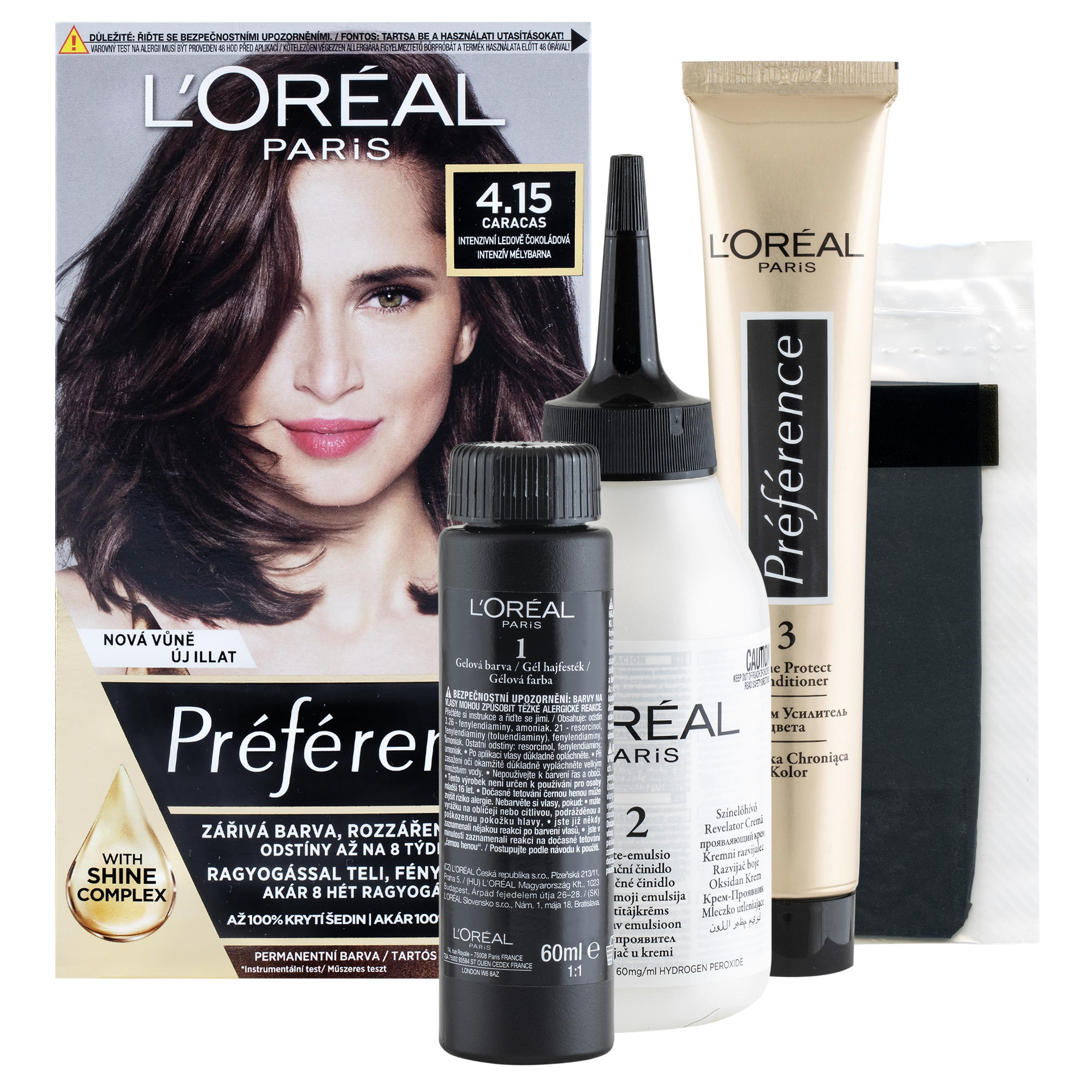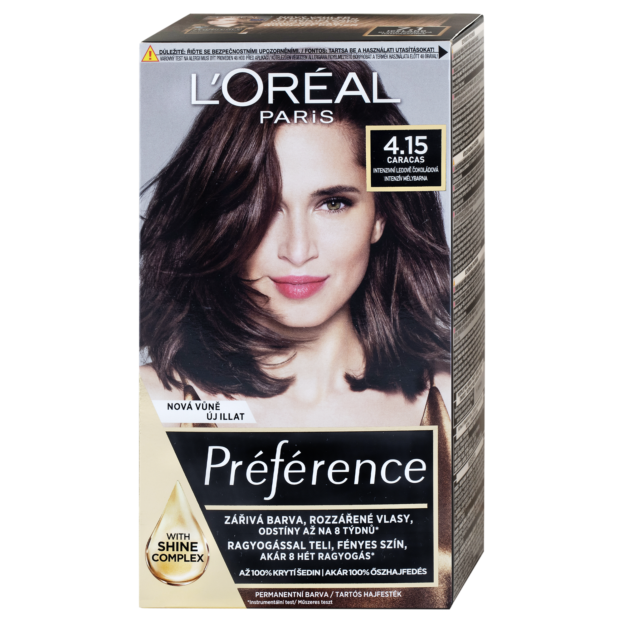 Luxusní barva na vlasy L’Oréal Paris Préférence 4.15 Caracas-Intenzivní ledová čokoládová dodá vašim vlasům oslnivý lesk. Zářivě lesklé vlasy si můžete užívat až po dobu osmi týdnů. Složení je obohacené o Hi-Shine Complex a obsahuje vysoko odolné barvící složky. Balení obsahuje i závěrečnou péči, která je obohacená UV filtrem a vitaminem E. Vaše vlasy tak zůstanou lesklé a hedvábně jemné. S ultra intenzivní dlouhotrvající barvou Préférence si dopřejete luxus, který si vaše vlasy zaslouží.
