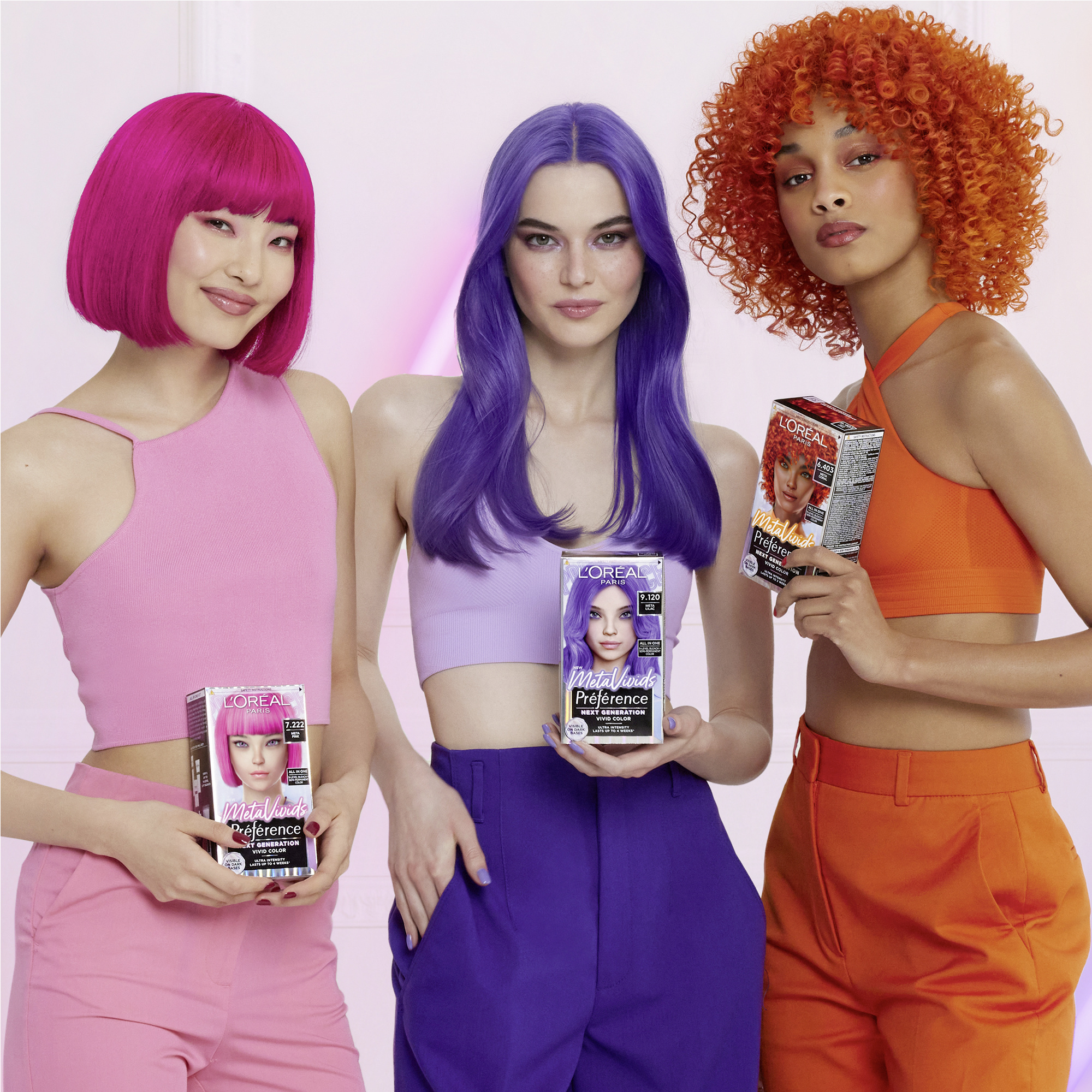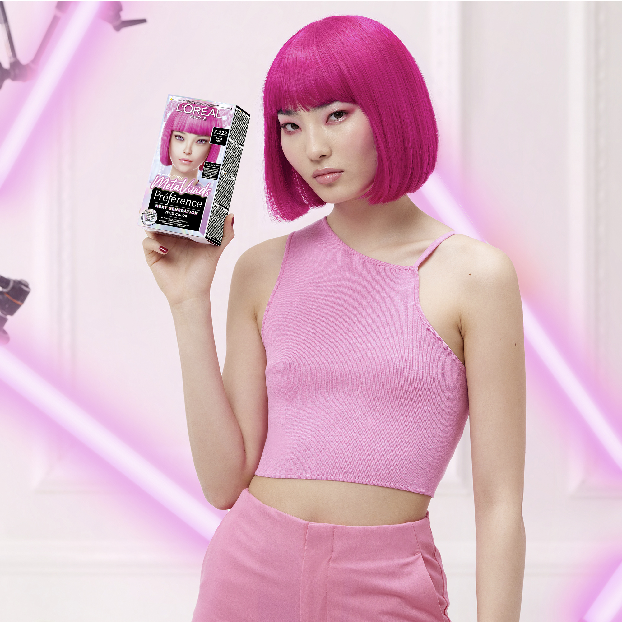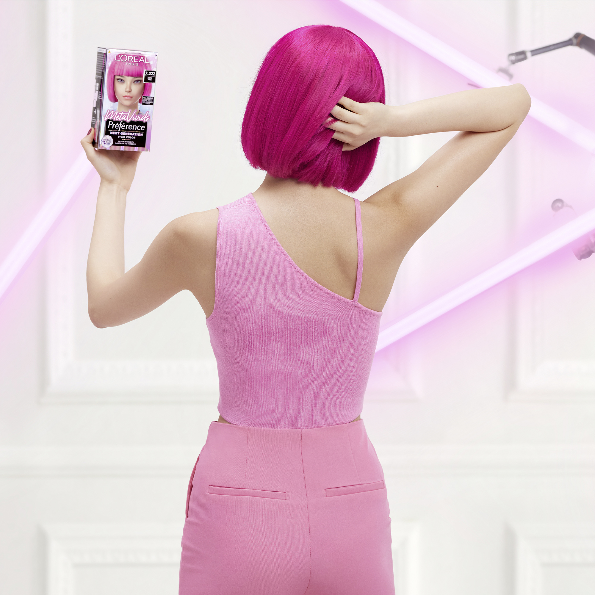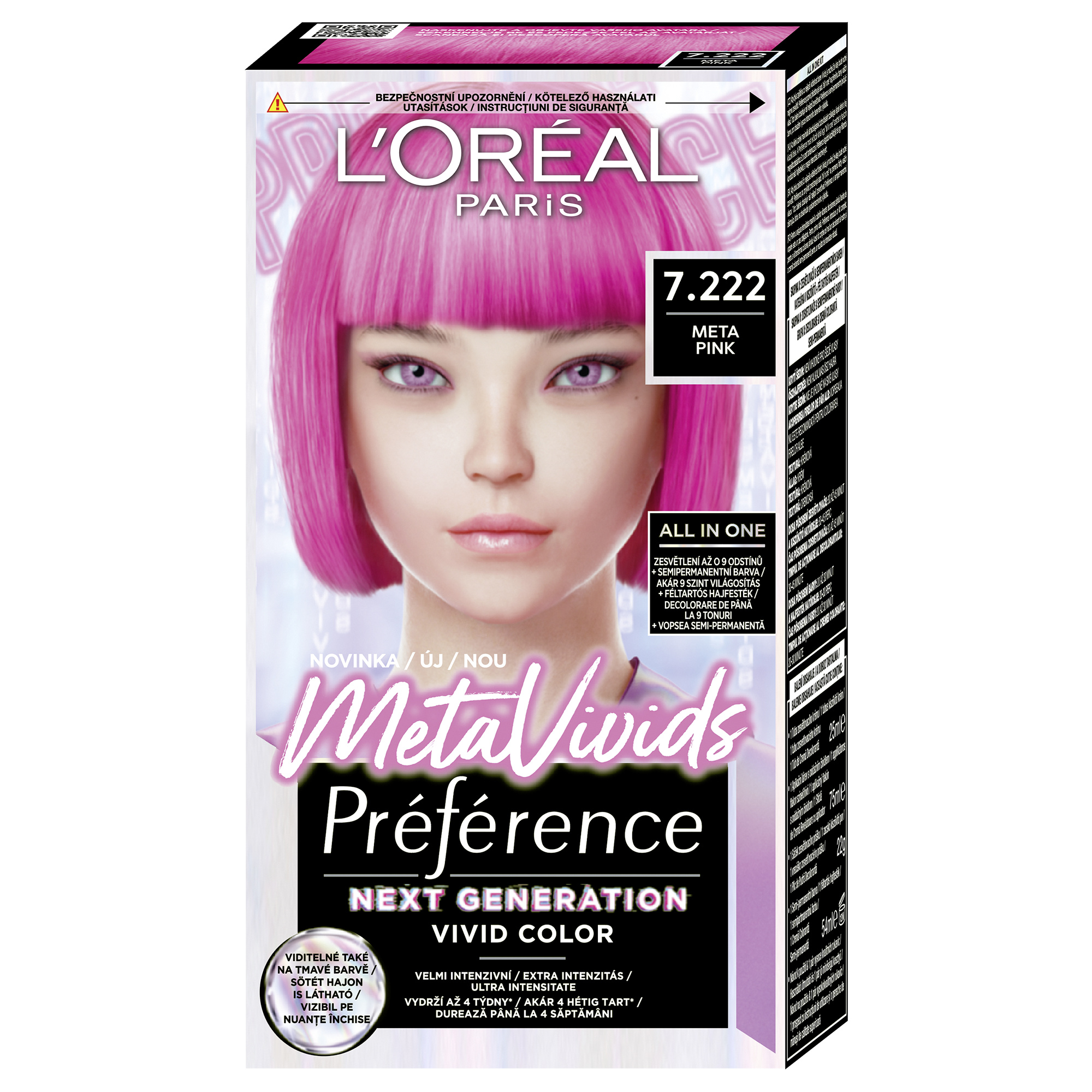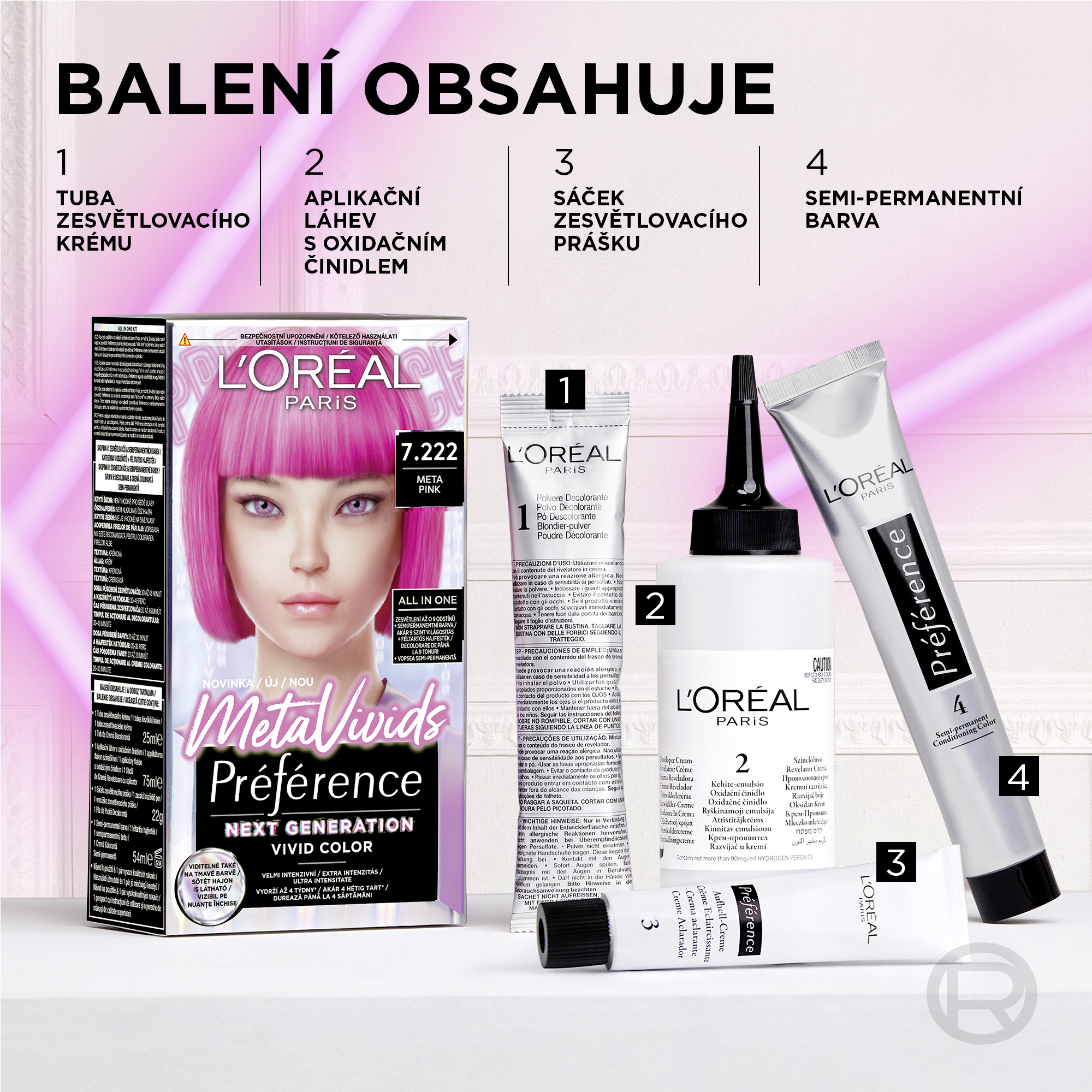 Meta Vivids barvy jsou inspirovány virtuálním svěrem a přichzejí v nejpopulárnějších pestrobarevných odstínech. NOVÉ ALL IN ONE balení přináší Préférence Zesvětlovač a semipermanentní barvu v jednom balení. Díky této kombinaci jsou Préférence Meta Vivids barvy vhodné také pro tmavé vlasy.