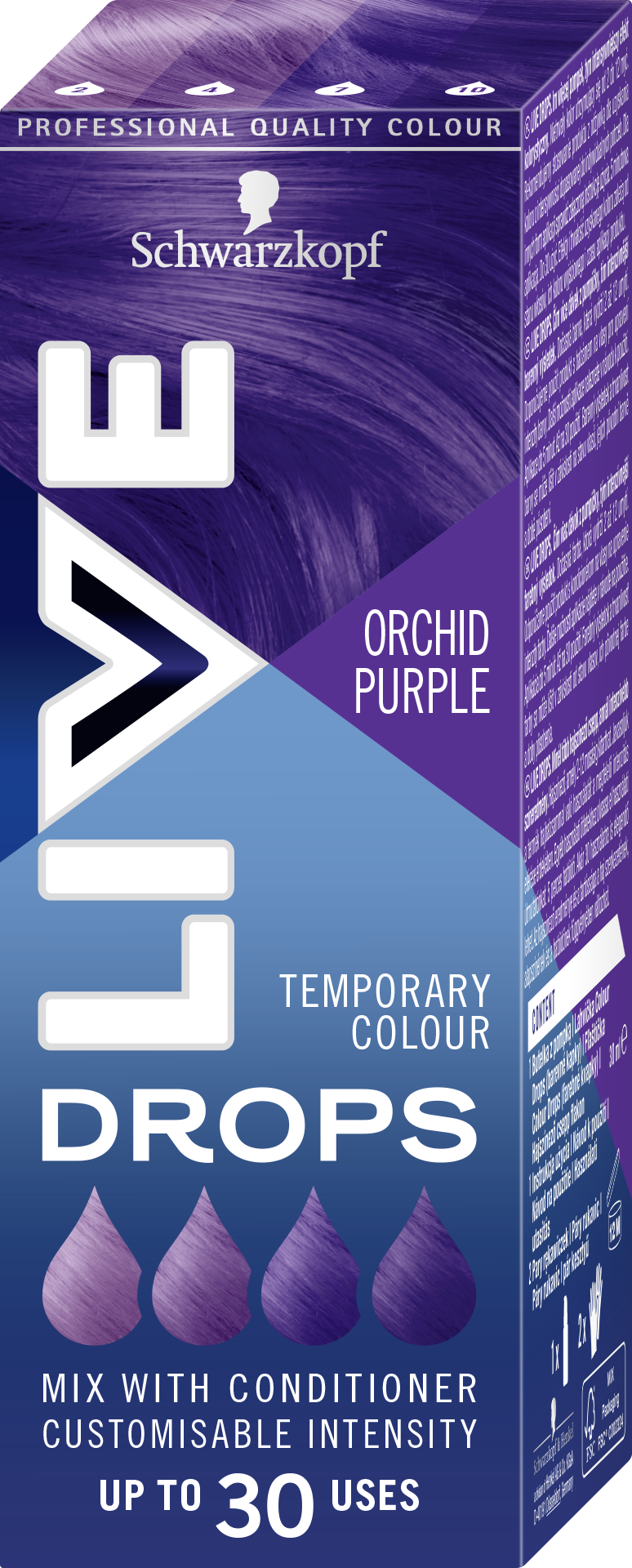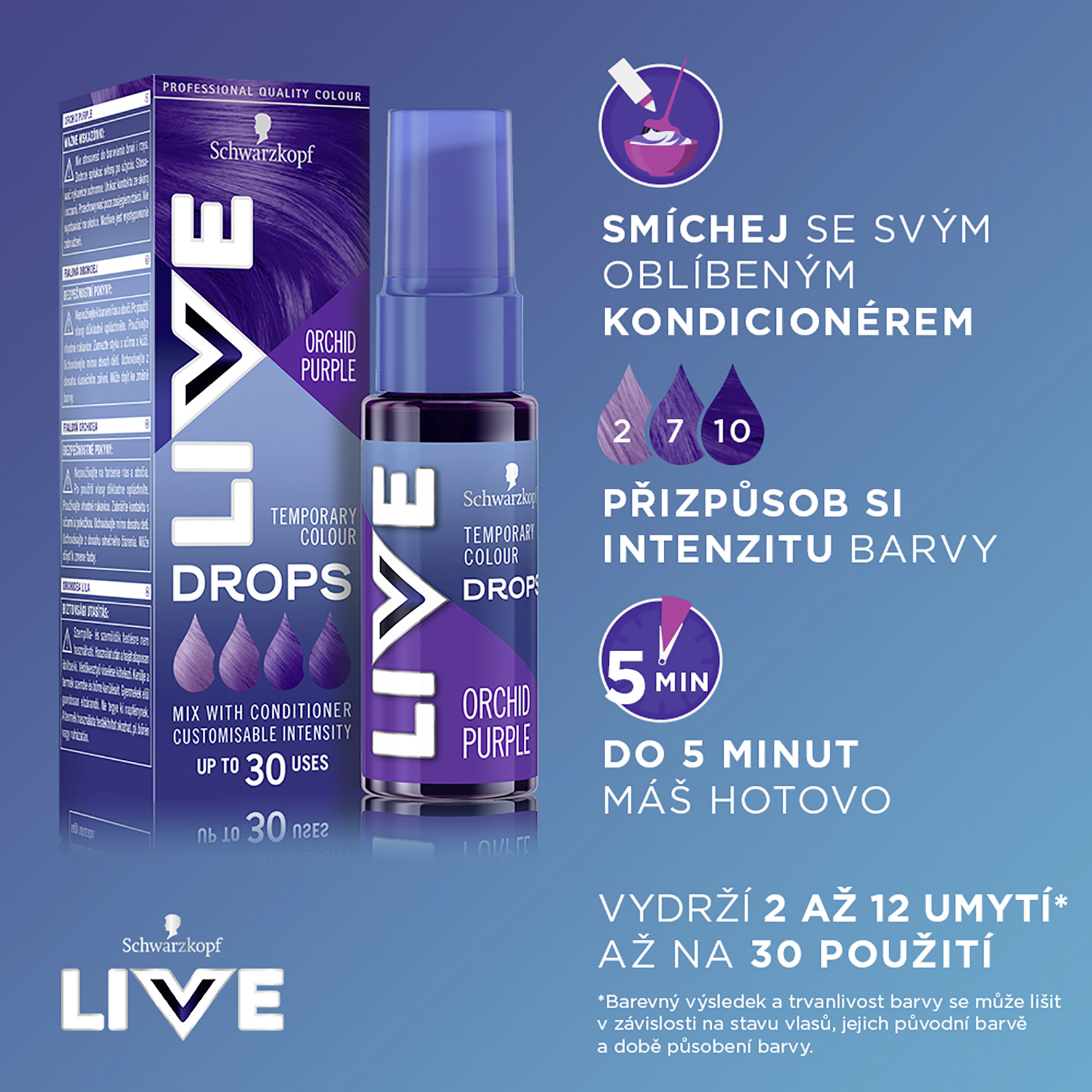 Od pastelové po zářivou - buďte kreativní a rozhodněte se, s jakým barevným odstínem zazáříte! Vysoce pigmentované barvicí kapky Schwarzkopf Live Drops je řada dočasných barev na vlasy s pomocí kterých si vytvoříte jedinečný barevný odstín podle svého stylu. Snadno a rychle do 5 minut. Stačí smíchat s vaším oblíbeným balzámem na vlasy a přizpůsobit si intenzitu barvy - čím více kapek (dávek z pumpičky), tím intenzivnější barevný výsledek. Vyberte si jeden z dostupných odstínů, anebo míchejte odstíny Live Drops navzájem a vytvořte si tak svůj vlastní. Receptura je veganská bez obsahu silikonů. Barevný výsledek vydrží 2 až 12 umytí*. Lahvička je až na 30 použití. Tento odstín je vhodný pro zesvětlené blond až tmavě plavé vlasy. *Barevný výsledek a výdrž barvy se může lišit v závislosti na stavu vlasů, jejich původní barvě a době působení barvy.