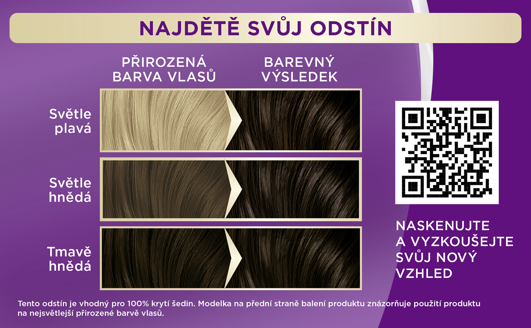 Rozsah použití viz obal. Vhodný i na úplně šedivé vlasy. Modelka na přední straně znázorňuje barevný výsledek na zvýrazněné přirozené barvě vlasů.