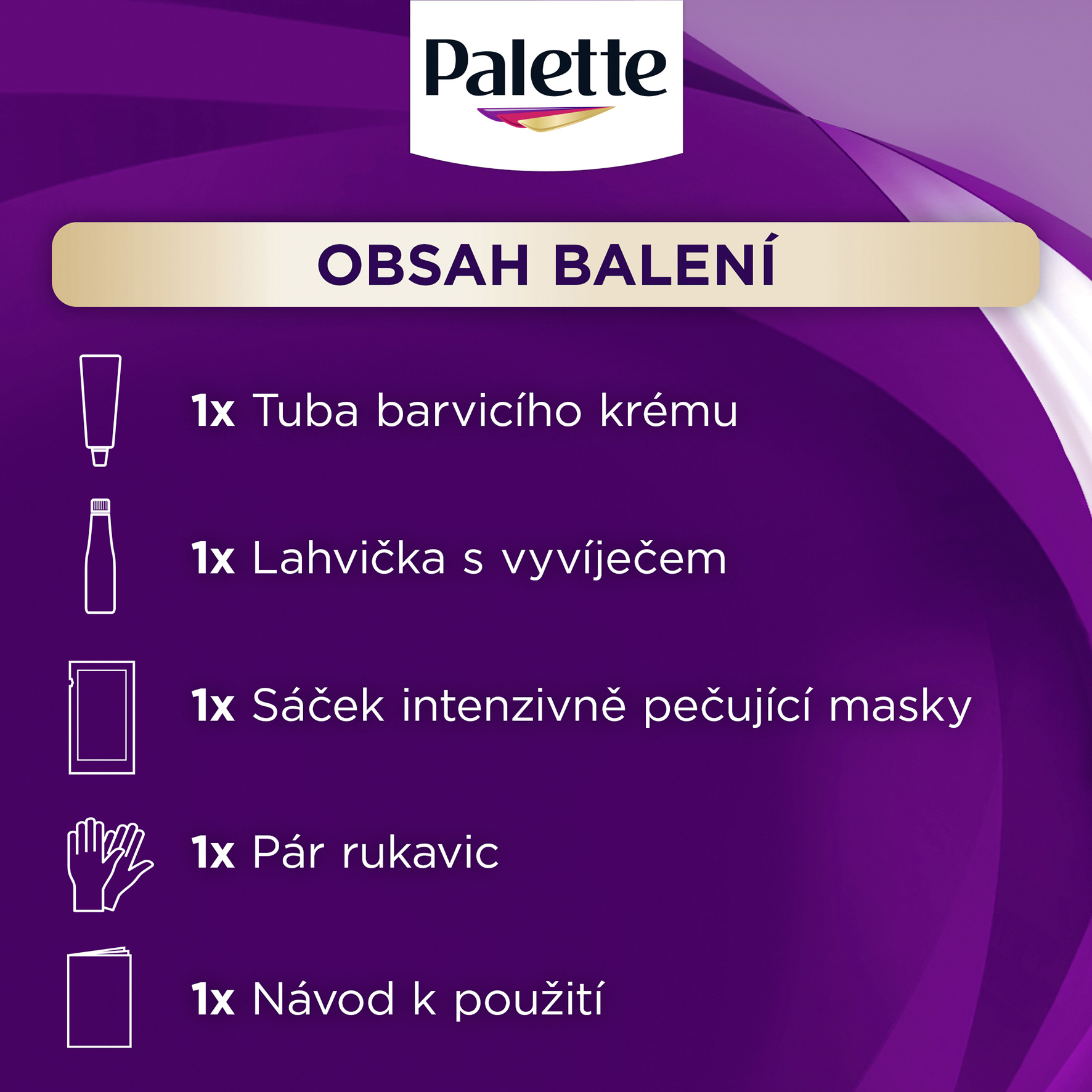 Objevte Palette Intensive Color Creme s MULTI-CARE recepturou pro dlouhotrvající a intenzivní barevný výsledek. Složení s vysoce intenzivními pigmenty proniká hluboko do vlasů a ukotvuje v nich barvu pro ochranu proti vyblednutí. Výsledkem je tak dlouhotrvající intenzita barvy po několik týdnů a 100% krytí šedin. Nová MULTI-CARE receptura díky keratinu, panthenolu a regeneračnímu séru navíc chrání vaše vlasy a poskytuje jim komplexní péči během barvení a po něm. Keratin slouží jako ochranný štít, který vlasy chrání během barvení i po něm. Panthenol vlasy intenzivně vyživuje a viditelně zlepšuje jejich kvalitu. Regenerační sérum je navrženo k obnovení a zjemnění vlasového vlákna. Tento odstín je vhodný pro světle plavé až černohnědé vlasy. Vhodný i na úplně šedivé vlasy.