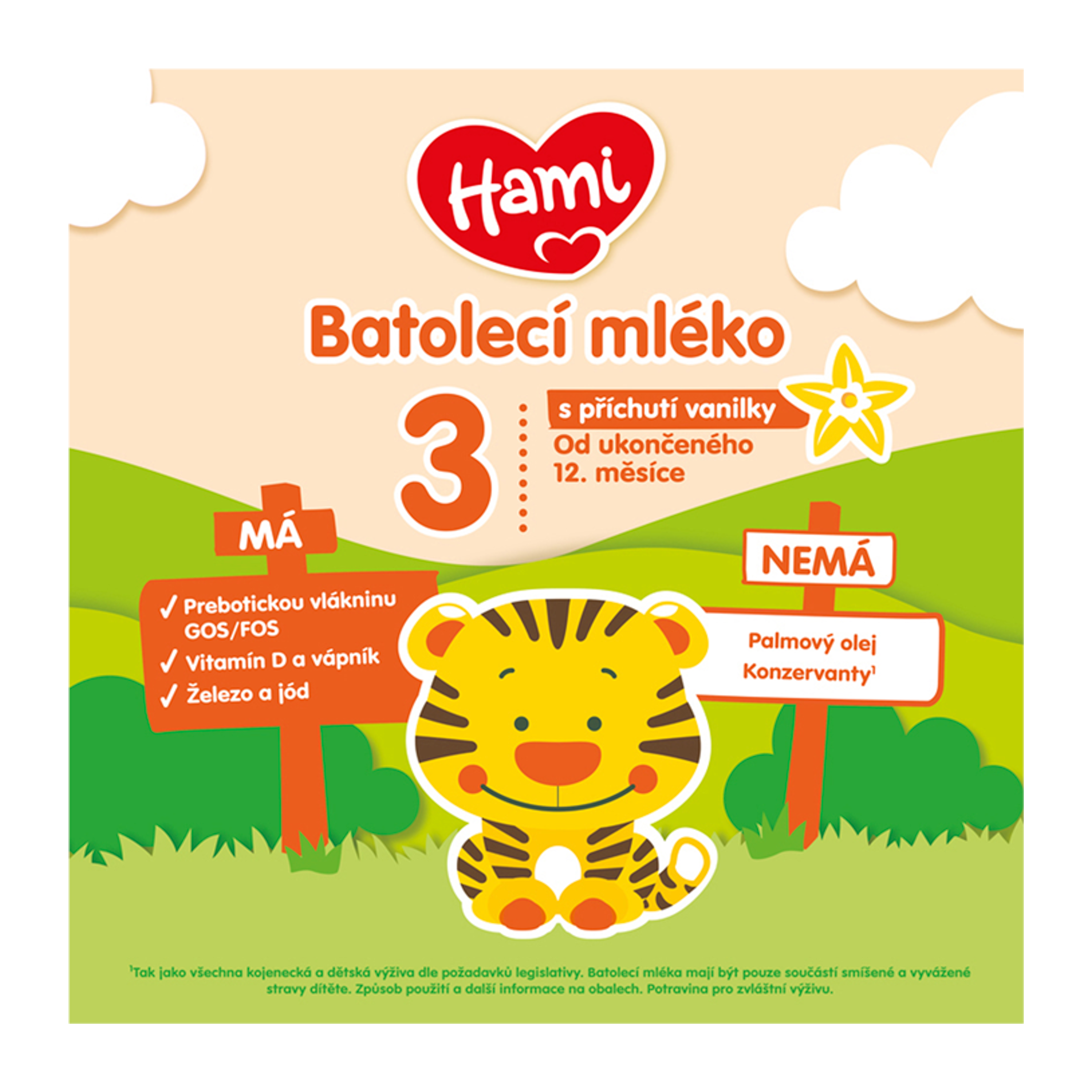 Hami 3 s vanilkovou příchutí je určené pro výživu dětí od 1 roku jako součást smíšené a vyvážené stravy dítěte, není náhradou mateřského mléka. Kojení je pro dítě to nejlepší. Vyvarujte se dlouhému kontaktu mléčné výživy se zoubky - zvyšuje riziko výskytu zubního kazu. Pečujte pravidelně o zoubky dítěte, zejména před spaním. Požádejte o radu zubního lékaře. Pro zdraví dítěte je důležité dodržovat návod na přípravu a uvedená doporučení. Hami 3 s vanilkovou příchutí není určeno pro výživu kojenců do 1 roku věku. Podporujeme doporučení WHO - plné kojení v prvních 6 měsících věku a pokračování až do 2 let věku a dále, spolu se zaváděním bezpečné a vhodné doplňkové stravy.